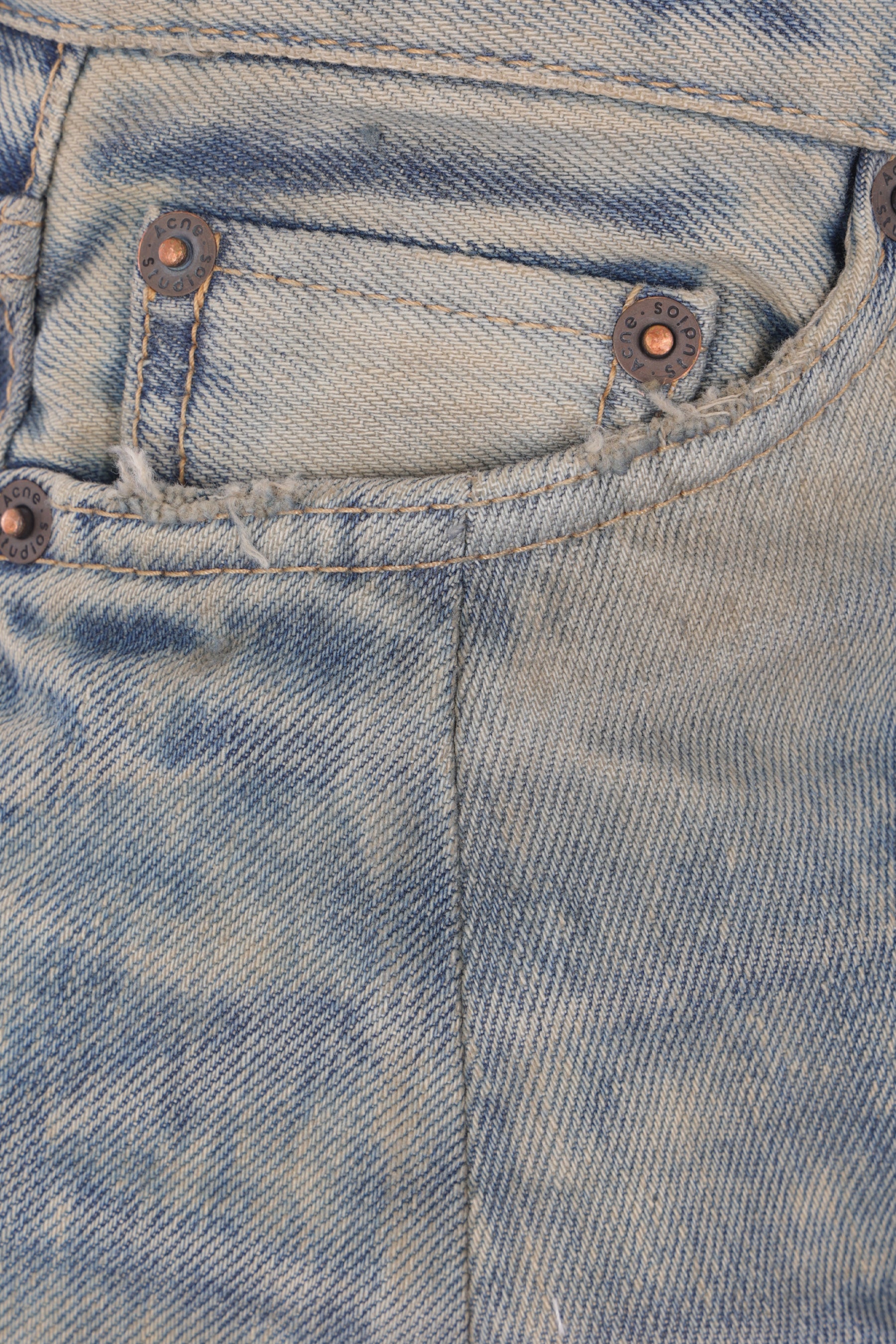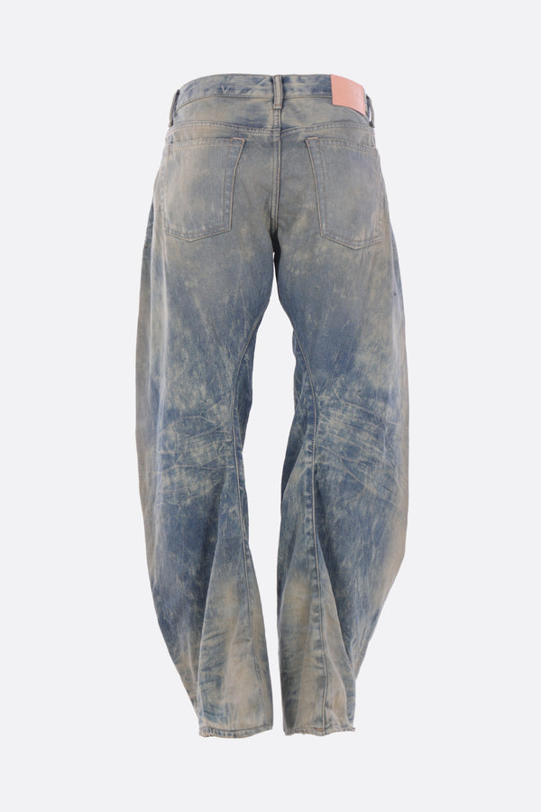 Acne Studios loose-fit jeans made of medium blue cotton denim with a distressed and washed-out effect. Features a front button closure, belt loops, five classic pockets, and a leather logo patch on the back.