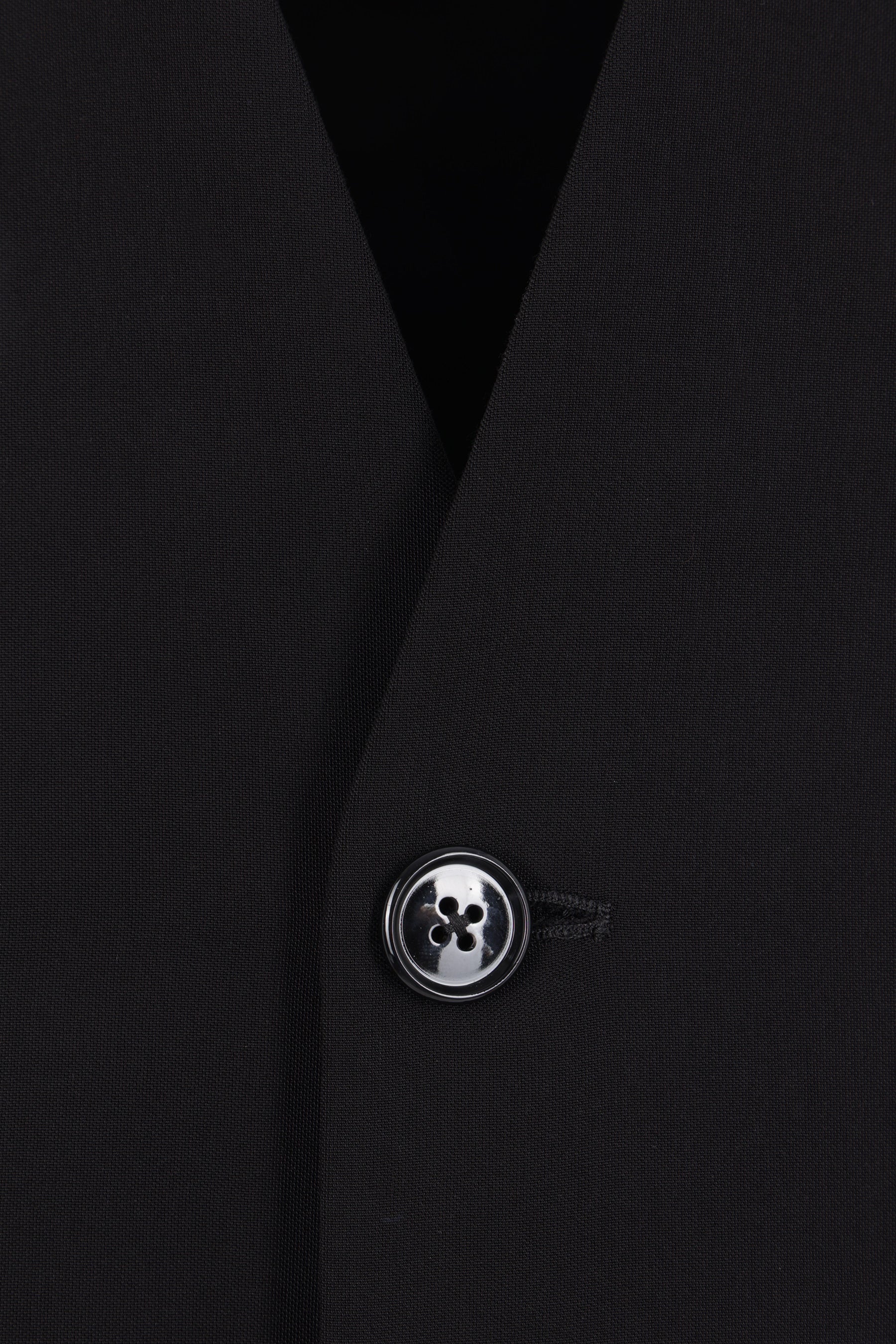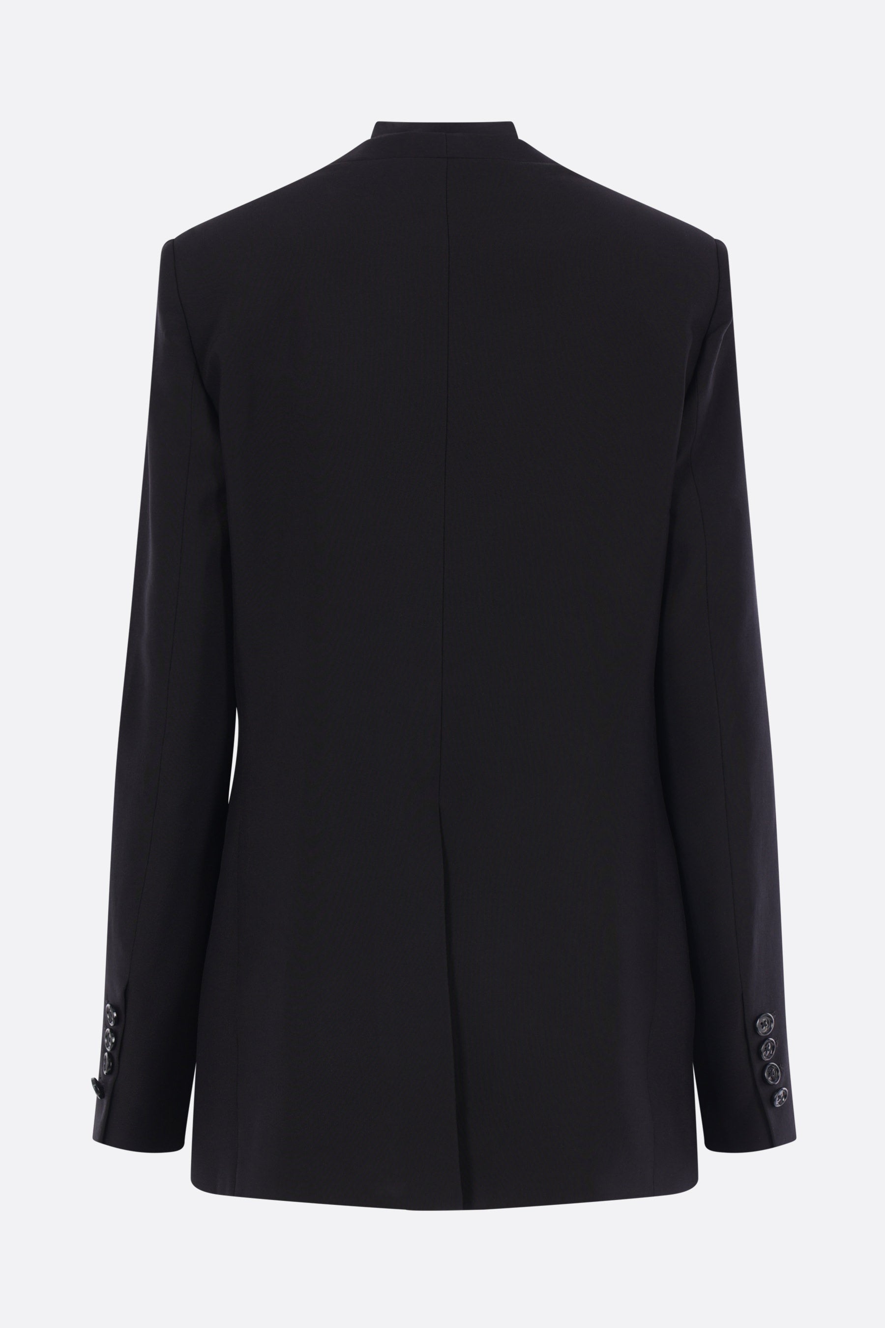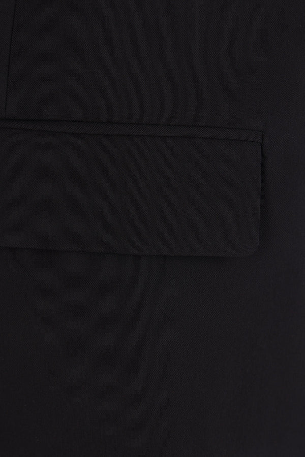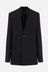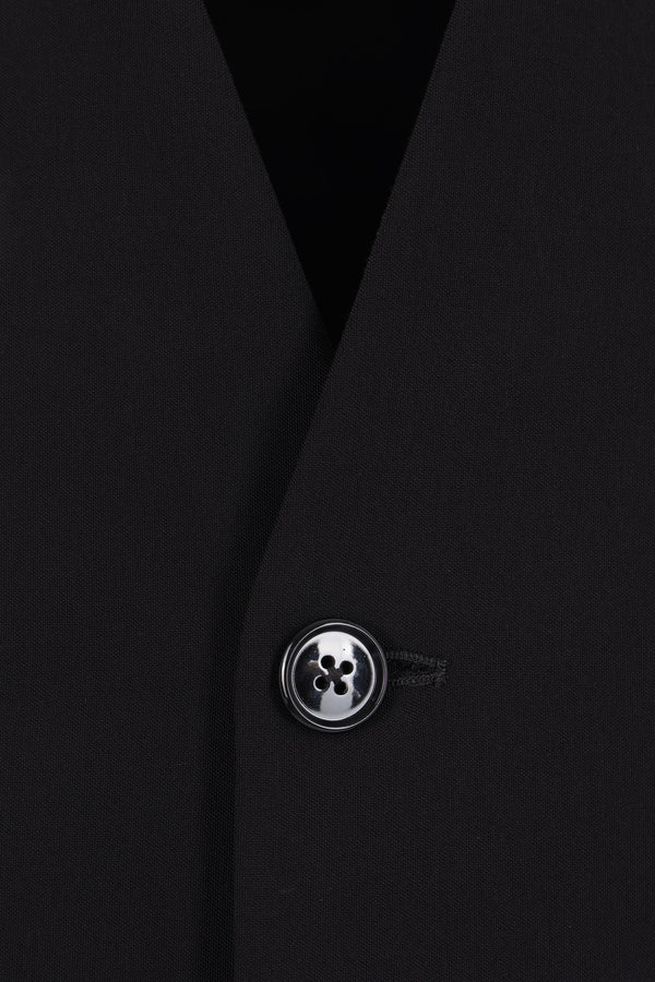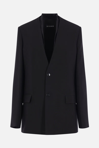 Ann Demeulemeester single-breasted jacket crafted from black viscose. Features a V-neckline with tone-on-tone satin trim, front button closure, flap pockets, padded shoulders, long sleeves with buttoned cuffs, a central back vent, and a fully lined interior.