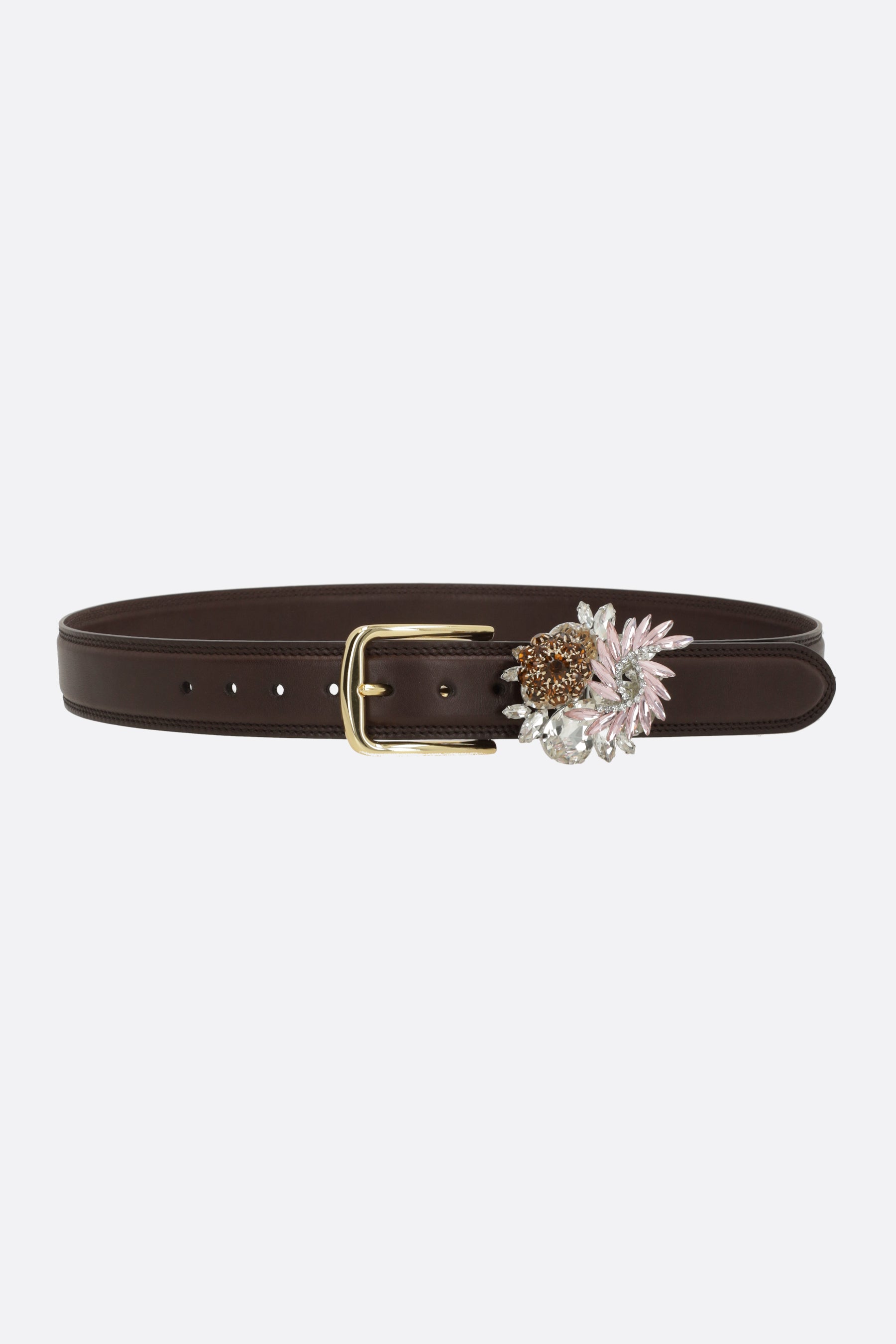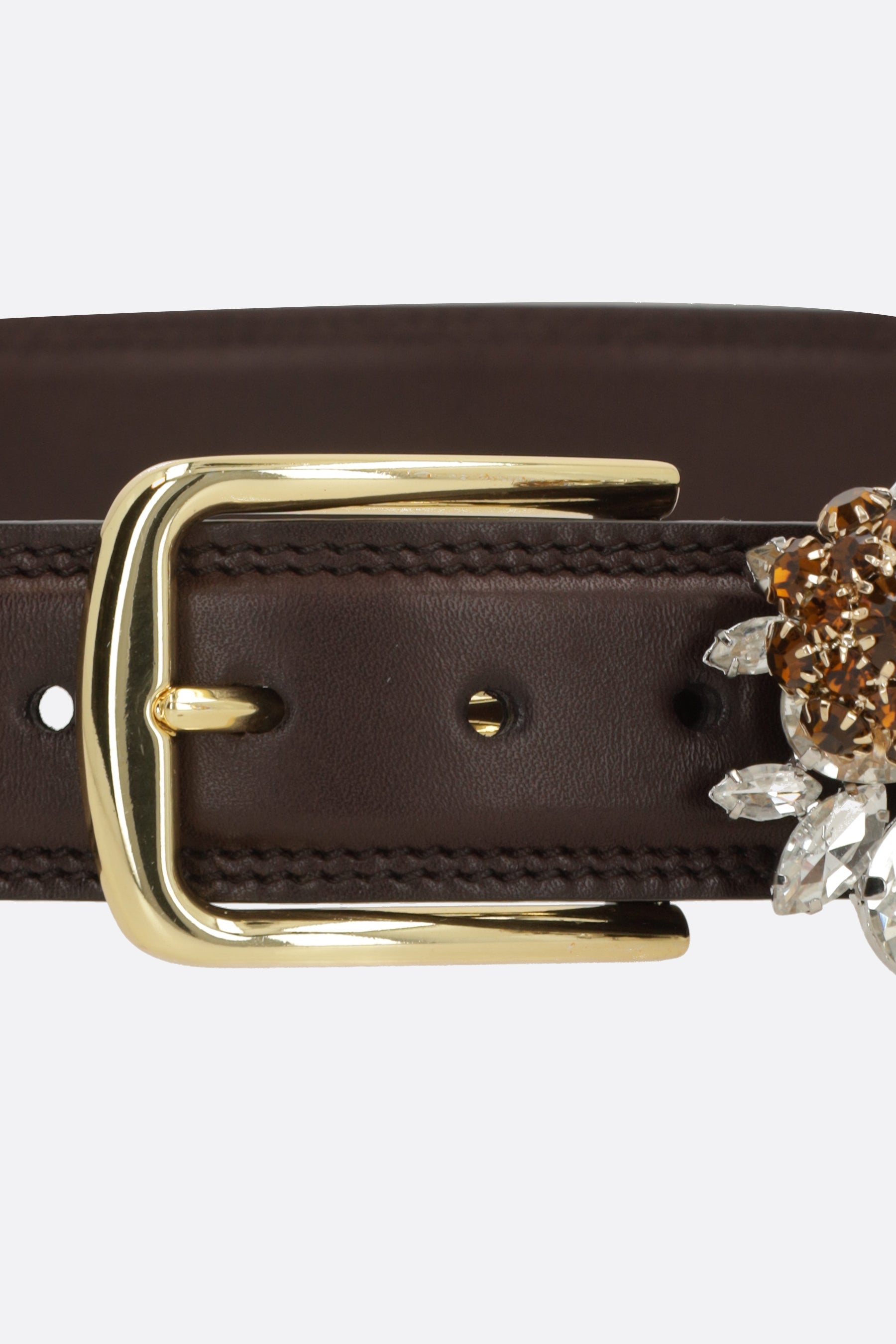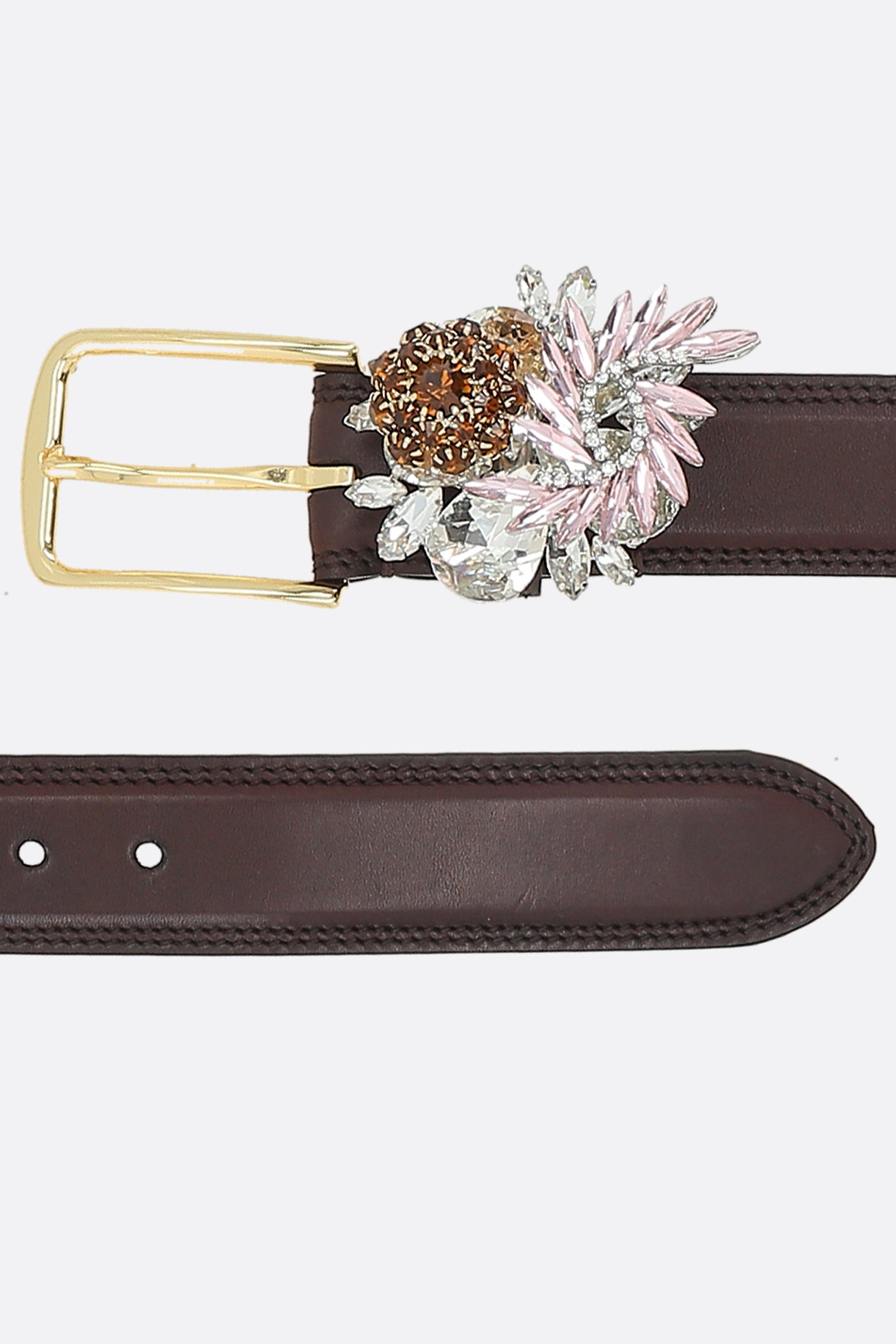 Belt by August Barron made of smooth brown leather with a crystal buckle. Featuring gold-tone hardware and adjustable closure.