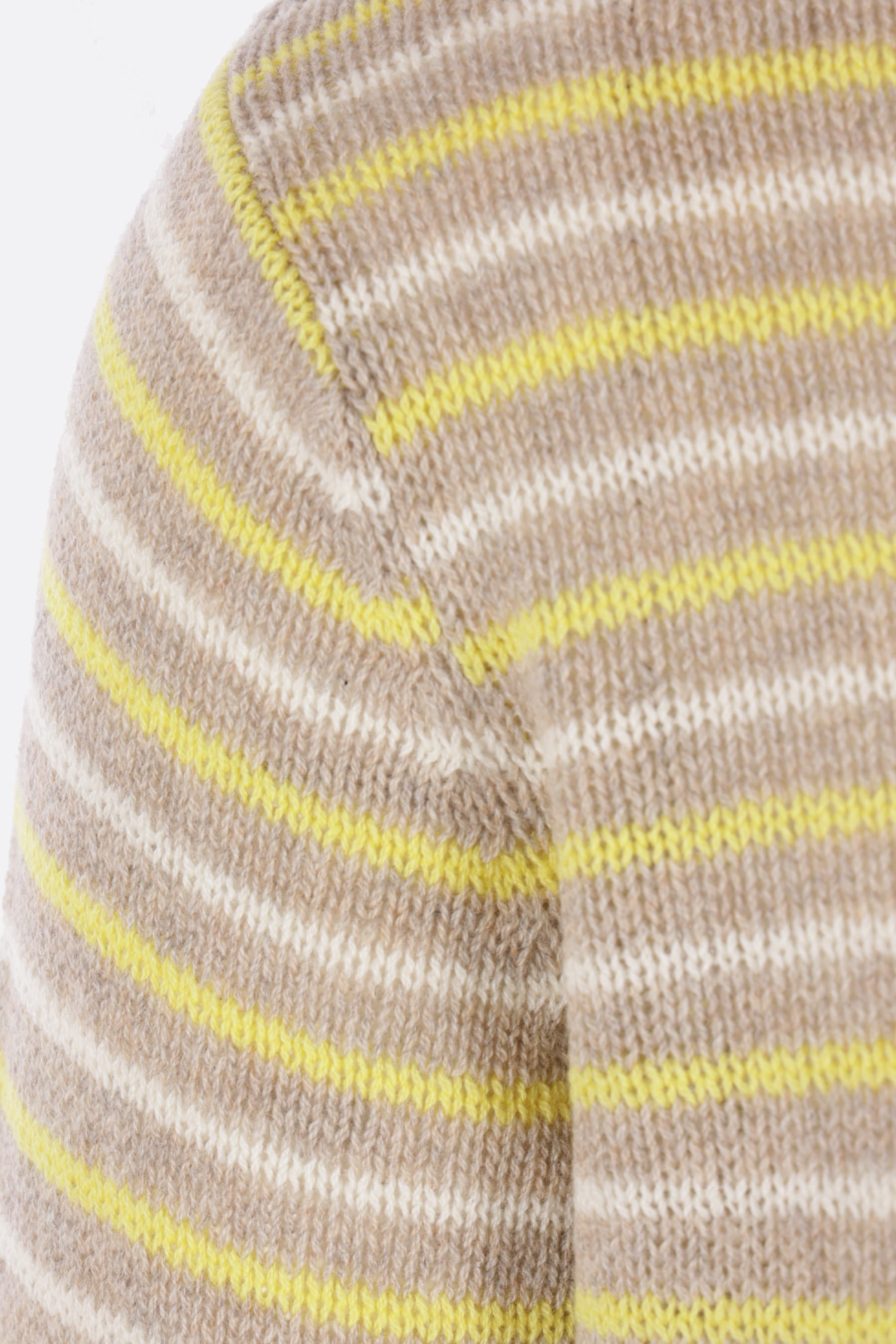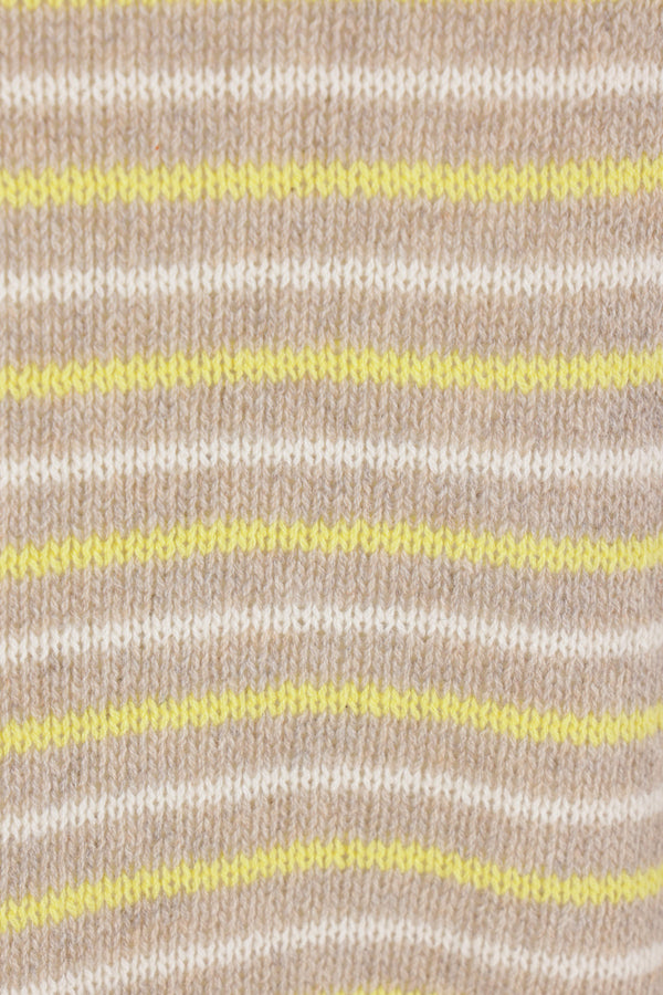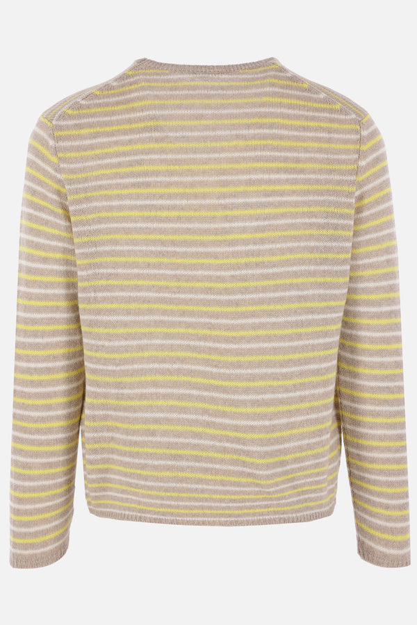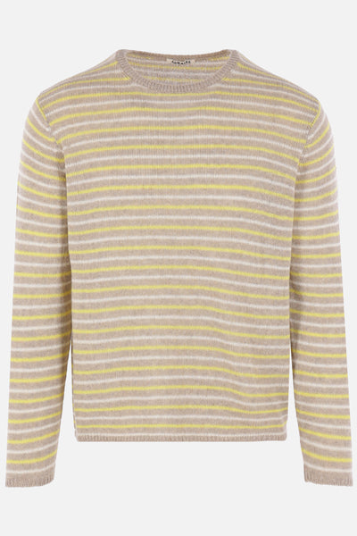 Auralee sweater crafted from striped cashmere knit in shades of beige, yellow, and white. Features a crew neckline, long sleeves, and ribbed edges.