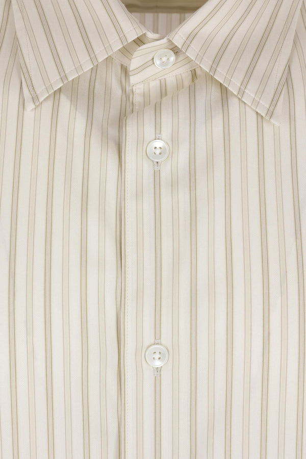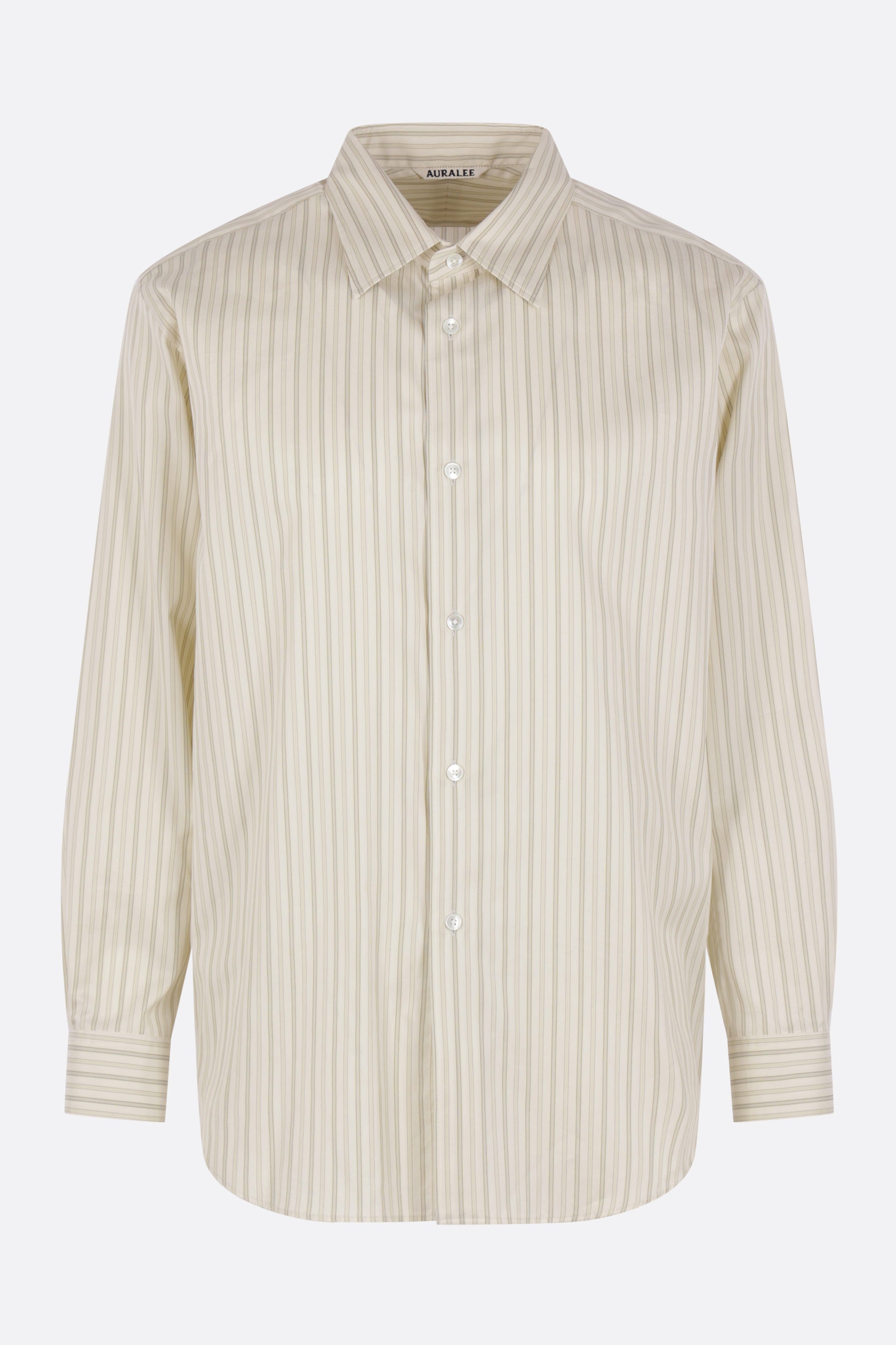 Auralee shirt crafted from ivory and green striped cotton and silk. Featuring a classic collar, front button closure, long sleeves with buttoned cuffs, and a rounded hem.