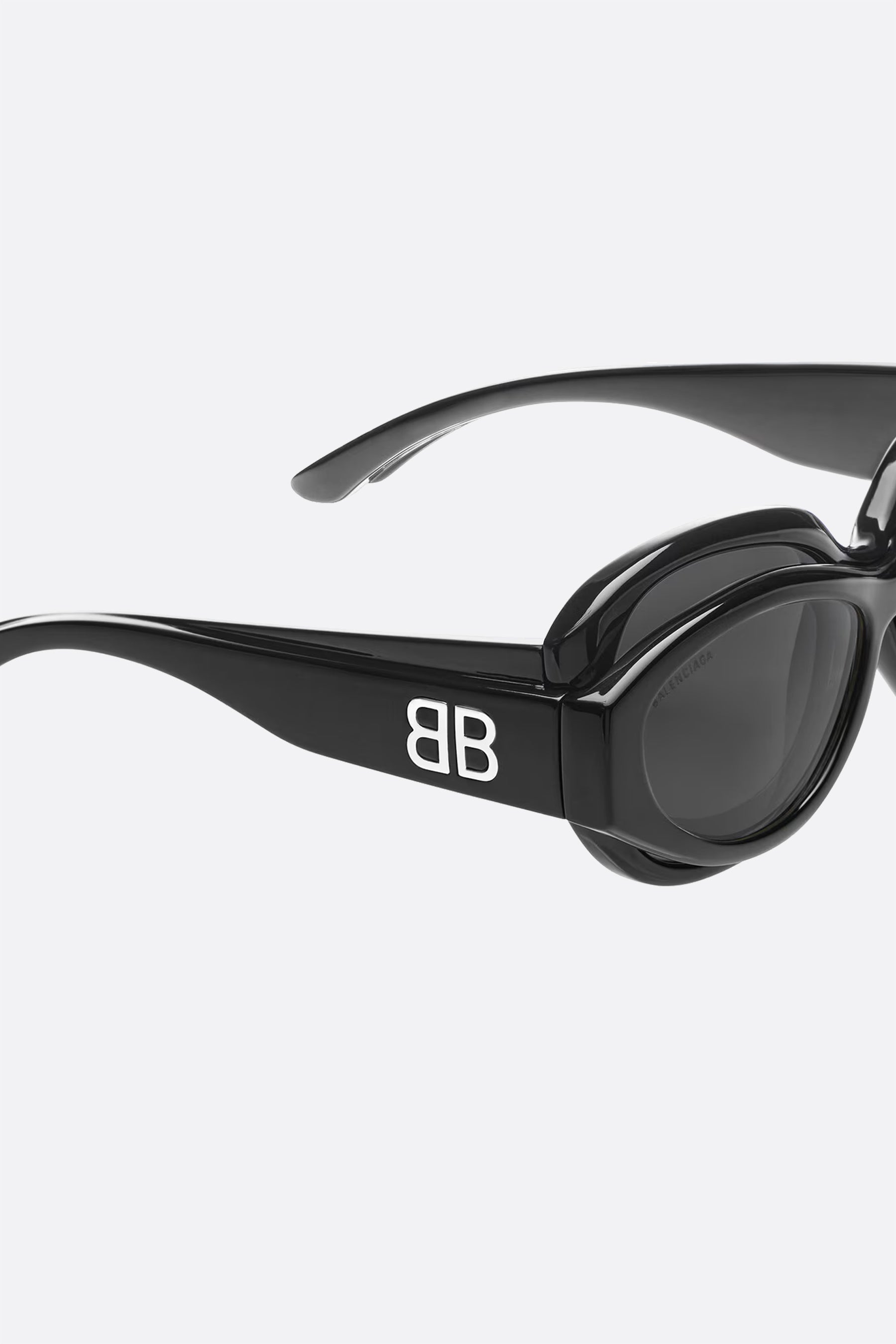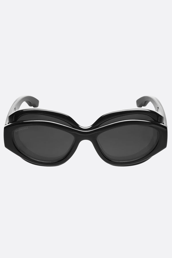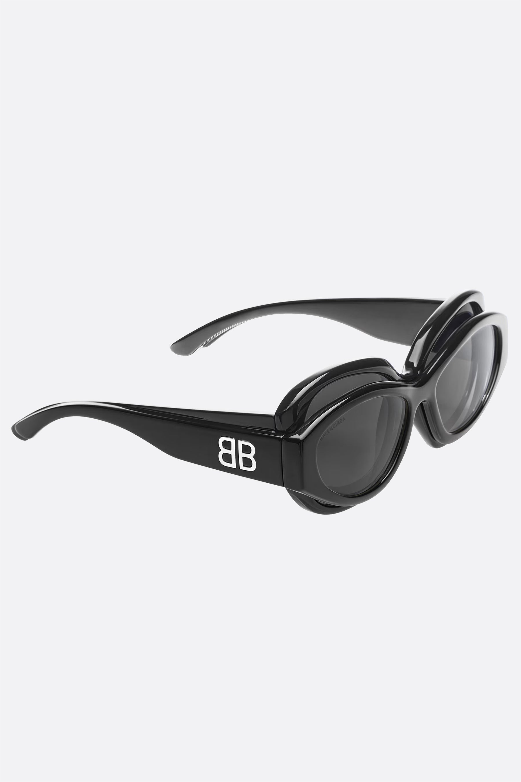 Balenciaga sunglasses crafted from natural origin injected nylon. Featuring a double sunglasses effect with four lenses, shiny silver BB logo metal plaques on both temples, and laser-engraved logo on the right lens.
