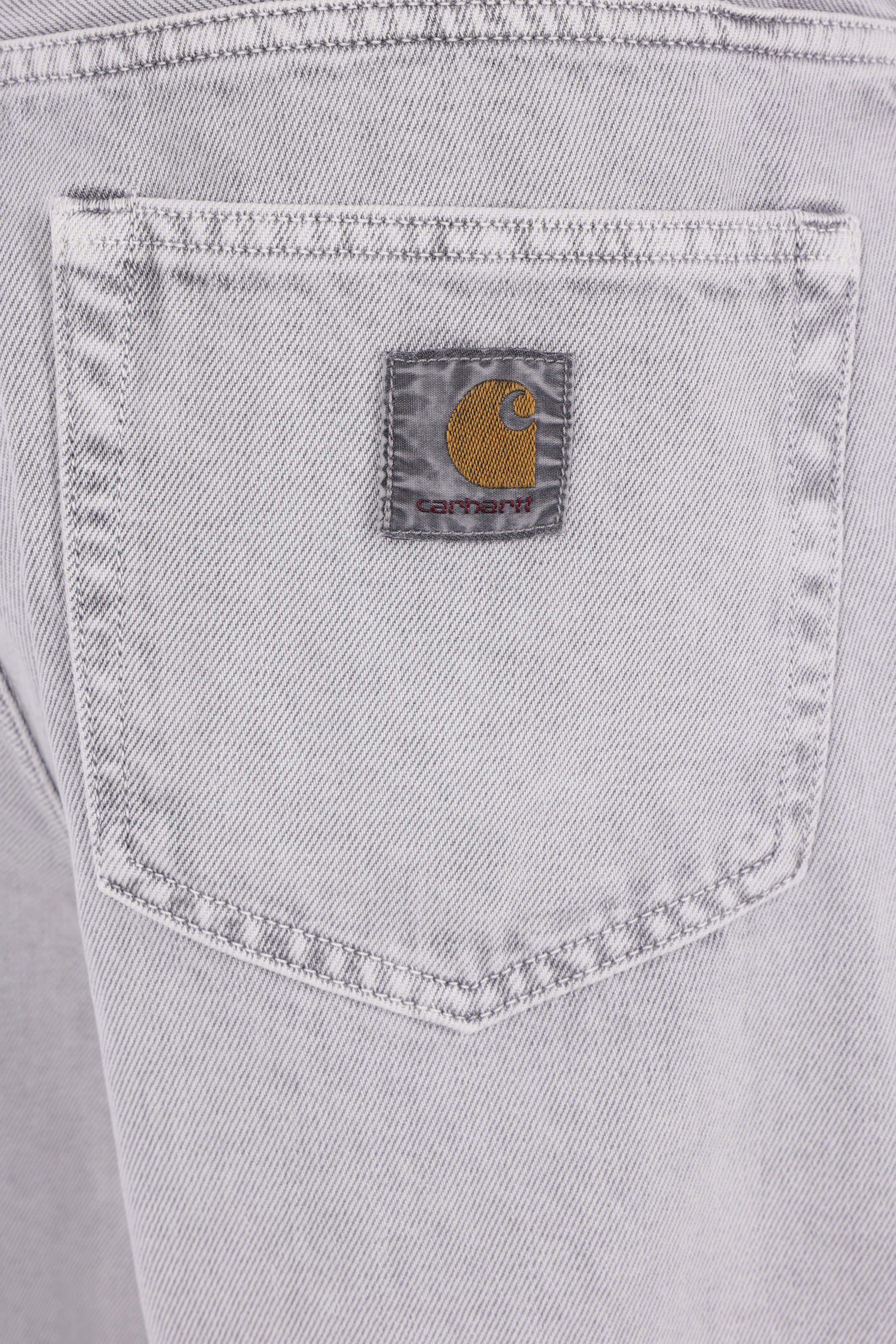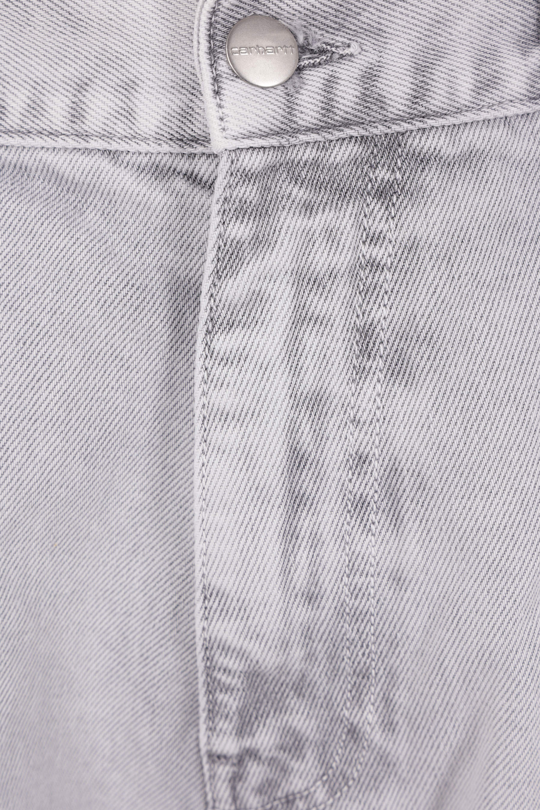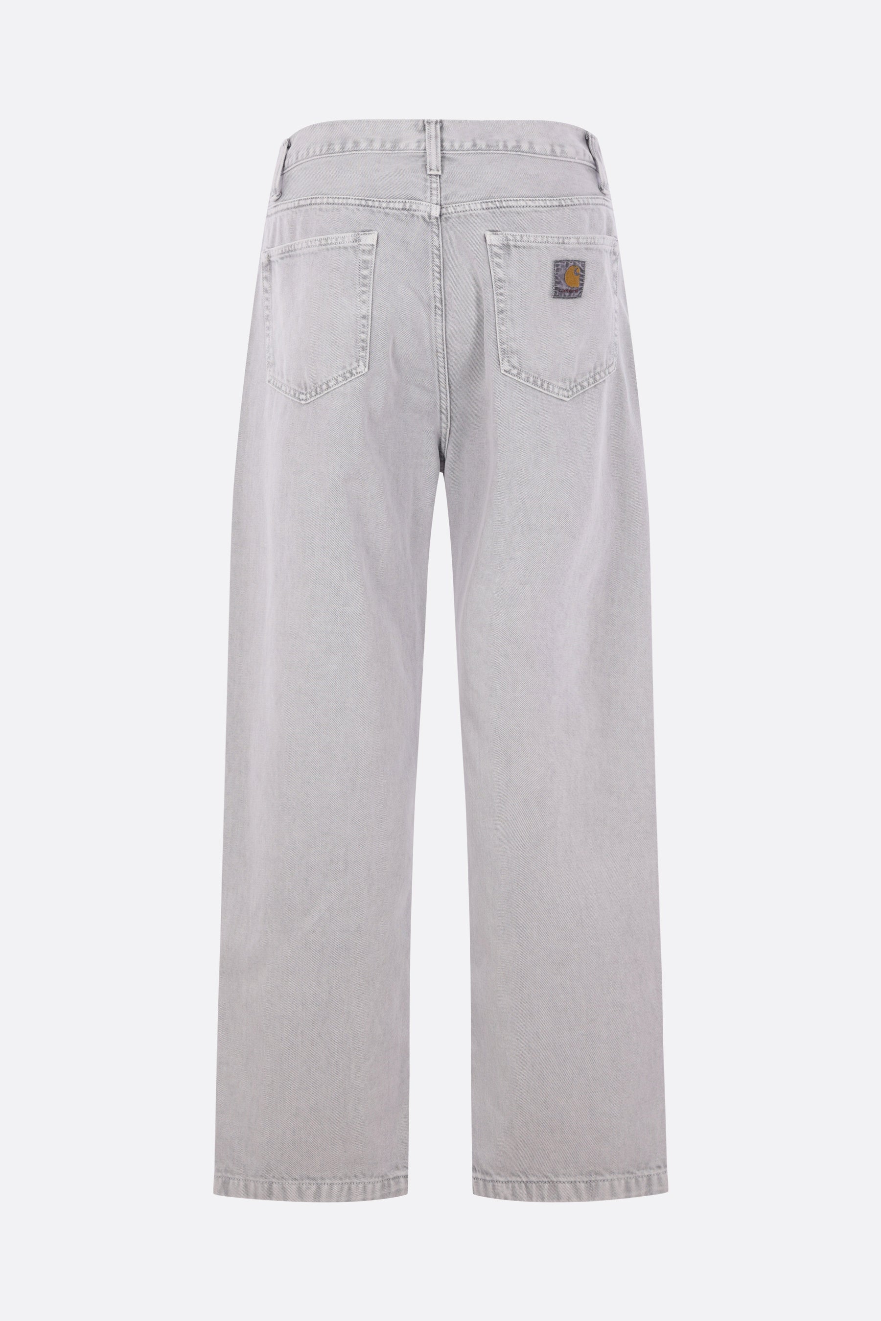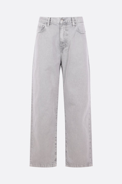 Carhartt WIP loose jeans made from grey cotton denim. Featuring front metal button-and-zip closure, belt loops, classic five-pocket design, and a logo patch on the back pocket.