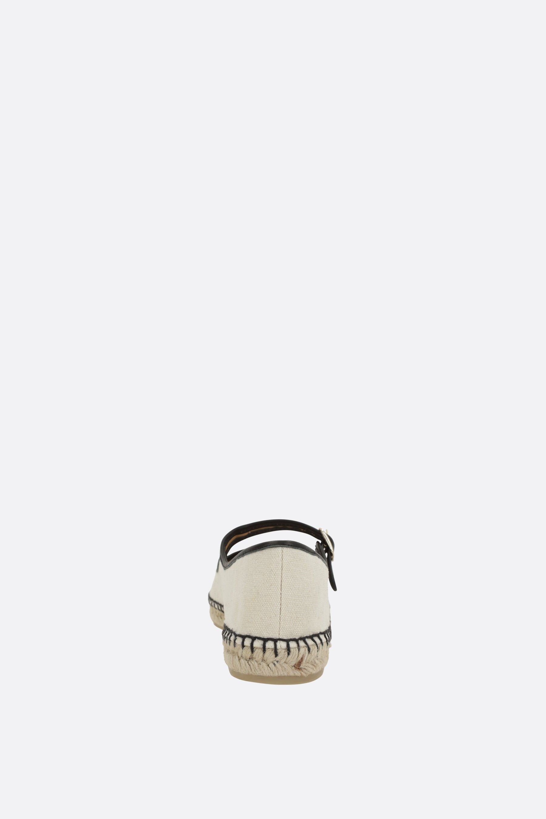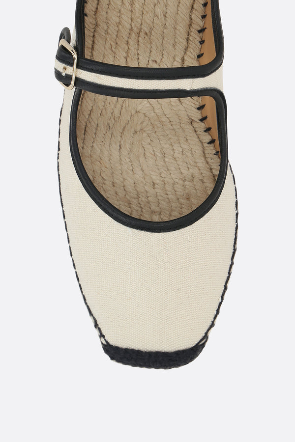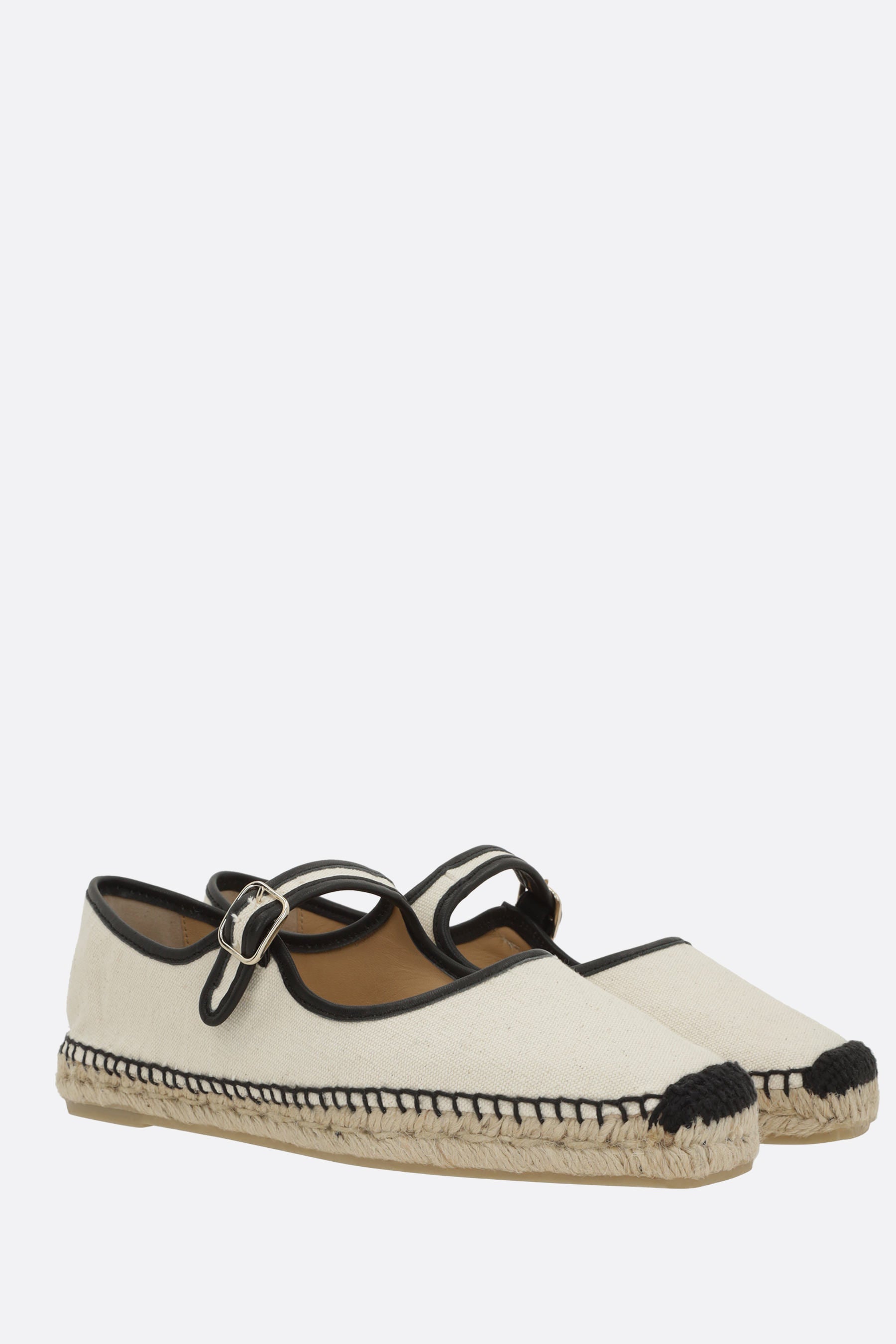 Castañer mary-jane espadrilles crafted from natural canvas with contrasting black leather trim. Featuring a slightly squared toe, front strap with metal buckle, fabric lining, and a rubber sole with a jute-wrapped edge.