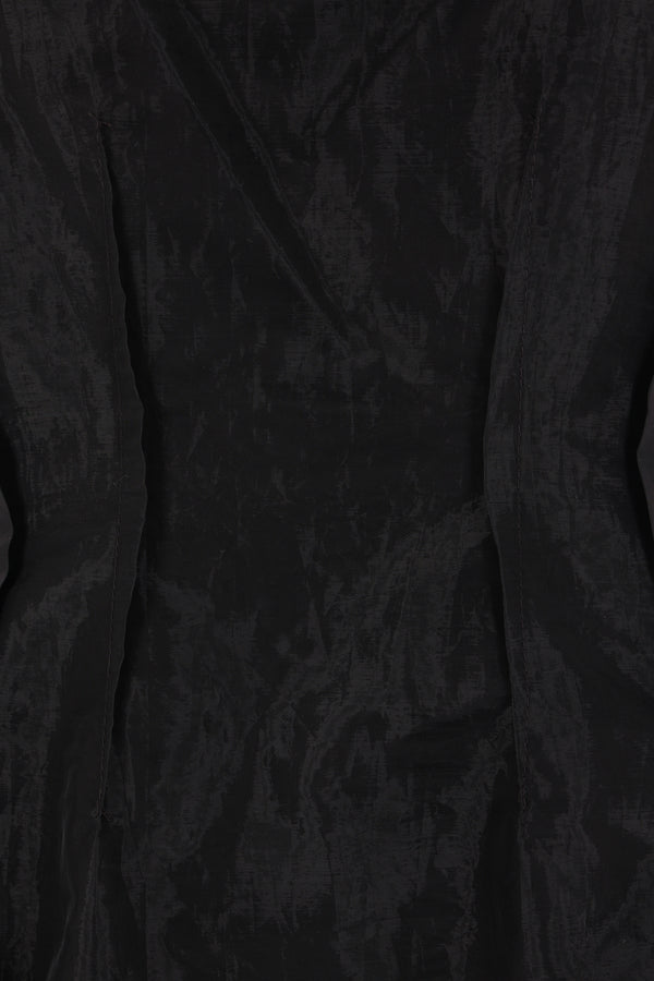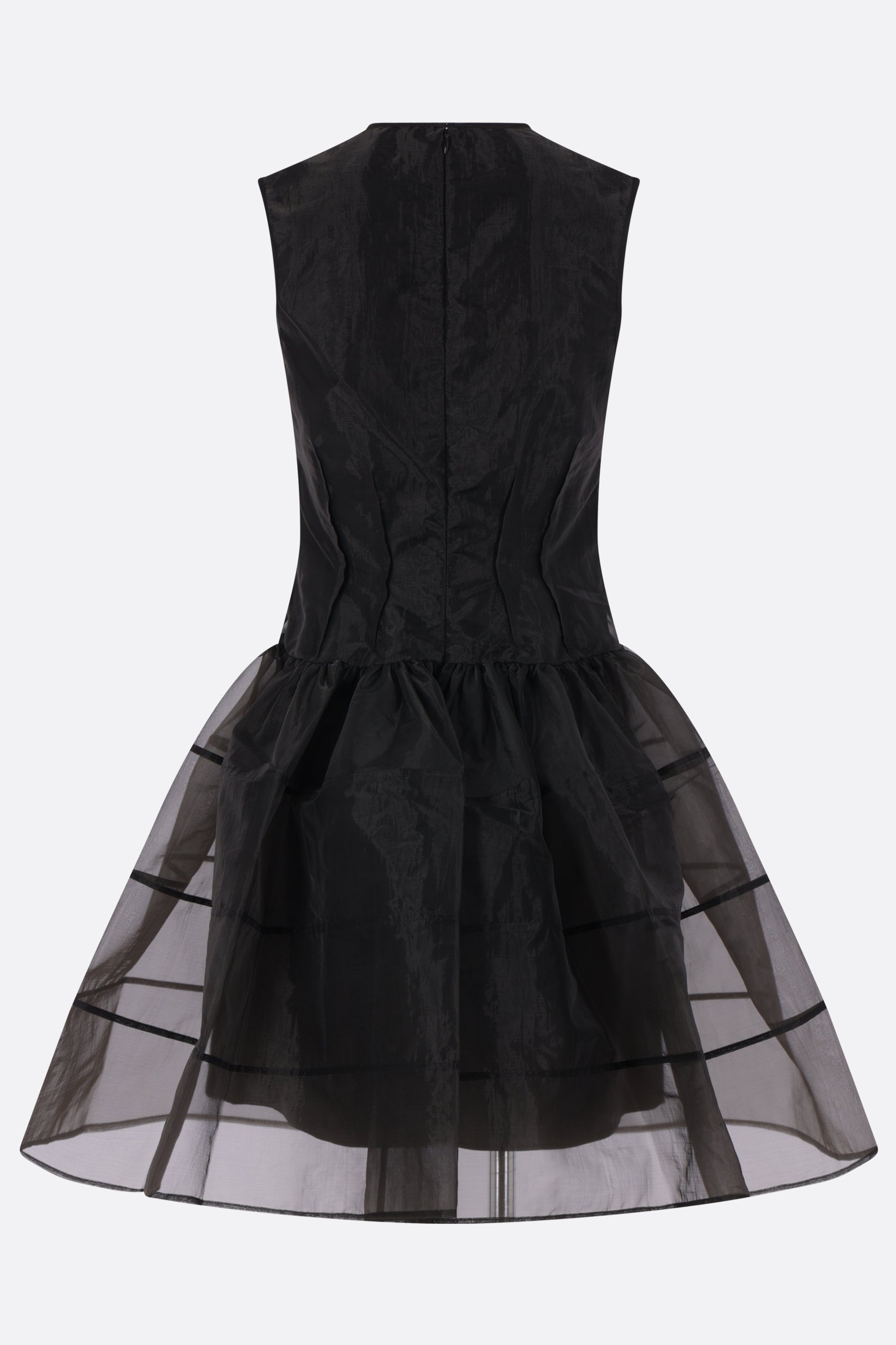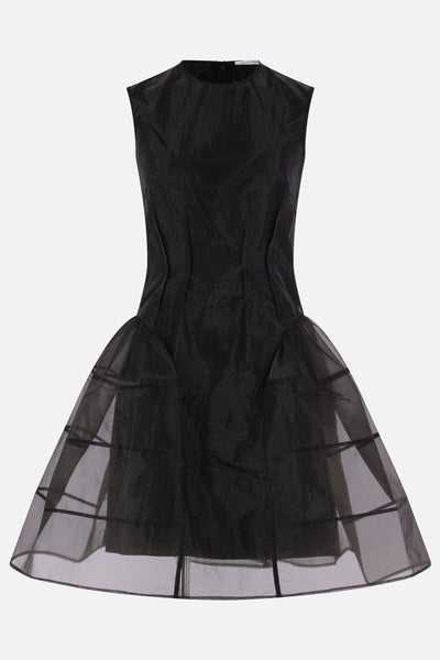 Cecilie Bahnsen sleeveless mini dress crafted from black Liquid Myrtia. Features a round neckline, invisible back zip closure, stitched pleats at the waist, flared skirt with geometric seams, and a fully lined interior.