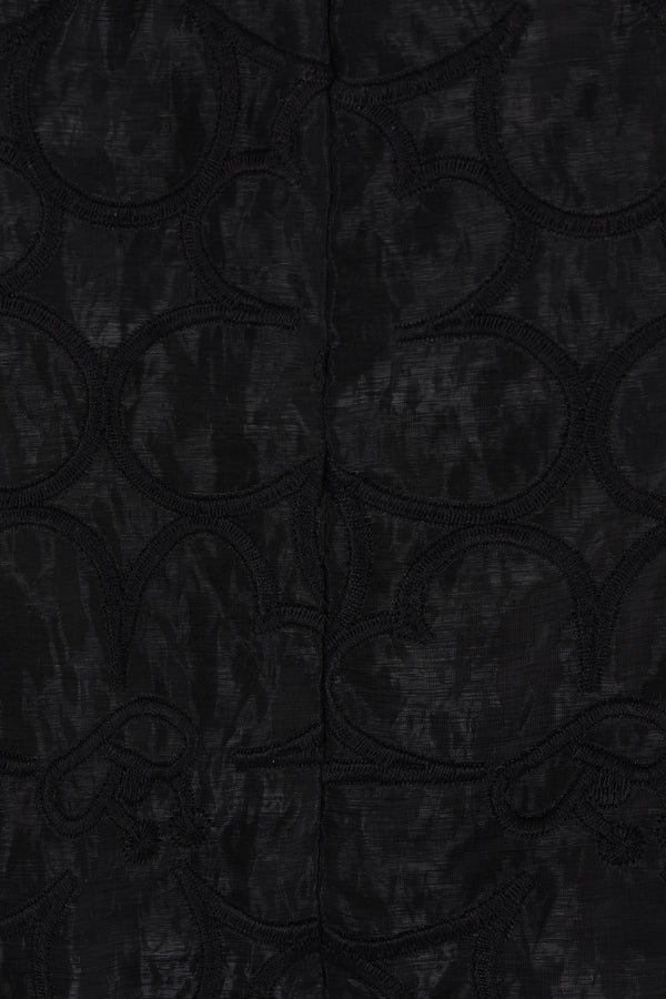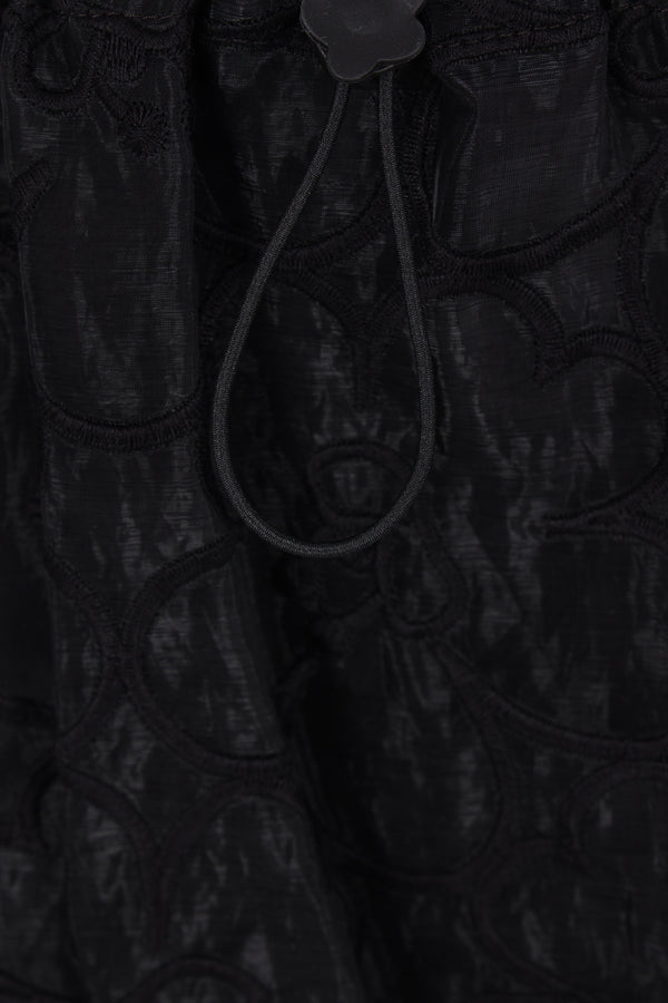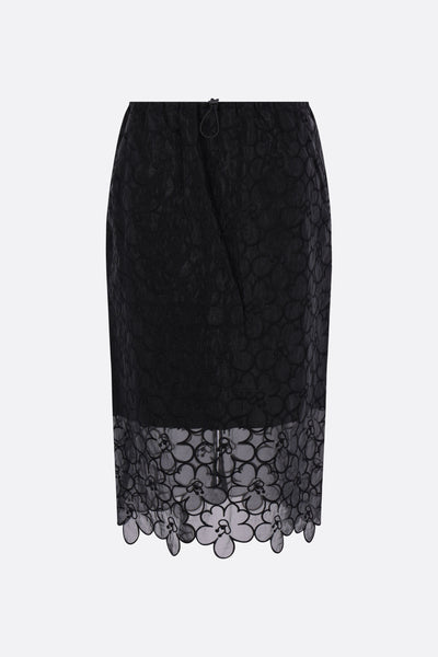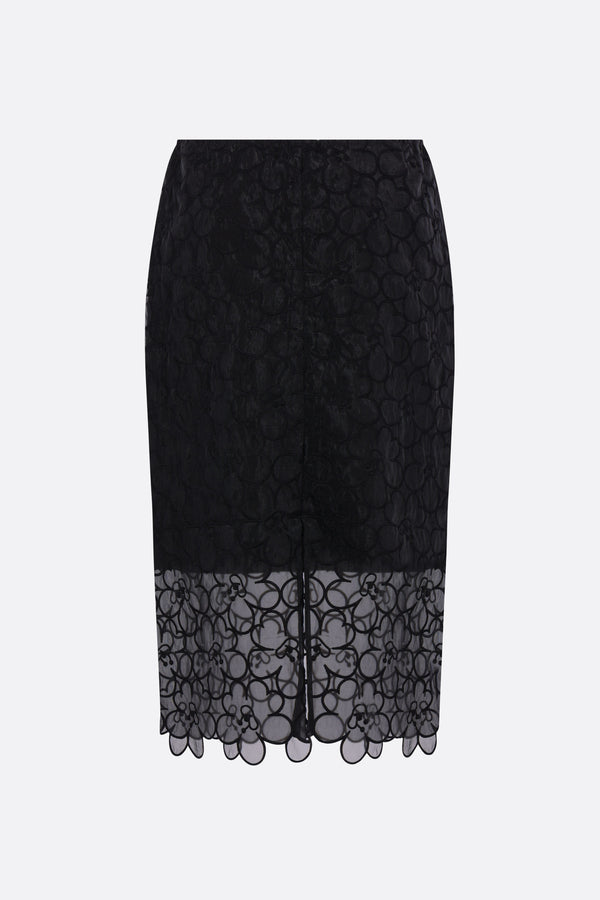 Cecilie Bahnsen pencil skirt in black organza with all-over Felicia embroidery. Features an elastic drawstring waist, a central back slit, and a partially lined interior.