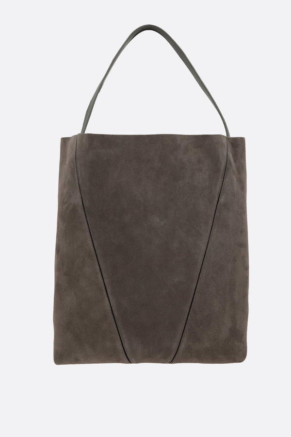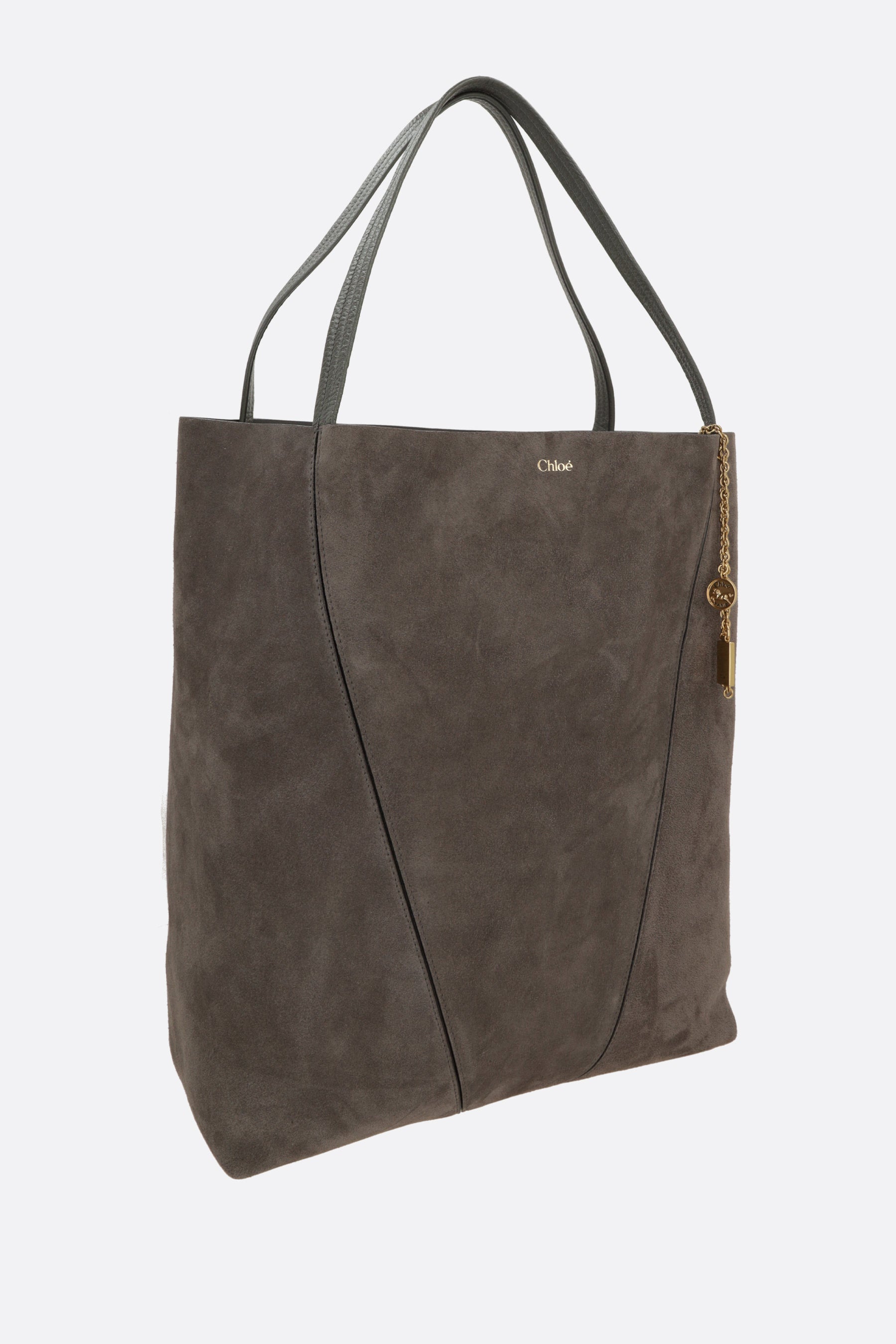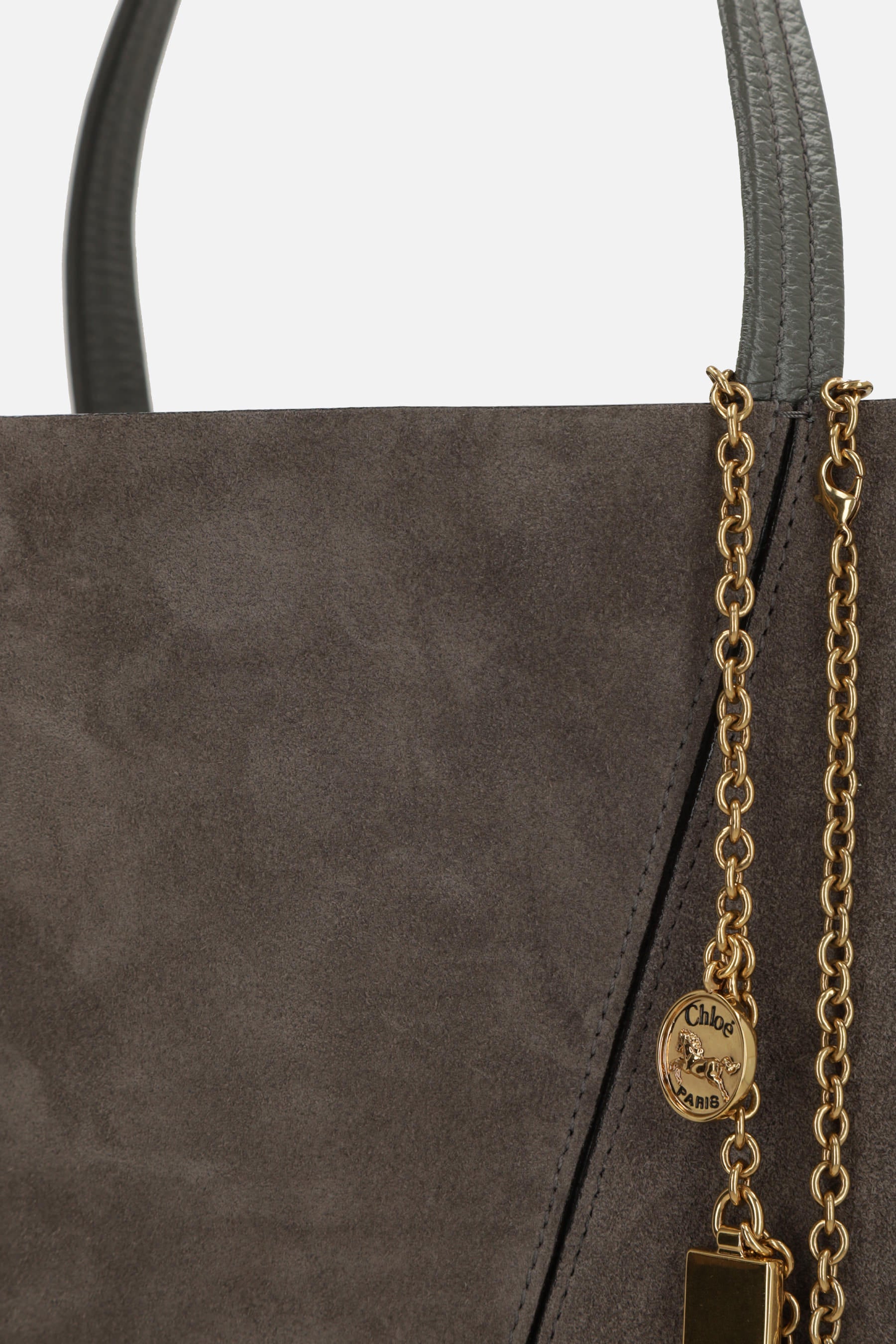 Chloé tote bag crafted from grey suede with embossed front logo lettering. Featuring gold-tone hardware, double handles, and a decorative chain with Chloé and Horse pendants. The interior is lined in tone-on-tone leather. Can be worn over the shoulder or carried by hand with the handles tucked inside the ring.