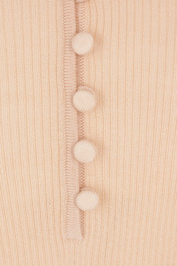 Chloé pullover made of powder pink wool knit. Features a V-neckline with tone-on-tone buttons, long sleeves, and a straight hem.