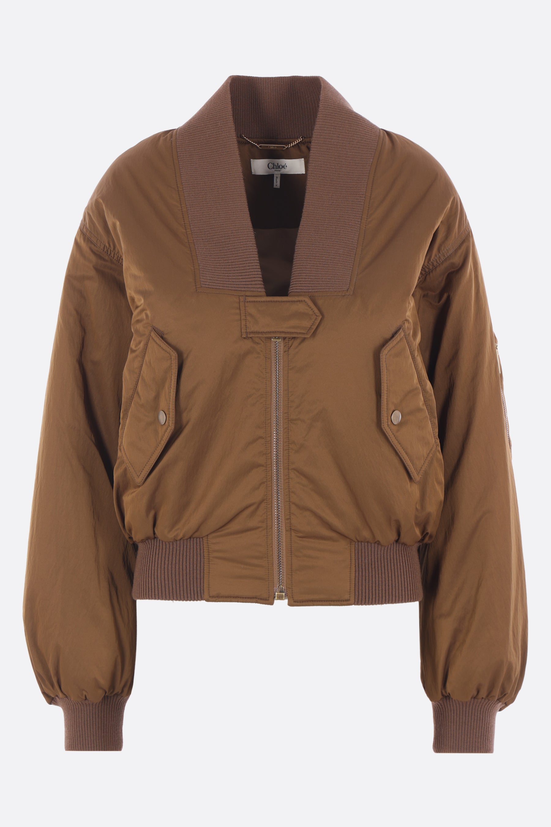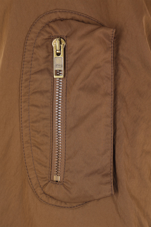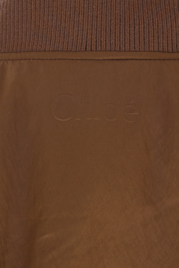 Chloé padded bomber jacket crafted from brown nylon. Featuring a V-neckline, zip closure, multiple pockets, long sleeves, ribbed knit trims, and an embossed logo at the back of the neck.
