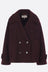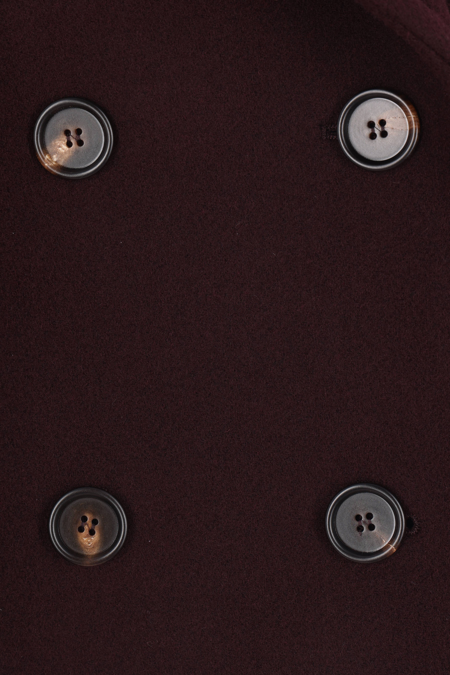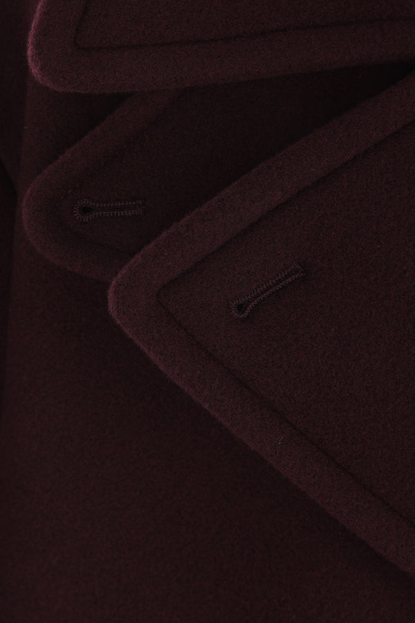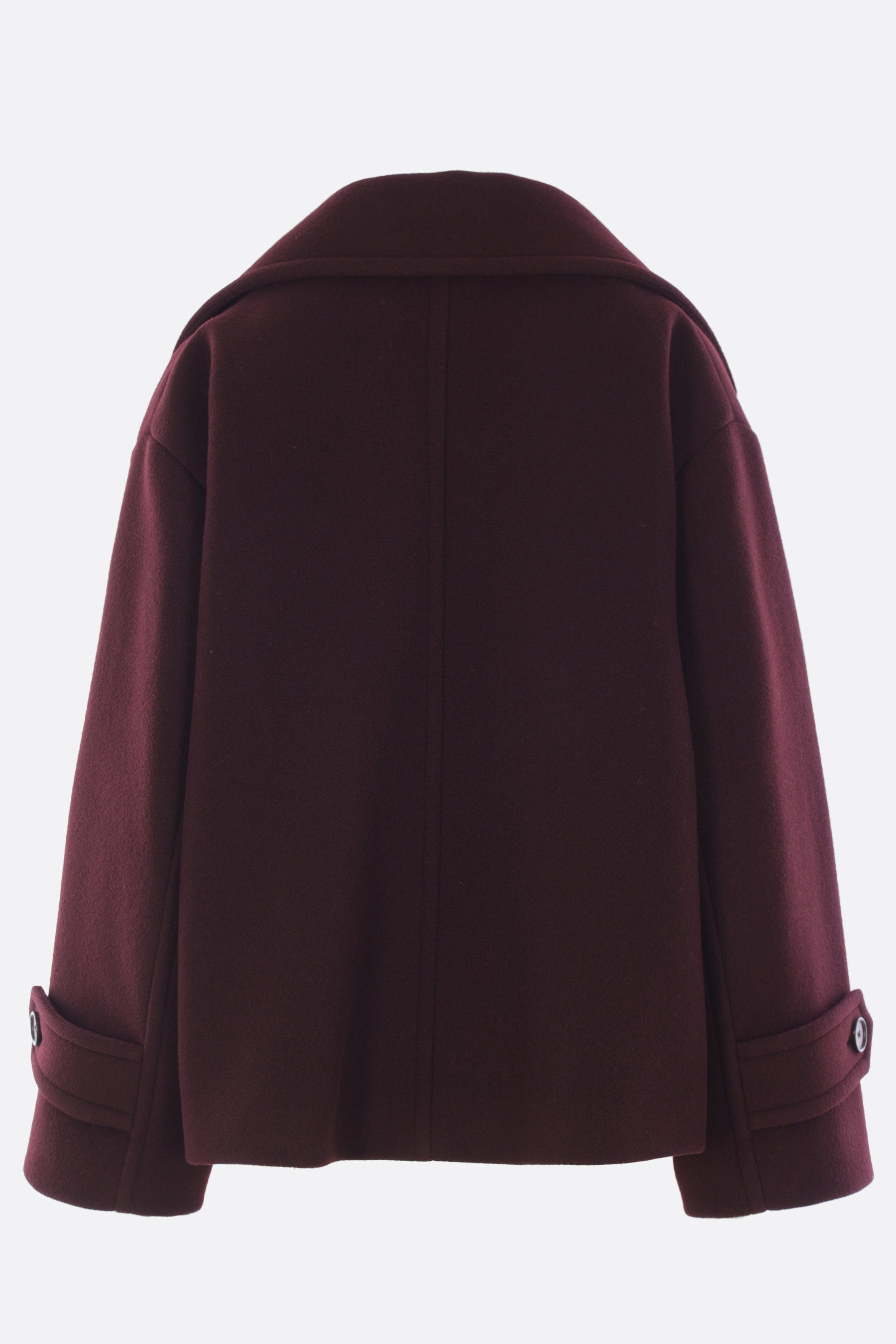 Chloé oversized short coat made of deep purple wool. Features wide lapels, front button closure, vertical pockets, long sleeves with strap details at the cuffs, and a straight hem. Fully lined.