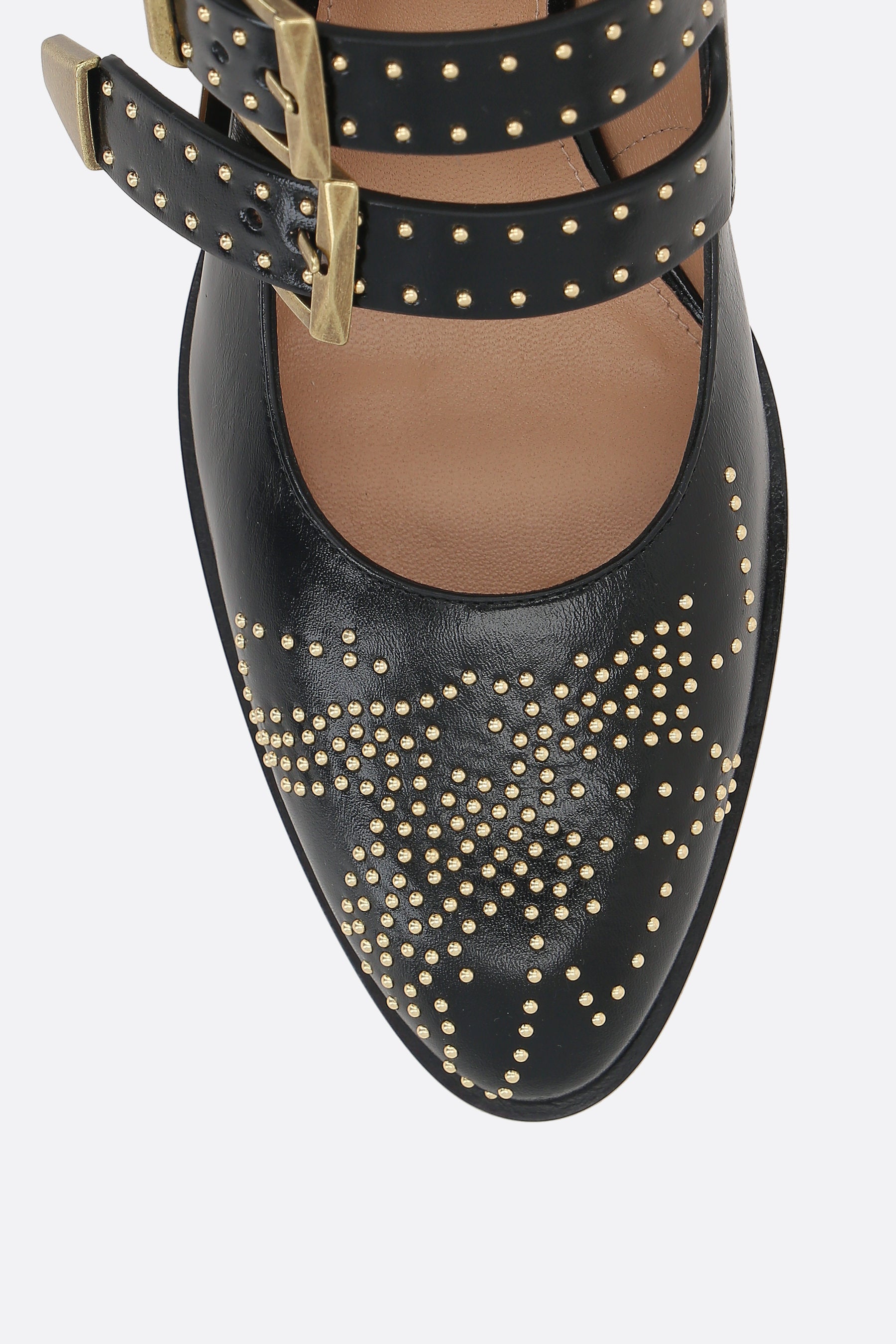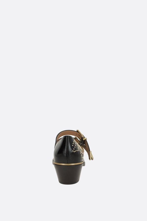 Chloé mary-jane pumps crafted from black shiny leather and adorned with metal studs. Featuring a pointed toe, adjustable side straps with metal buckles, leather lining, and leather sole. The design is completed by a wooden Cuban heel.