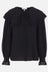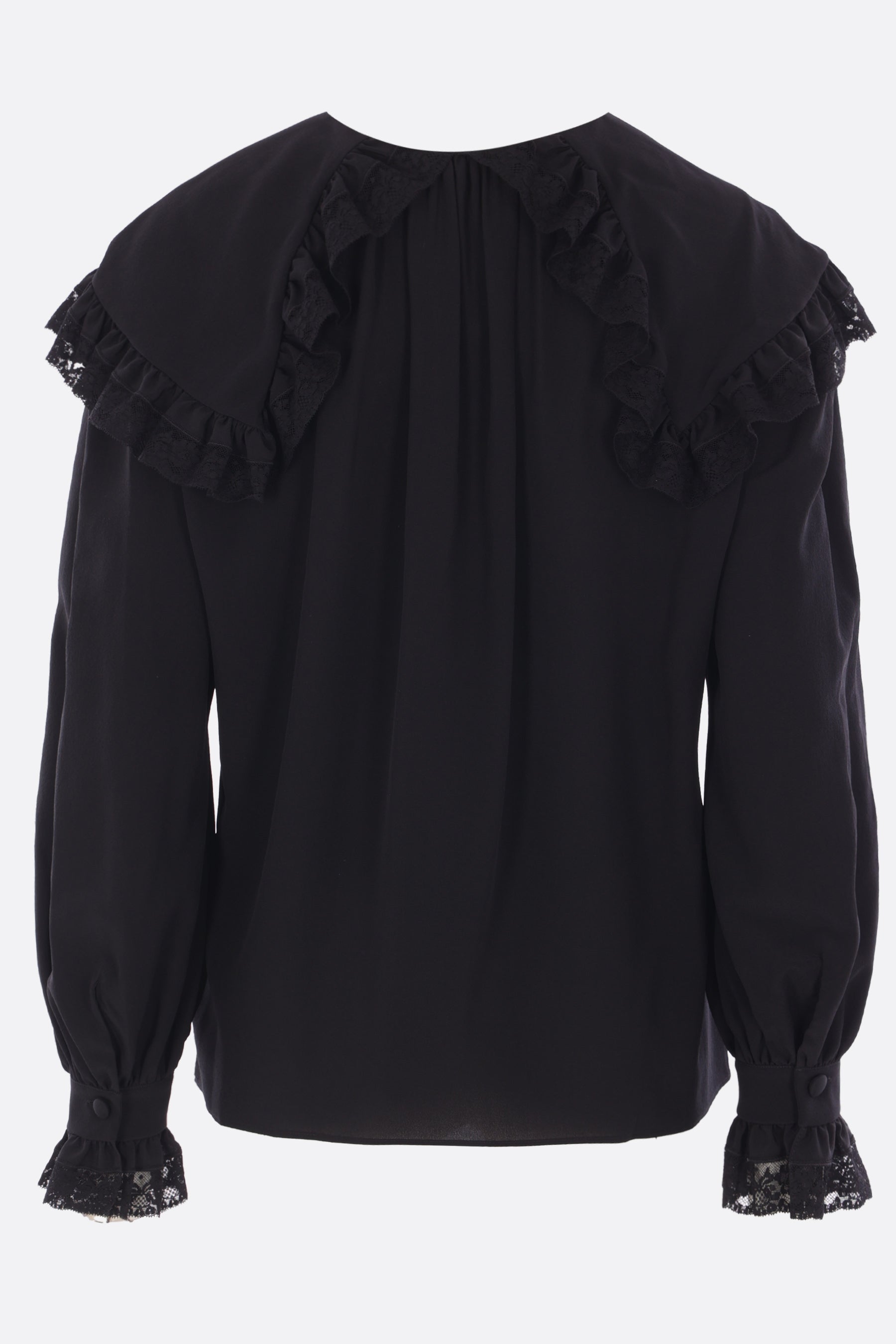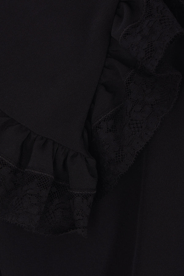 Chloé shirt made of black silk crepe. Features an oversized collar edged with lace, front button closure with tone-on-tone buttons, long sleeves with ruffled cuffs, and a straight hem.