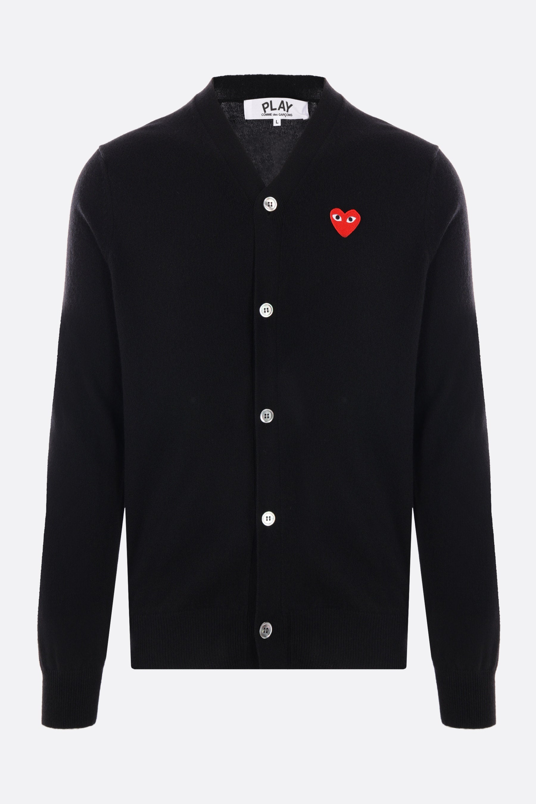 Comme des Garçons Play cardigan crafted from black wool knit, featuring the signature embroidered Heart patch on the chest. Designed with a V-neckline, front button closure, long sleeves, and ribbed trims.