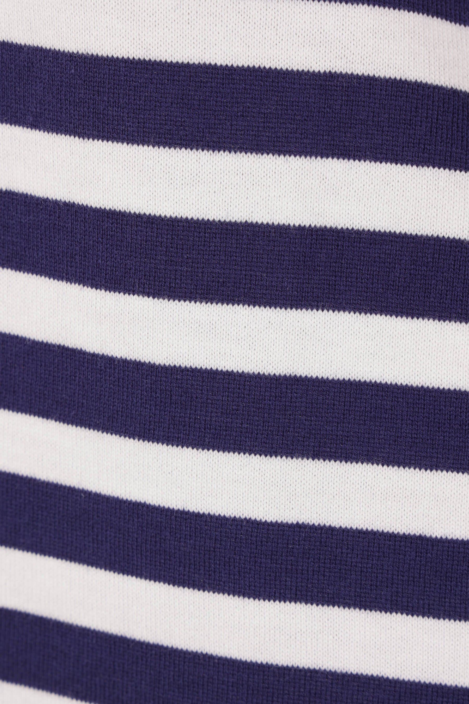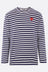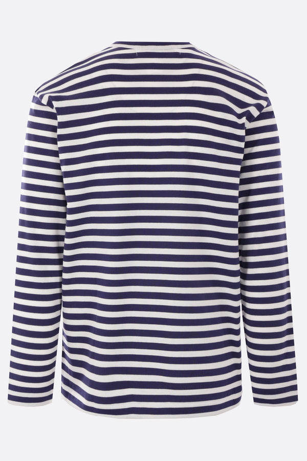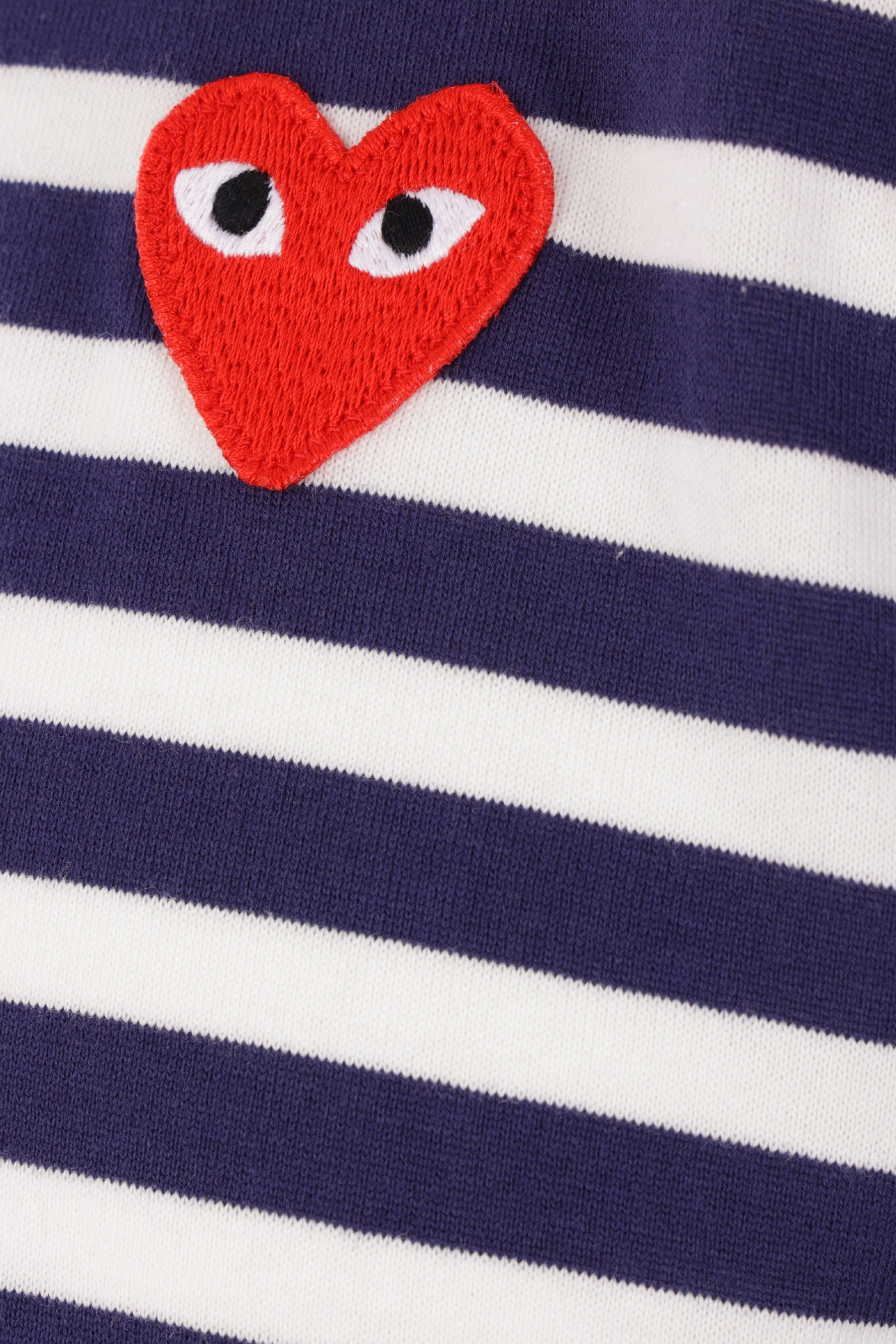 Comme des Garçons Play long-sleeve t-shirt crafted from dark blue and white striped cotton jersey, featuring the signature embroidered Heart patch on the chest. Designed with a crew neckline and a straight hem.