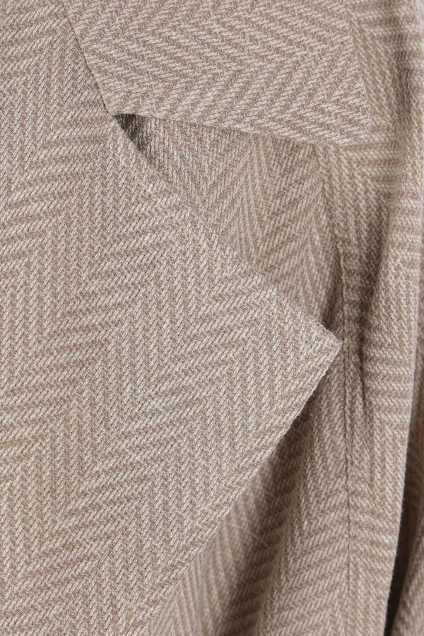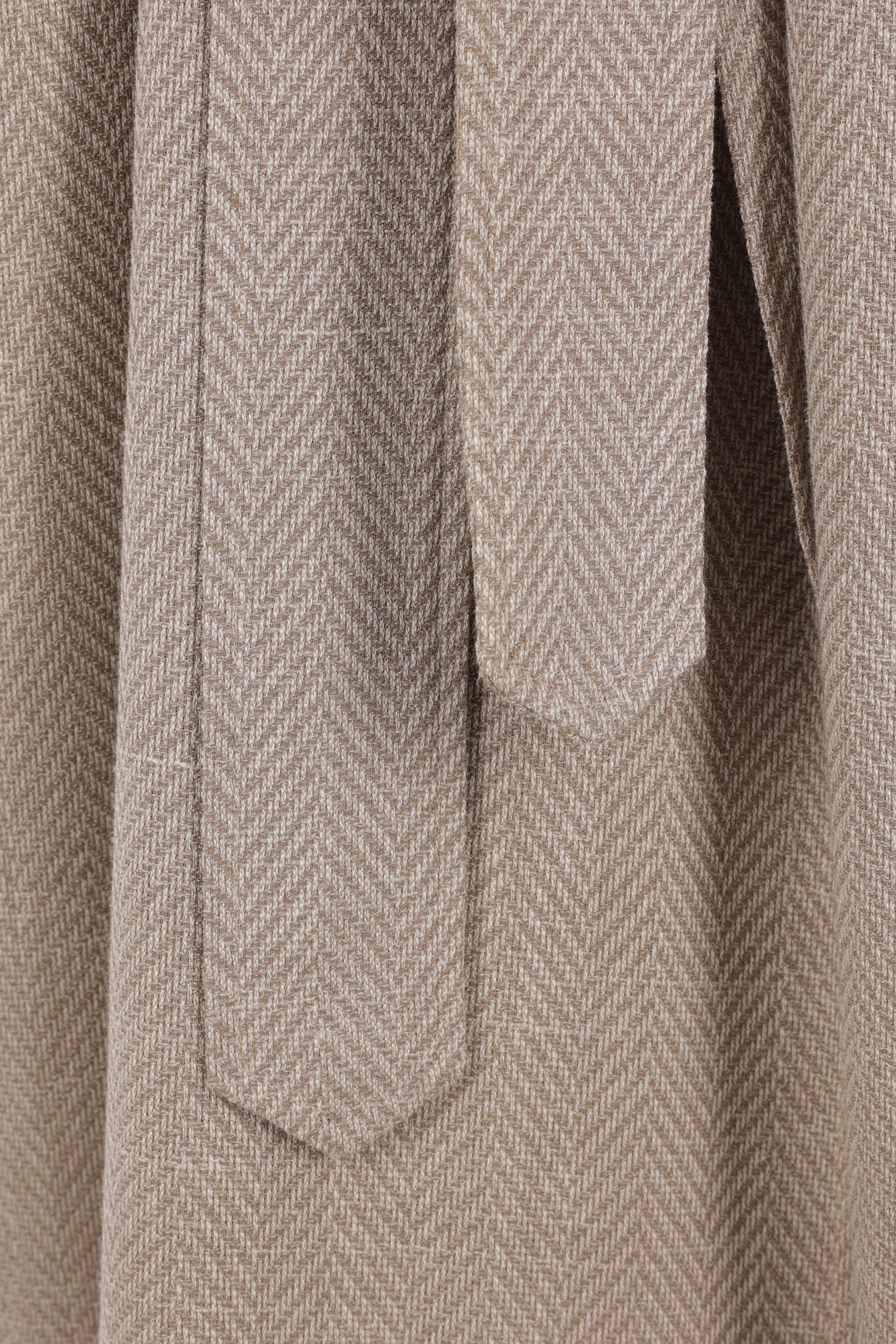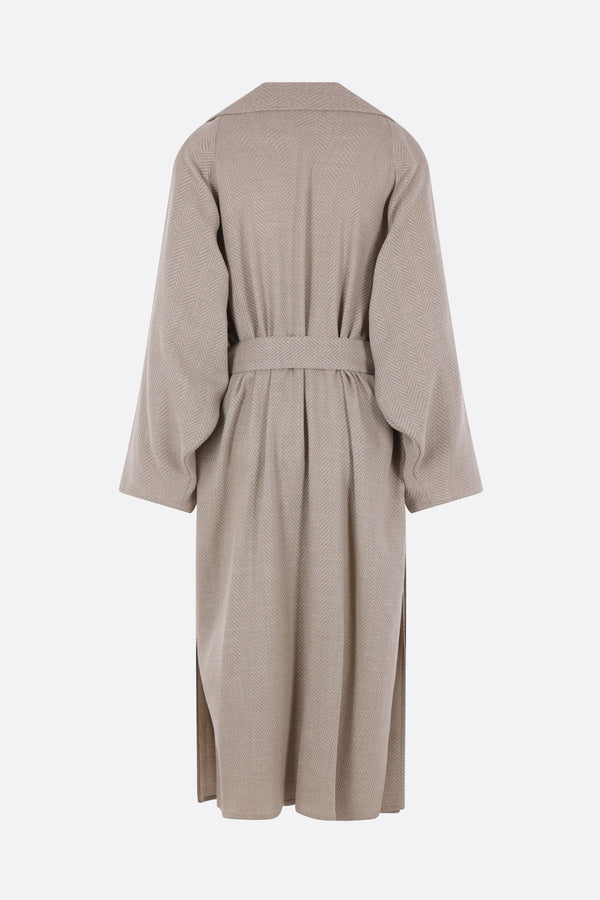 Dusan oversized trench coat crafted from beige herringbone wool and silk blend. Features wide lapels, a matching belt closure, hidden pockets, long raglan sleeves, and deep side vents. The interior is unlined.