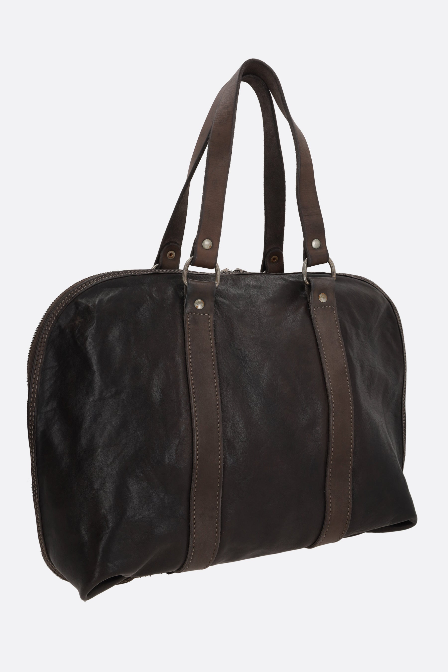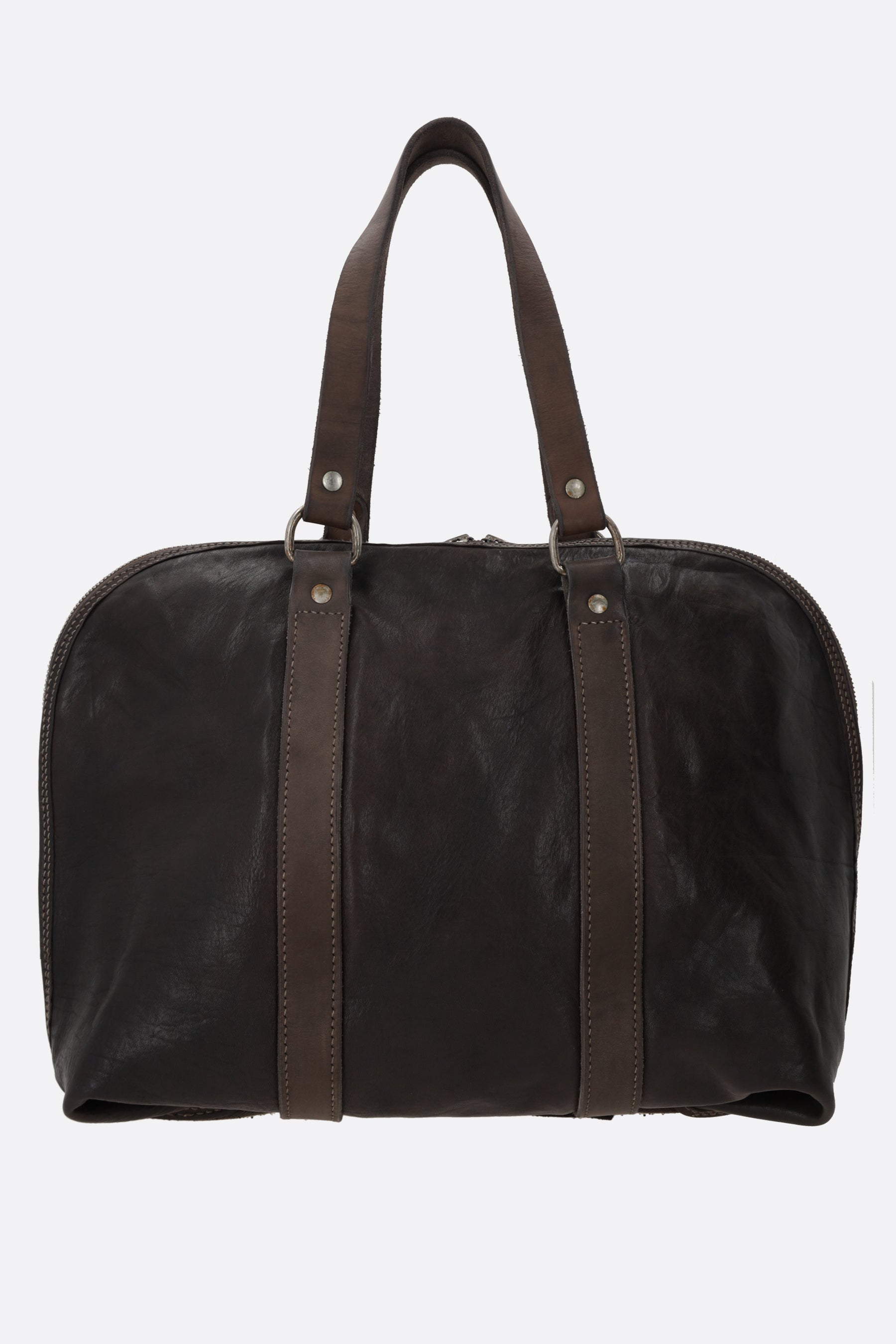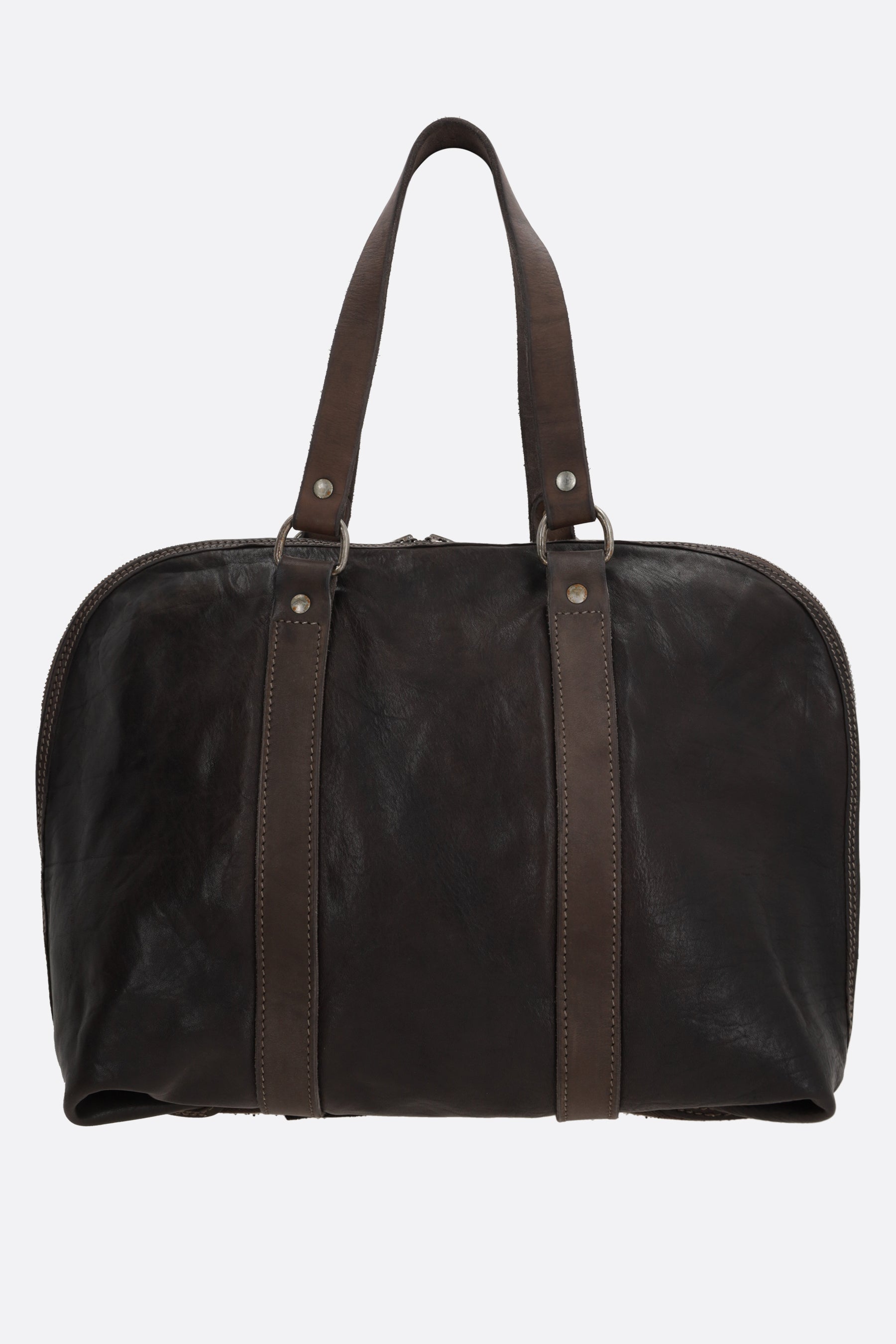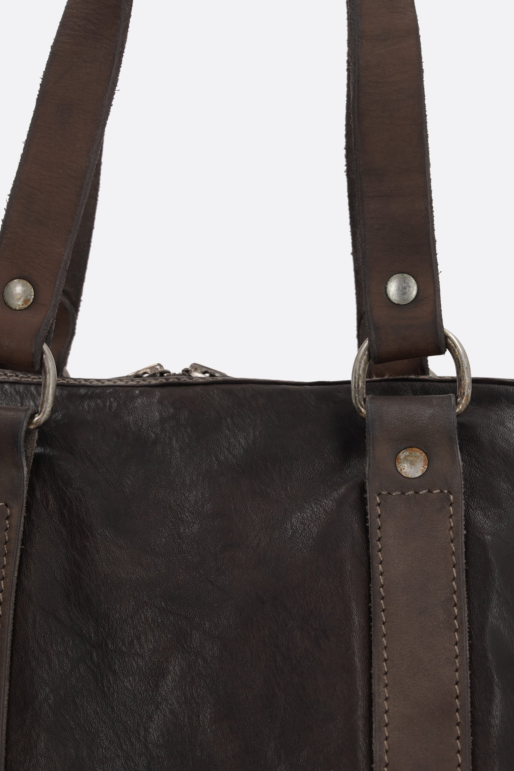 Guidi handbag crafted from lightly hammered dark brown leather. Featuring antiqued silver-tone hardware, double-slider zip closure, and dual handles. The interior is lined in tone-on-tone suede and includes a zippered pocket.