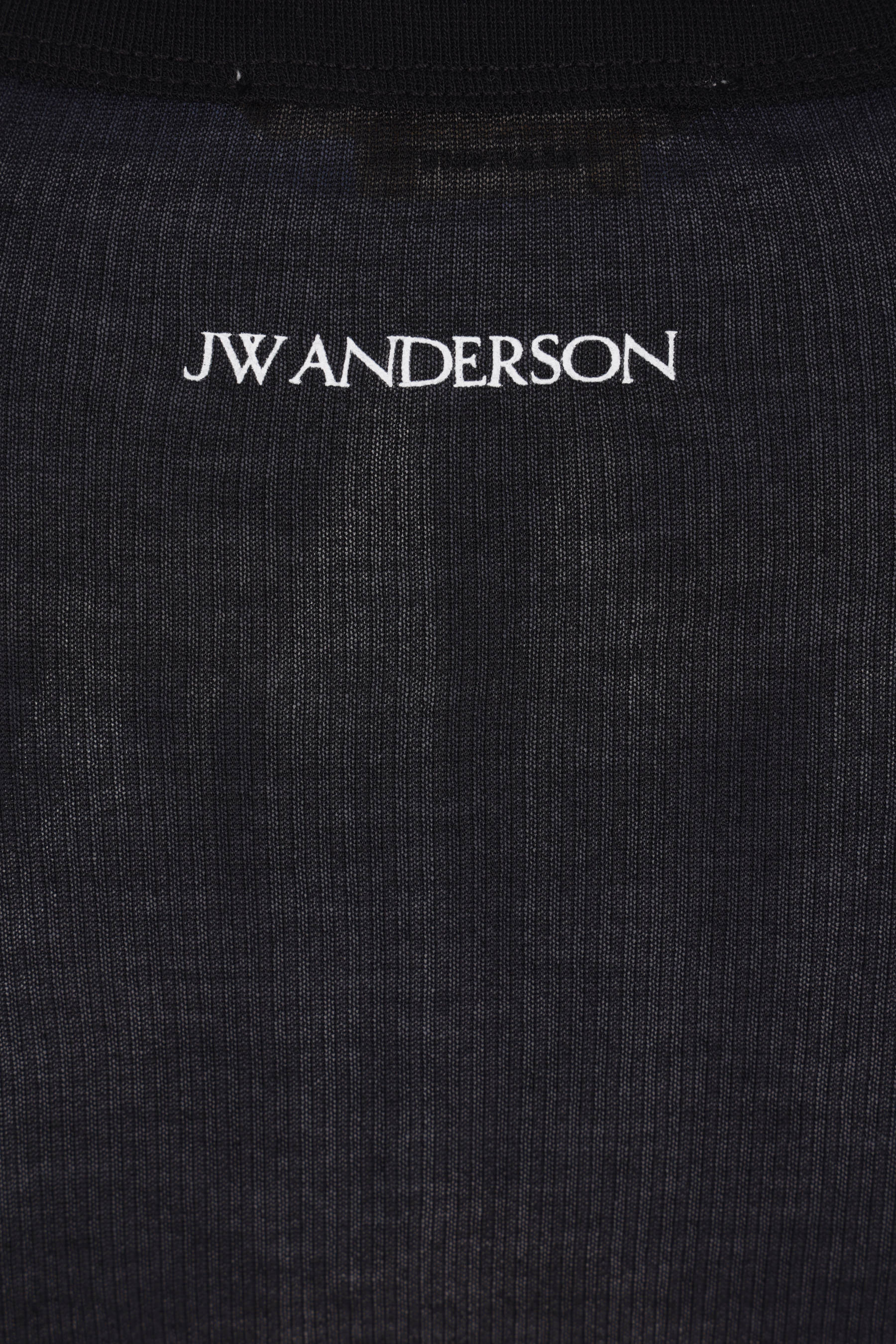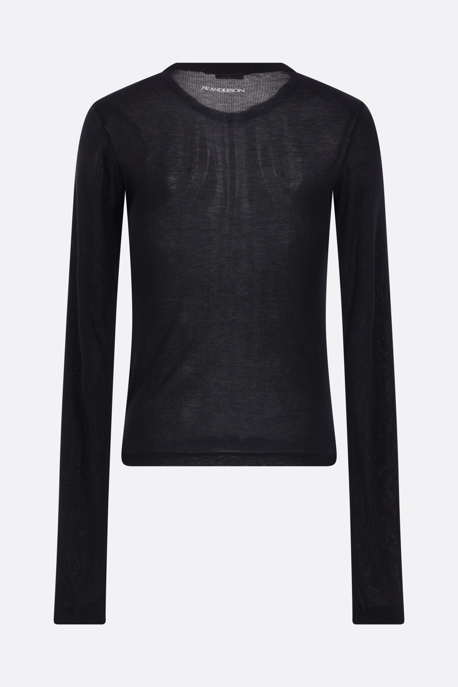 JW Anderson t-shirt crafted from black ribbed jersey with a contrasting logo print at the back of the neck. Featuring a crew neckline, long sleeves, and a straight hem.