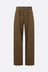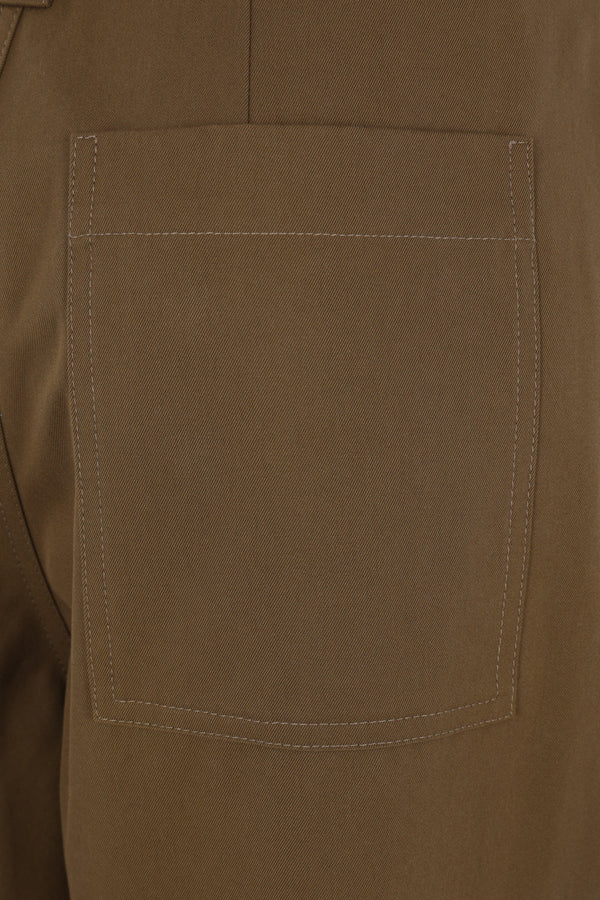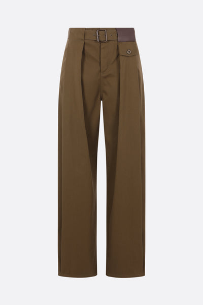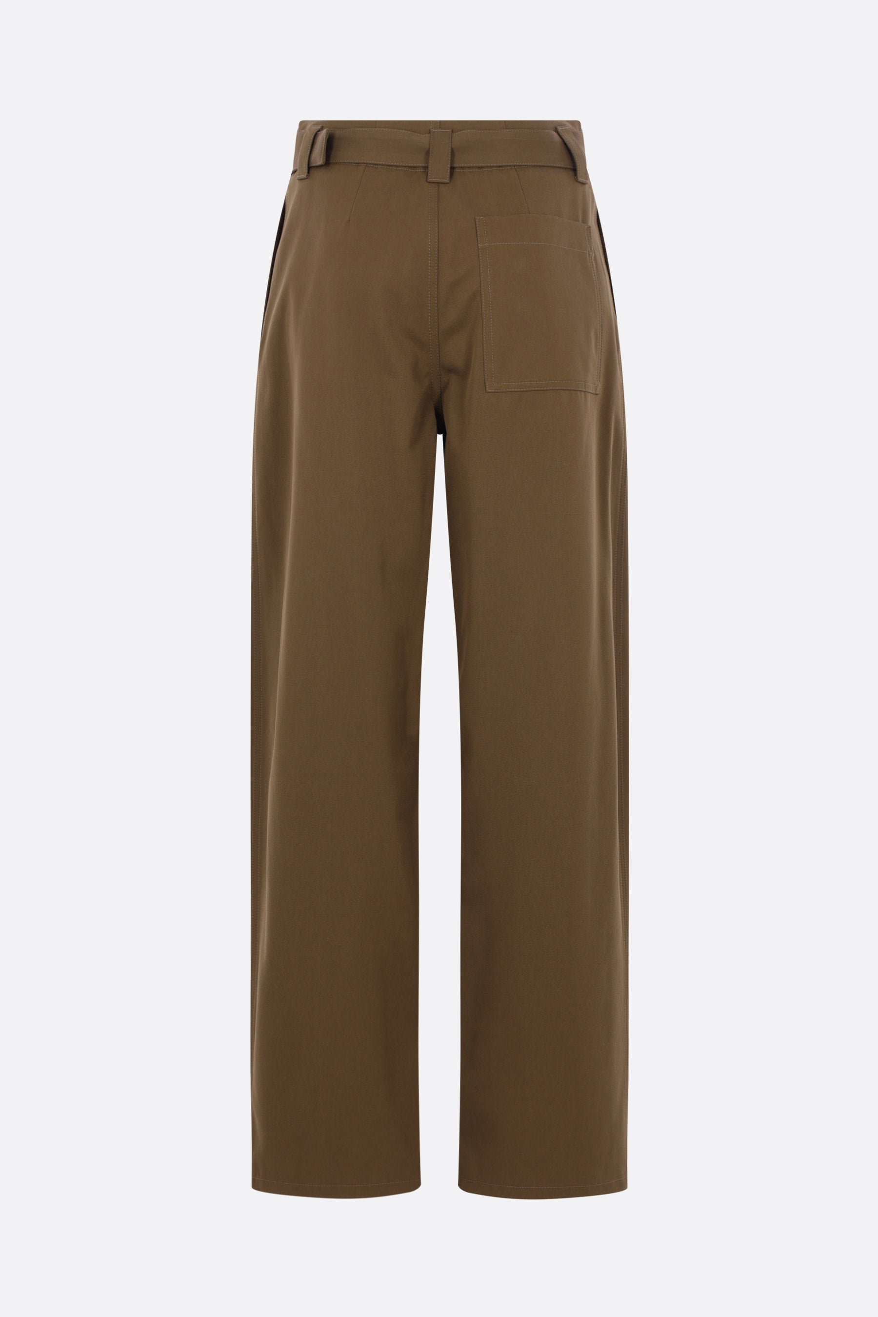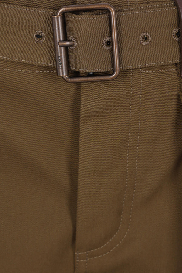 Loewe trousers crafted from khaki green cotton and silk gabardine. Featuring front hook-and-button closure, belt loops with a matching belt, multiple pockets, and front pleats. The design is completed with a leather Anagram logo patch on the front.