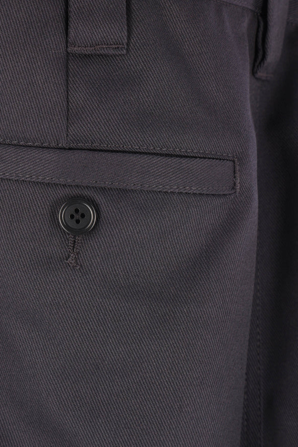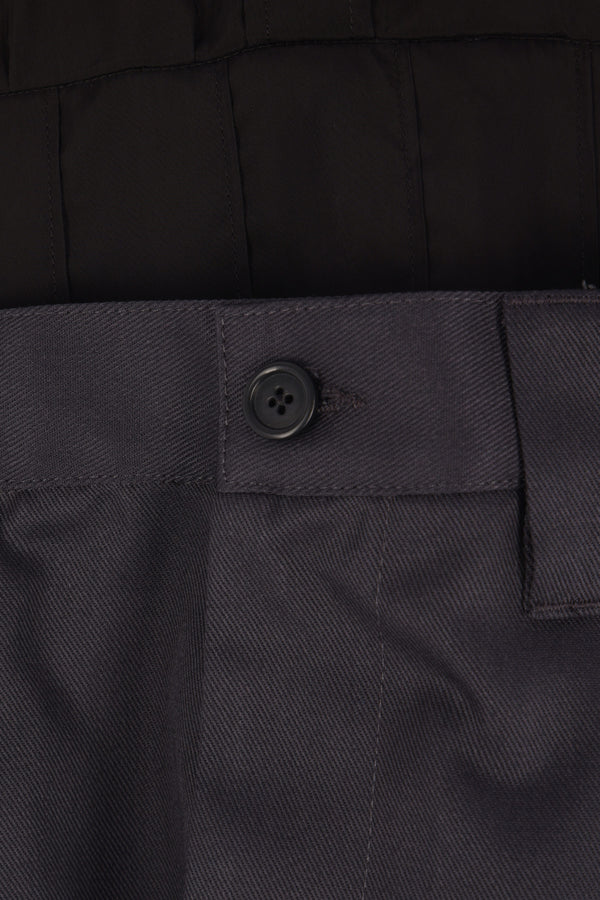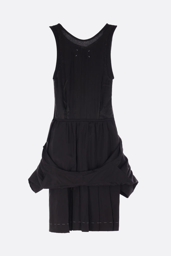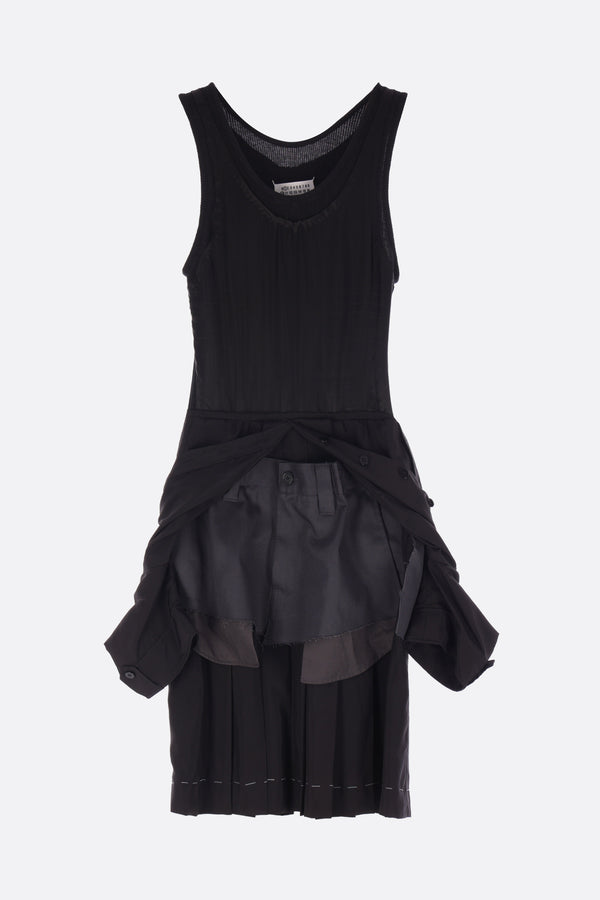 Maison Margiela midi dress crafted from a blend of materials in black and grey tones, featuring Work-in-progress stitching along the trims. It boasts a round neckline, side zip closure, pleated skirt with trouser-style details, and a short-sleeved shirt design at the waist. The look is completed with the Maison's signature four stitches on the back.