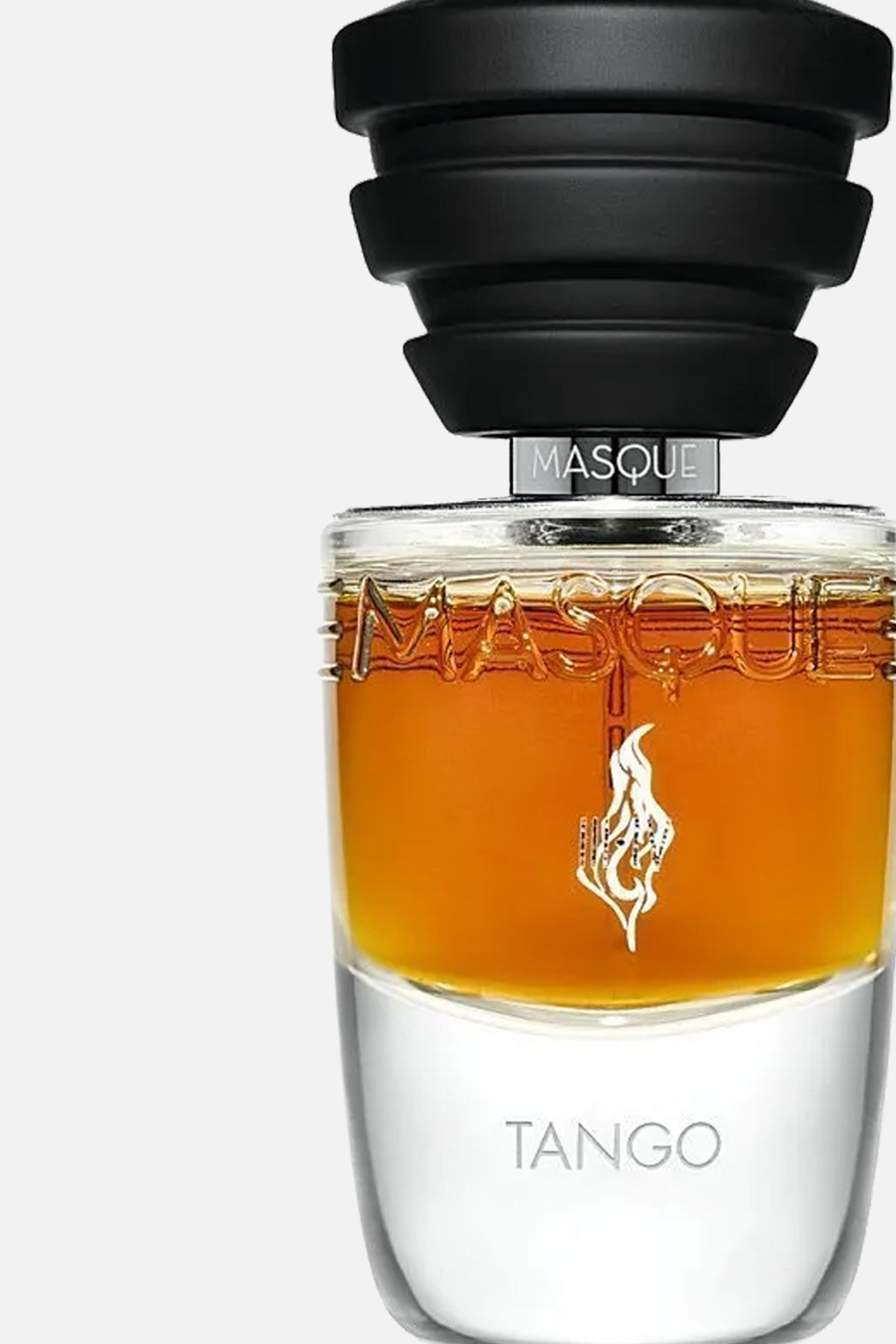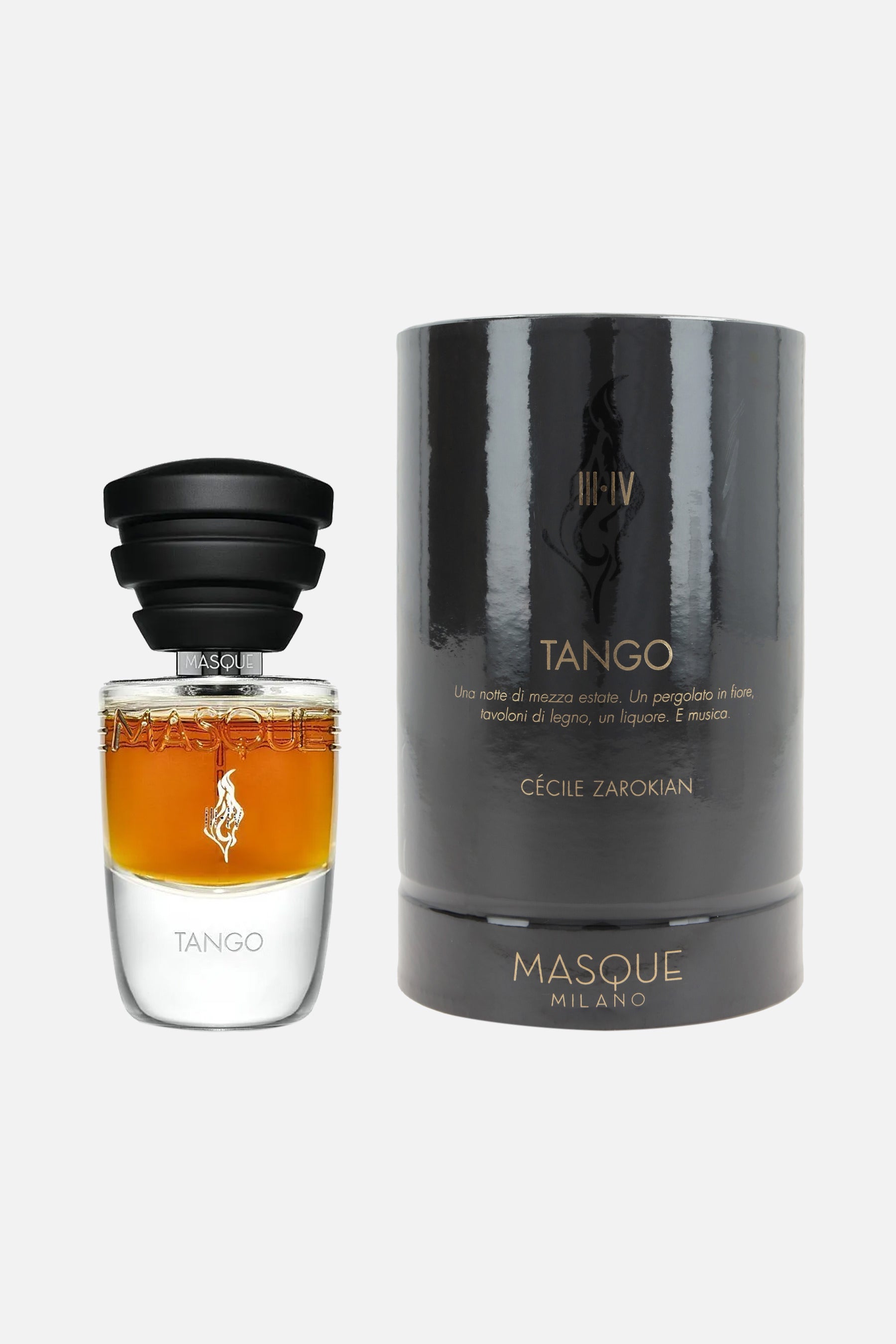 Masque Milano's Eau de parfum 35 ml. Head notes: bergamot, black pepper, cardamom; heart notes: sambac jasmine, damascena rose oil, cumin, patchouli; base notes: vanilla bean, tonka bean, melilot, amber accord, leather accord, benzoin, musk.