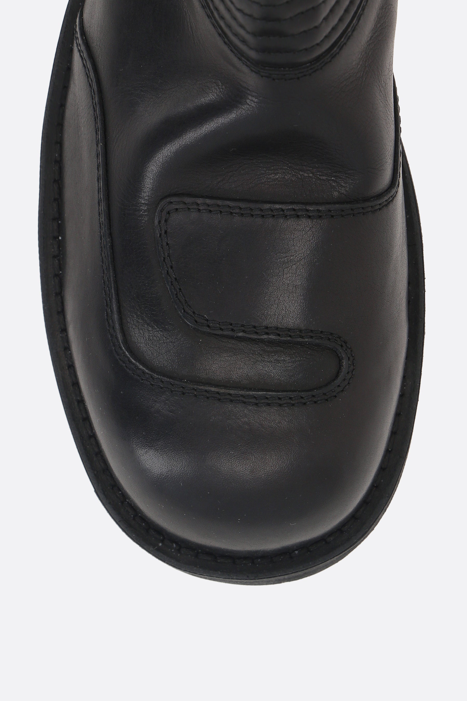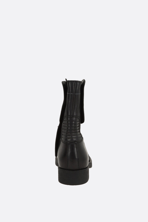 MM6 biker boot crafted in black vintage-effect leather. Featuring a round toe, paneled construction, side closures with zippers and velcro straps, leather lining, and a rubber sole.