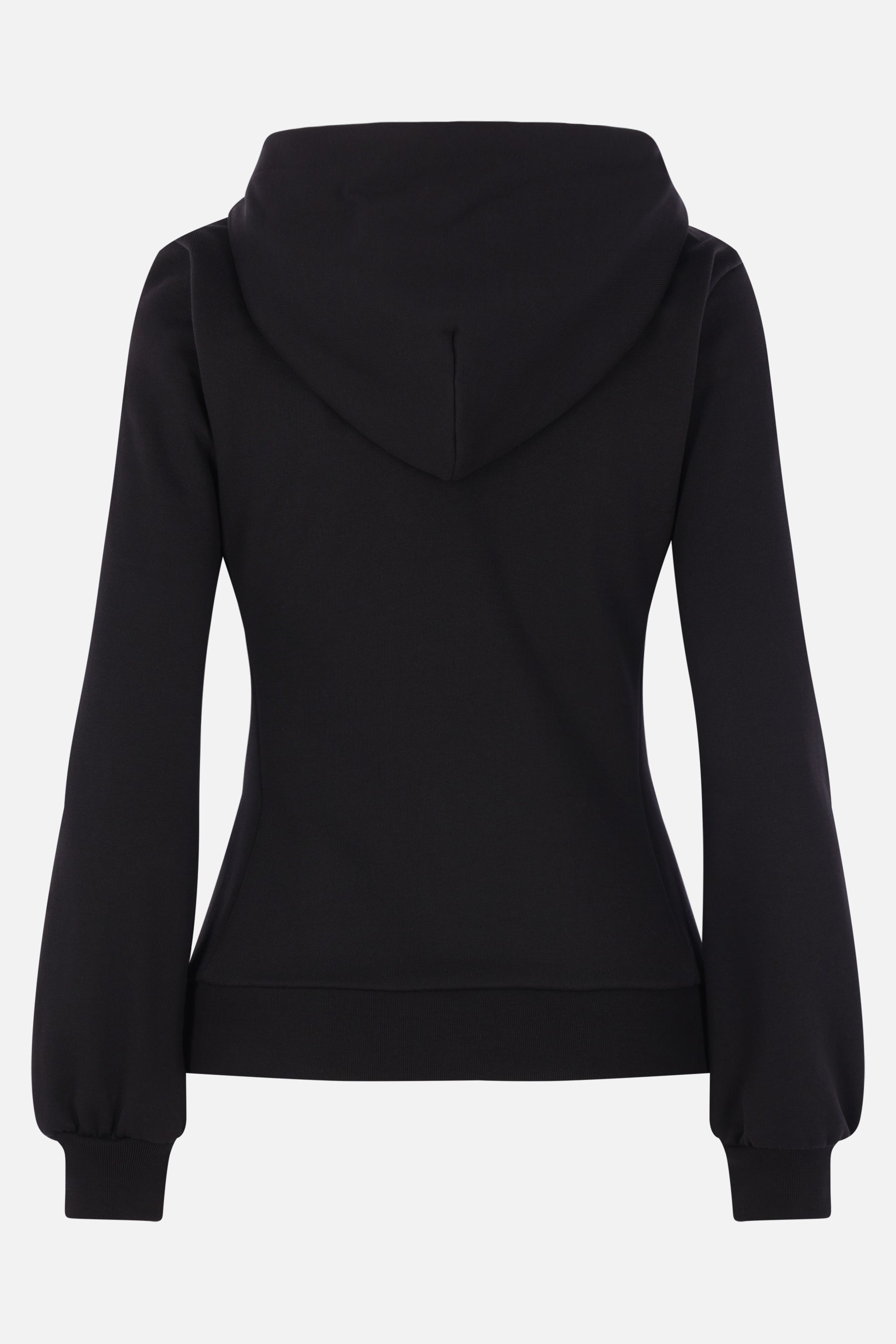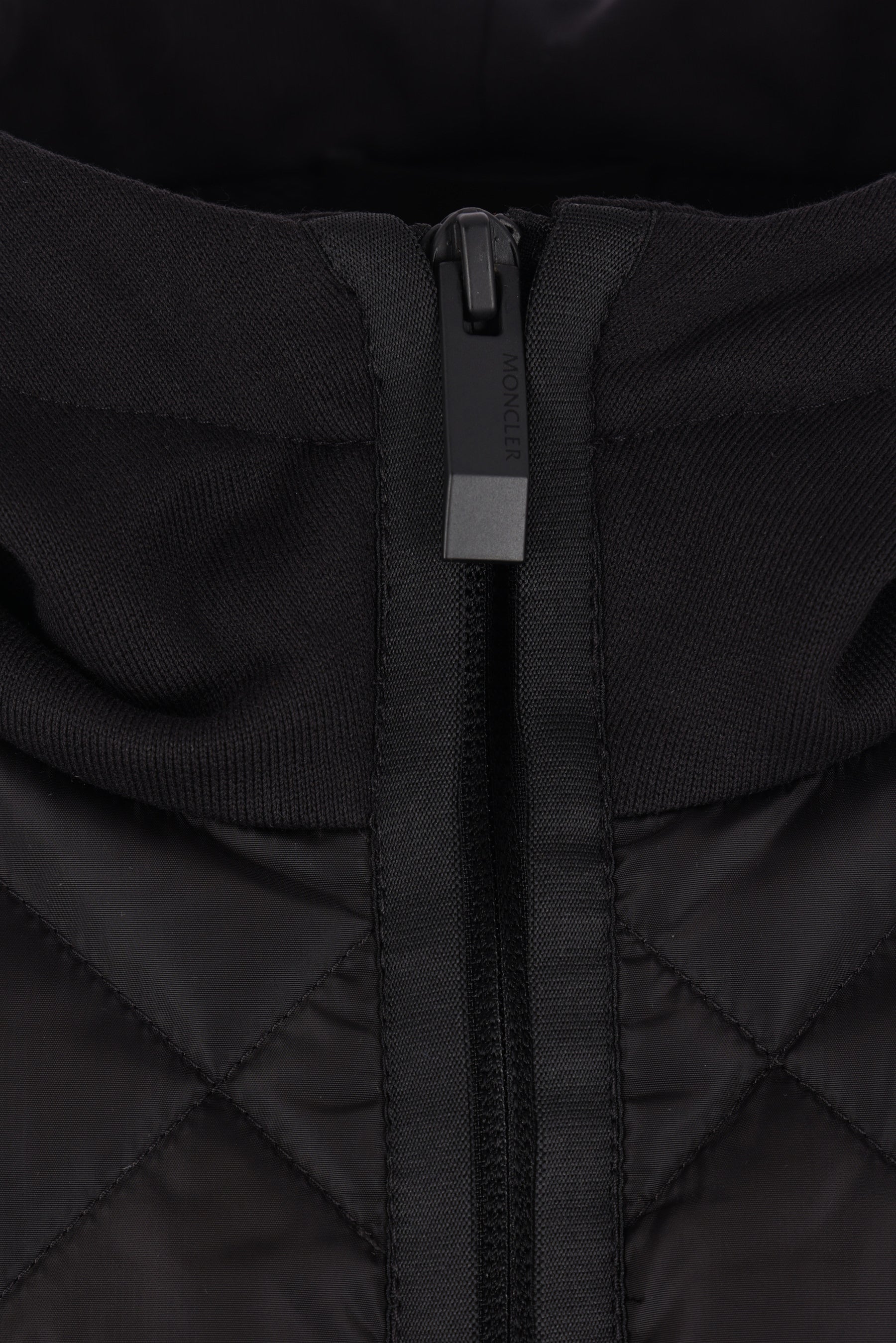Moncler hoodie crafted in black cotton jersey with padded nylon front panel. Features double-zip front closure, zip side pockets, long sleeves, and ribbed edges. The design is completed by the iconic logo patch on the left sleeve.