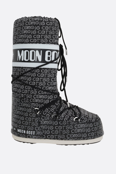 Snow boot by Moon Boot designed in collaboration with 10 Corso Como, made of black nylon with contrasting logo print. Characterized by lace-up closure, round toe, fabric lining and rubber sole. The design is completed by the contrasting faux leather band with printed logos.