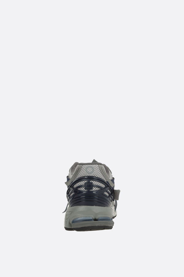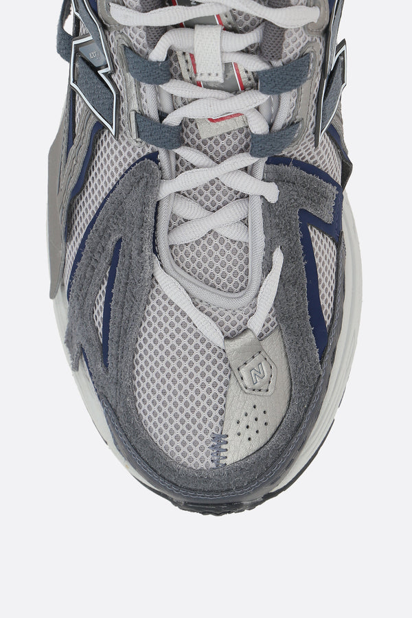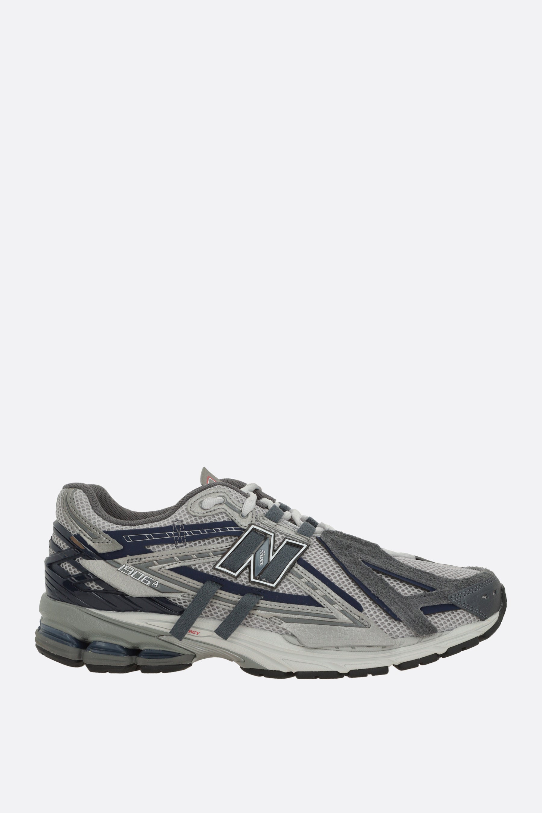 New Balance low-top sneakers crafted from grey mesh with grey and brown faux leather details. Featuring lace-up closure, rounded toe, fabric lining, ABZORB-cushioned midsole, and N-ergy rubber outsole. Finished with Nlock patches on the sides and the NB Running logo printed on the tongue.