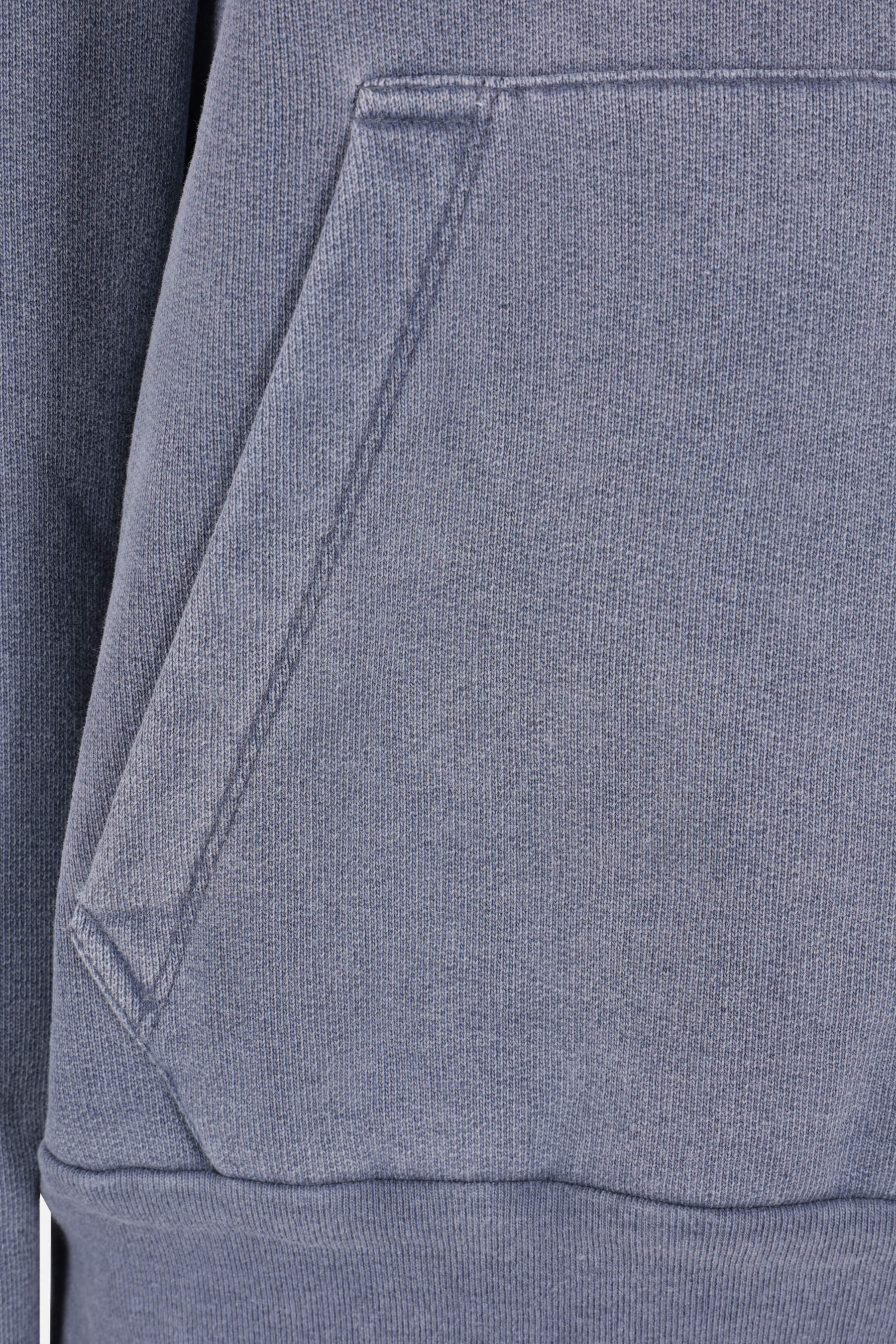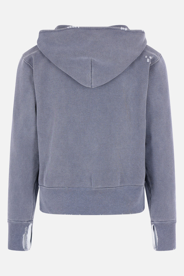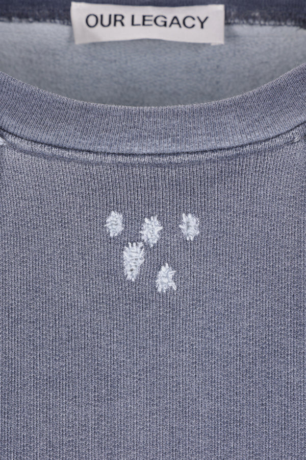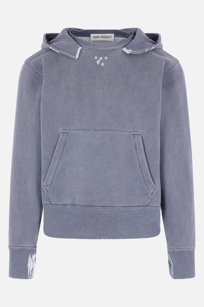 Our Legacy hoodie crafted from blue cotton jersey with a distressed effect. Featuring a crew neckline, kangaroo pocket, long sleeves, and ribbed trims.