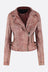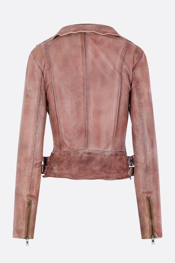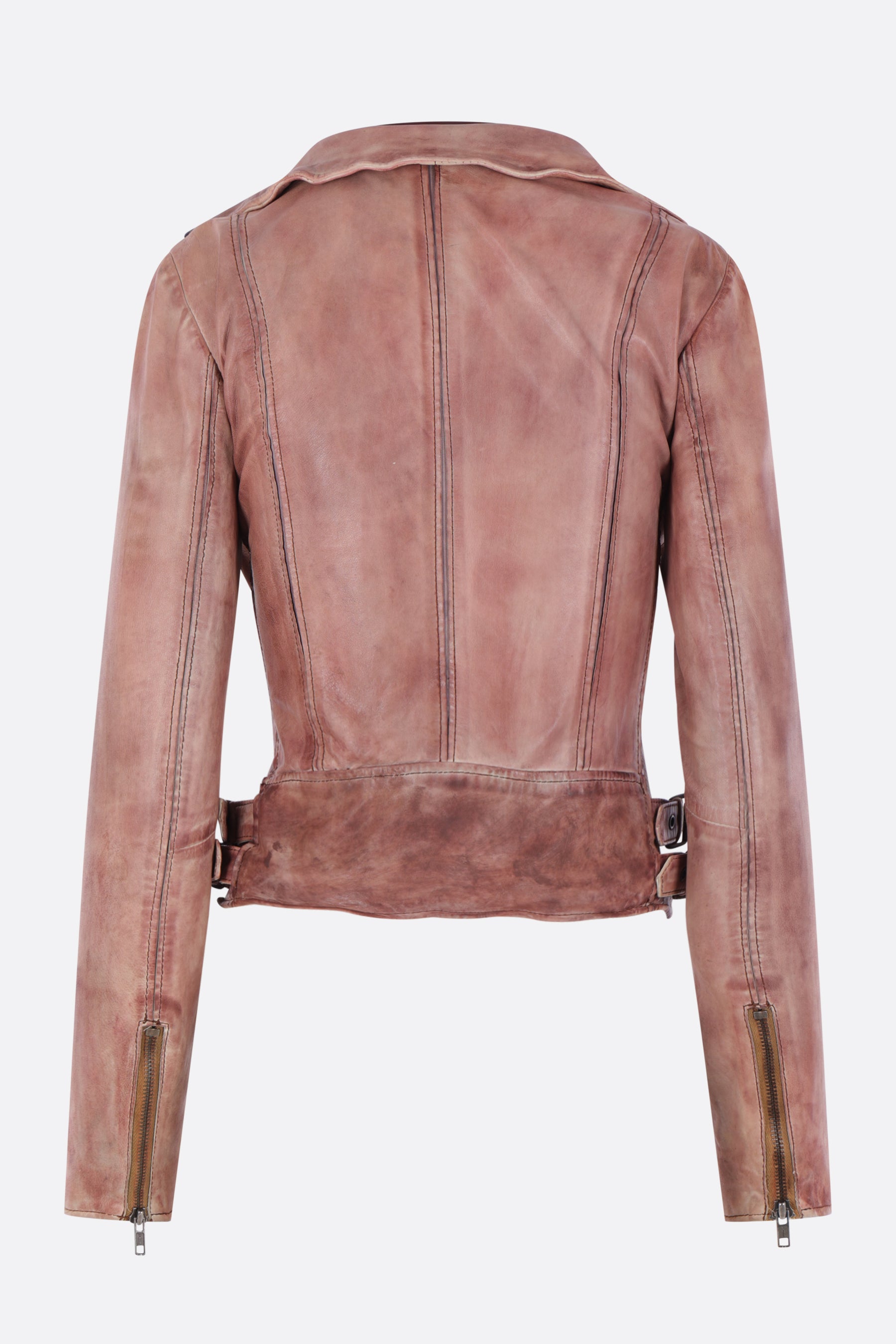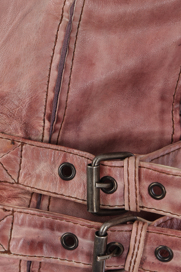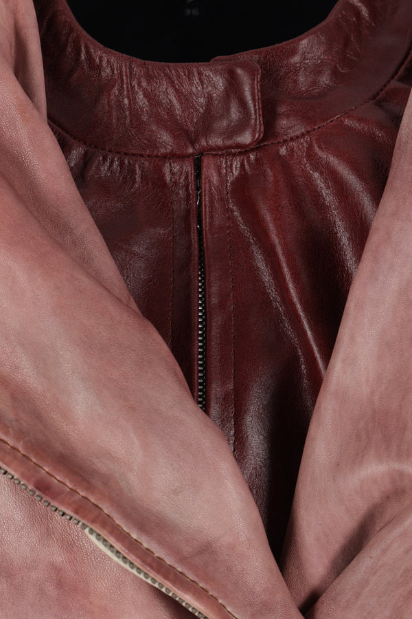 Petra Fagerstrom biker jacket made of vintage pink leather with a burgundy inner panel. Featuring a band collar, biker-style neckline, double zip closure, long sleeves with zip cuffs, zip pockets, adjustable waist straps, and a lined interior.