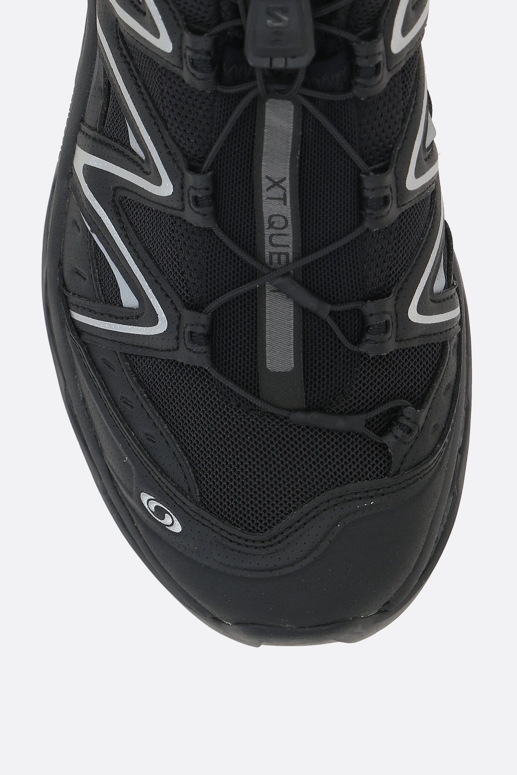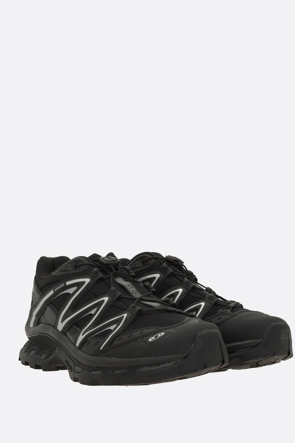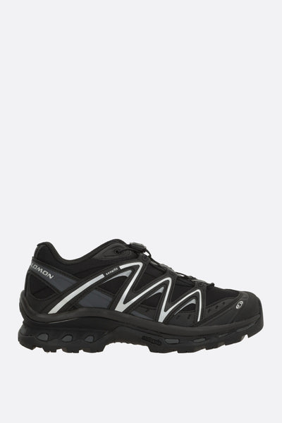 Salomon S/Lab low-top sneakers crafted in black mesh with tone-on-tone synthetic leather details. Featuring a drawstring closure, round toe, molded OrthoLite® insole, fabric lining, and a textured rubber outsole with All Terrain Contagrip® technology. The design is completed by a logo label applied on the tongue and a logo printed on the side.