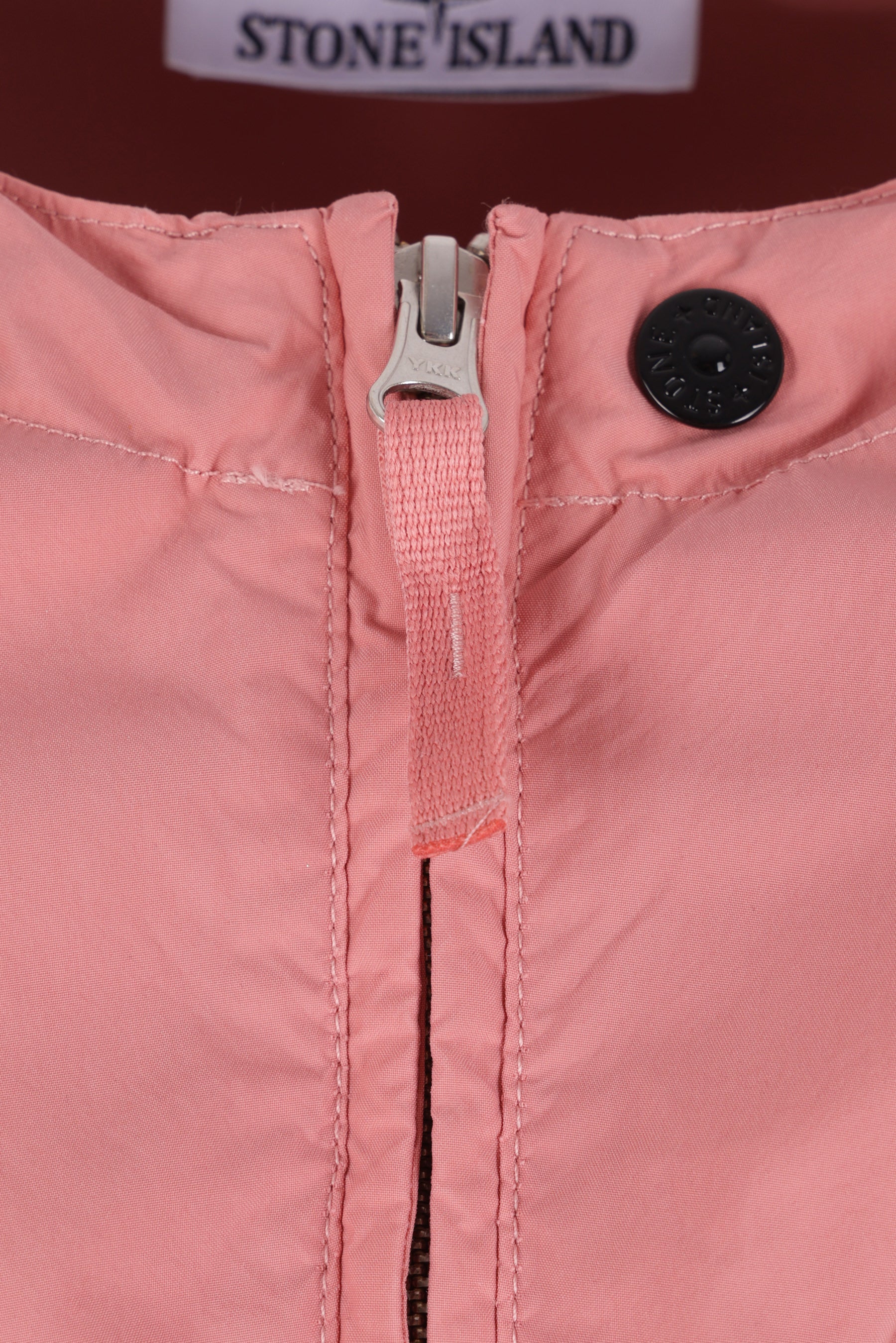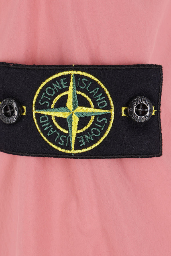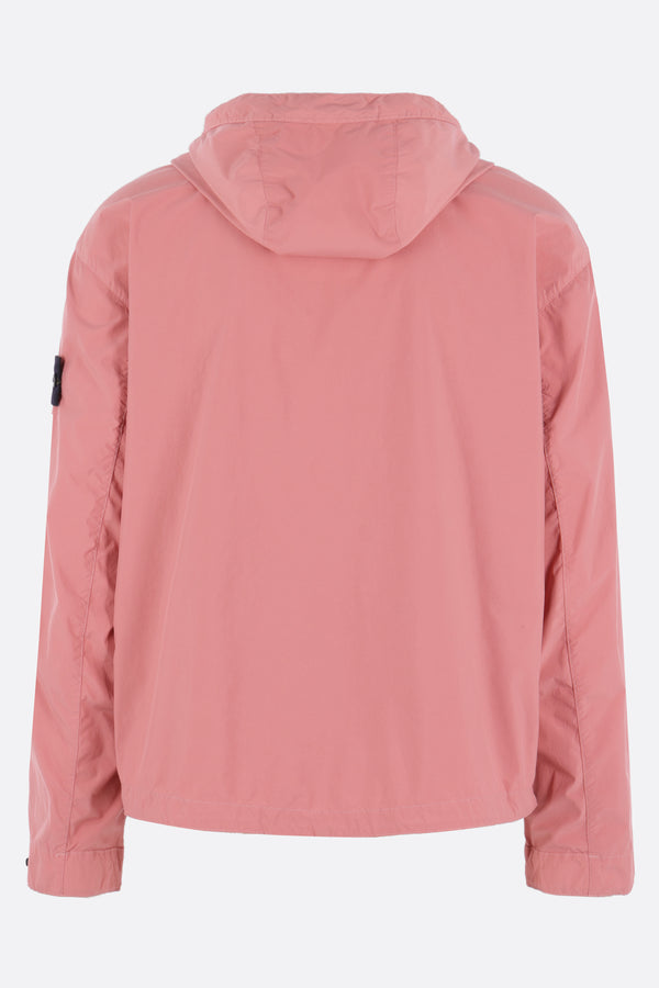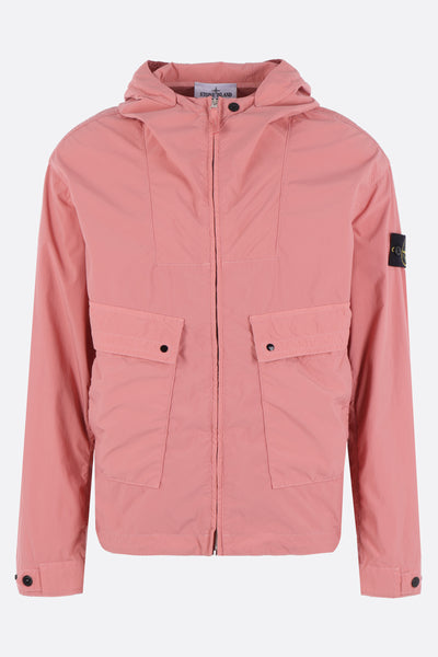 Stone Island windbreaker crafted from light pink recycled nylon canvas with a removable logo badge. Featuring a drawstring hood, front double-slider zip closure, multiple pockets, long sleeves with adjustable cuffs, and a straight hem with drawstring. Unlined interior. Pink Story collection.