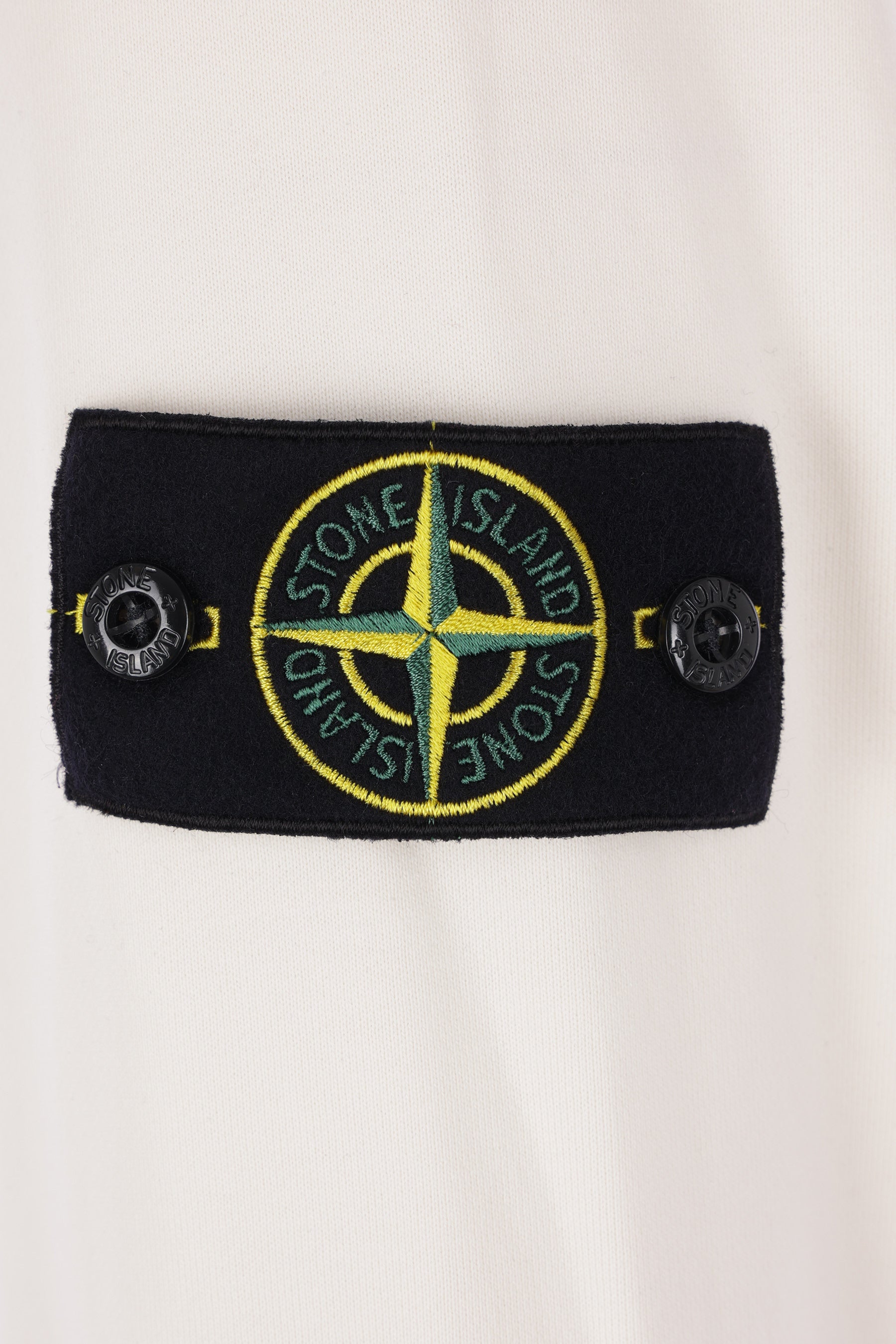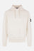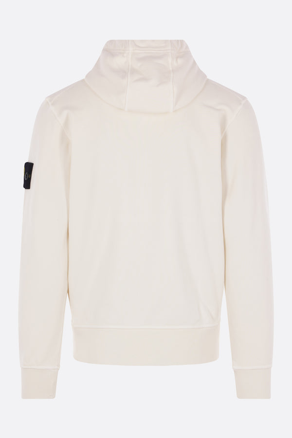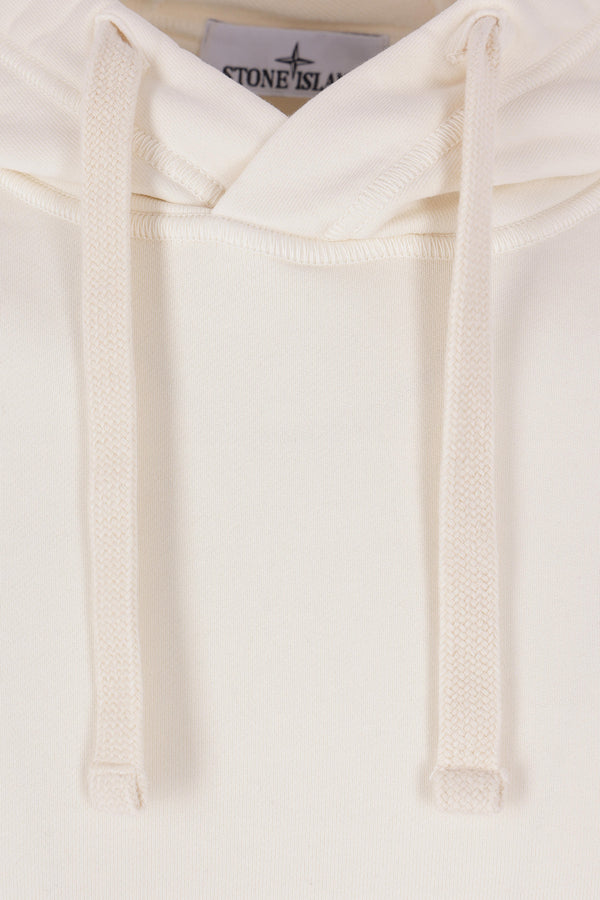 Stone Island hoodie made of ivory cotton fleece. Featuring a kangaroo pocket, long sleeves, and ribbed trims. The design is completed by the iconic logo badge.