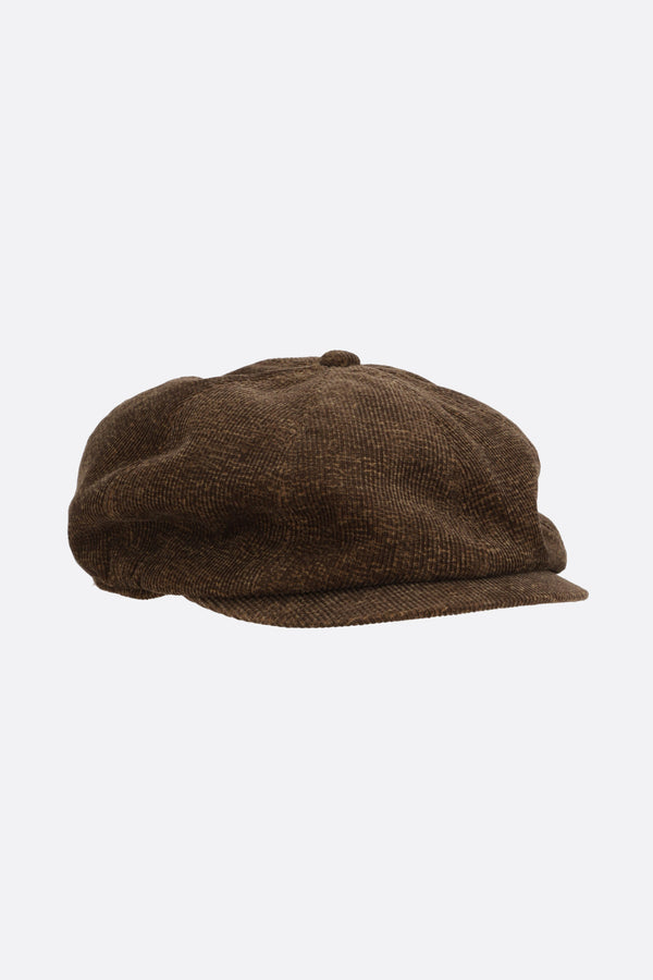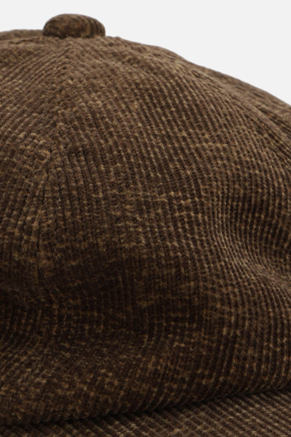 Taiga Takahashi newsboy cap made of brown mélange corduroy with a tweed-effect print. Fully lined interior.