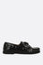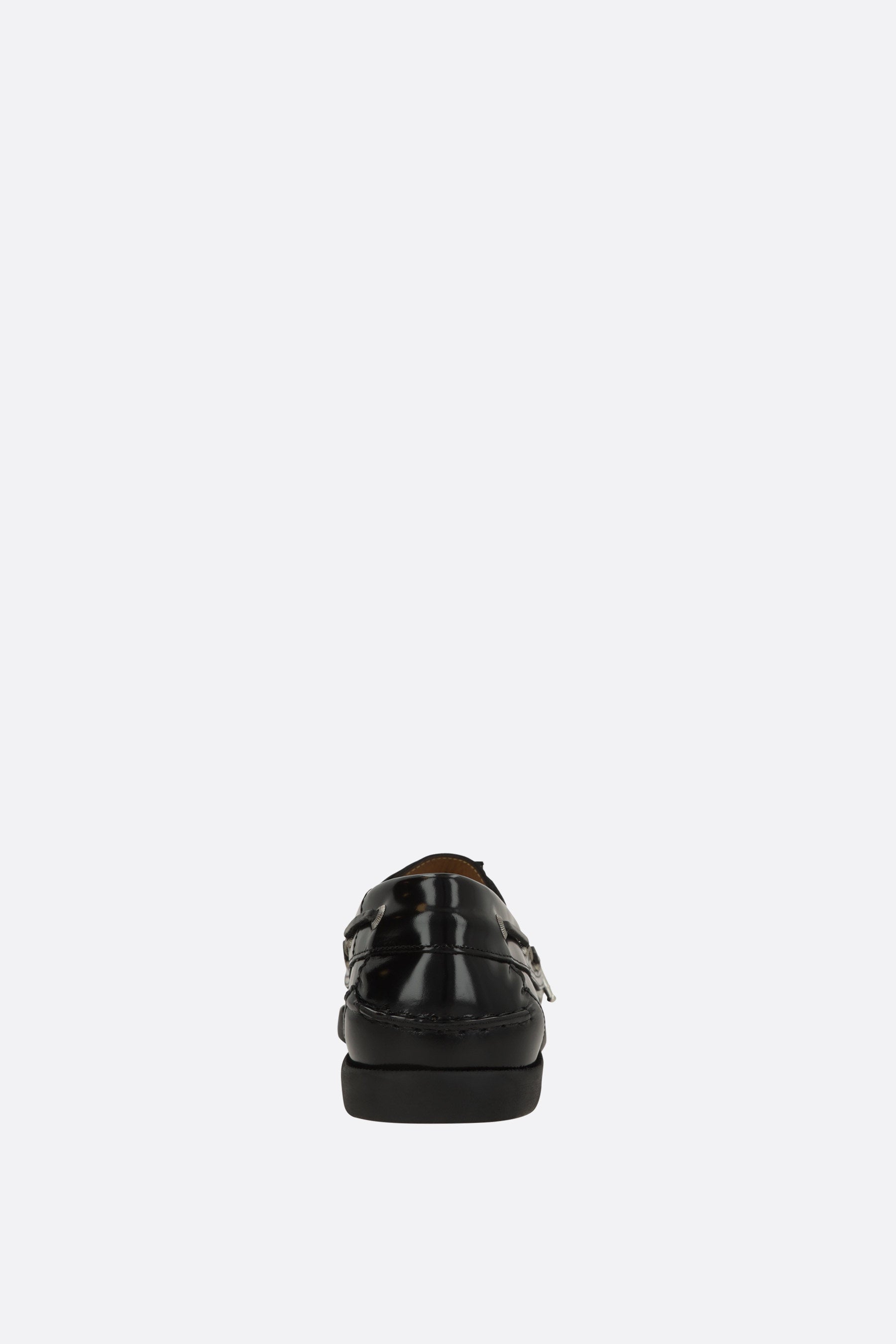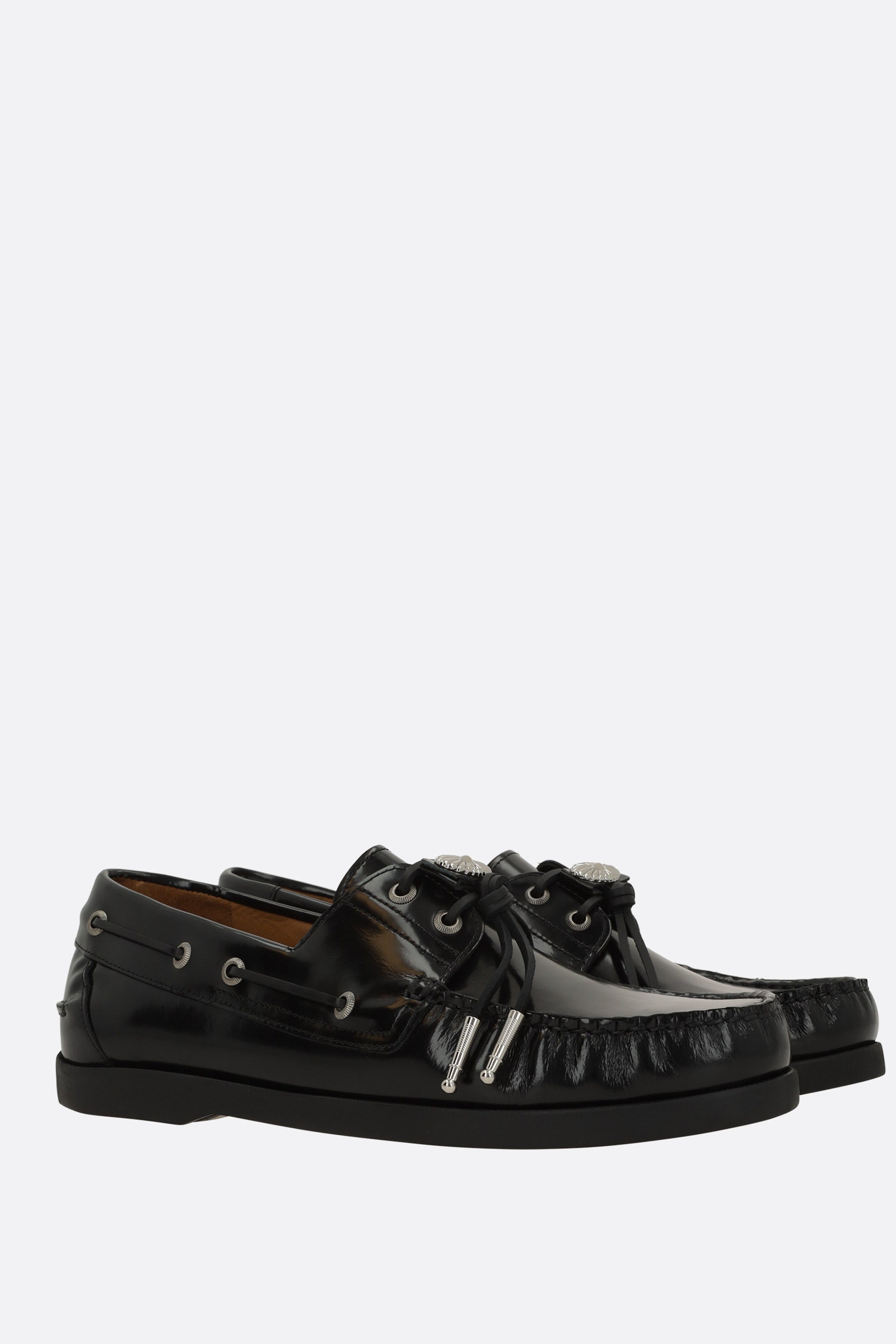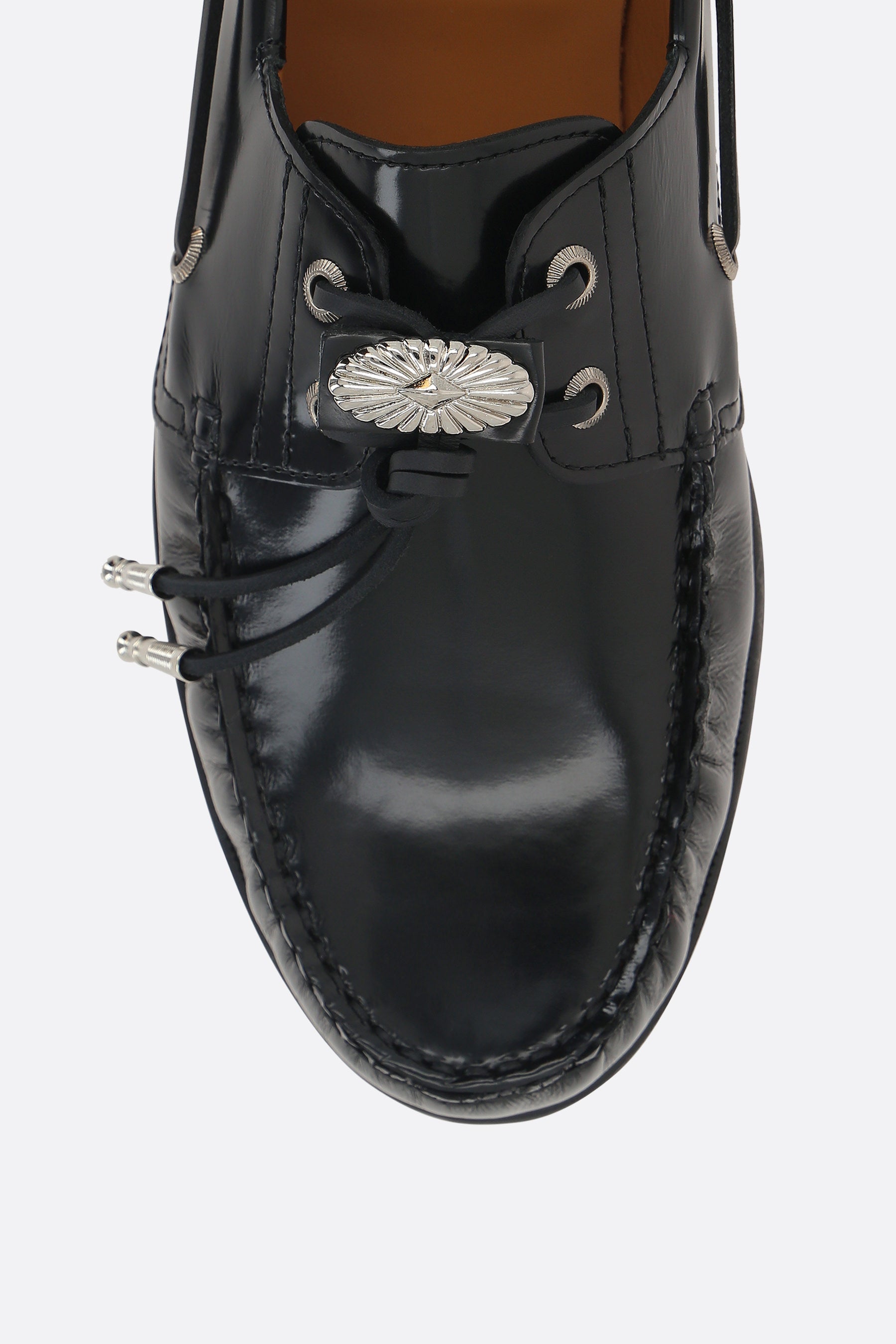 Toga Virilis boat shoes crafted in shiny black leather with metal eyelets. Featuring front laces with a western-inspired detail, round toe, leather lining, and rubber sole.