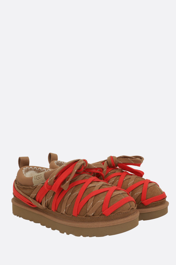 Ugg slippers crafted in light brown suede with decorative laces on the upper. Featuring a rounded toe, shearling lining, and a sugarcane EVA sole. Finished with the iconic logo embossed on the side.