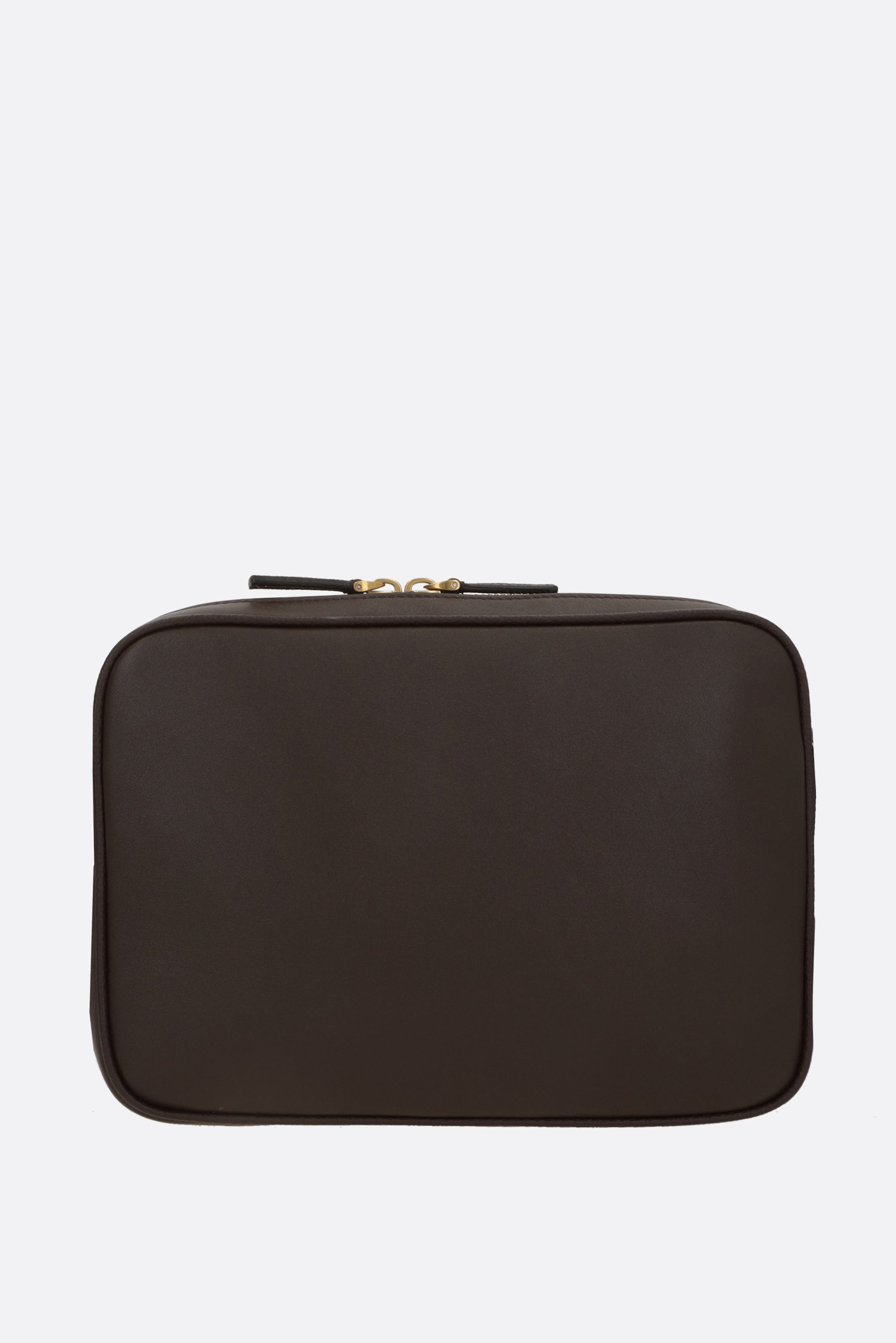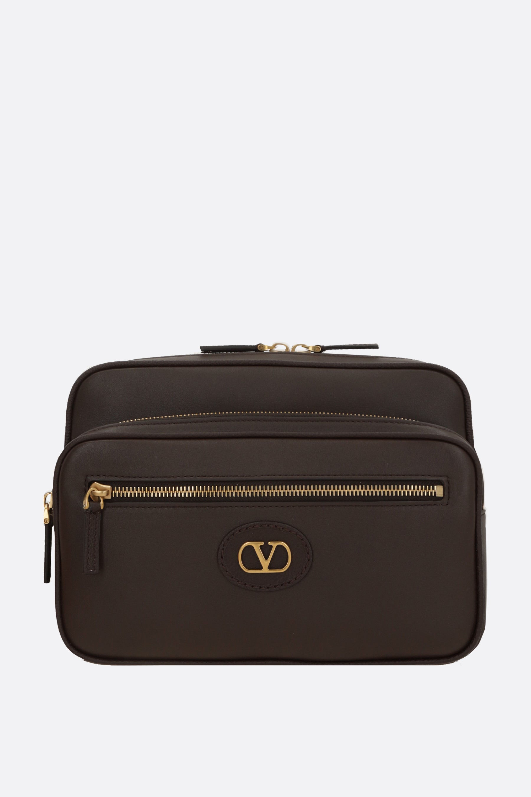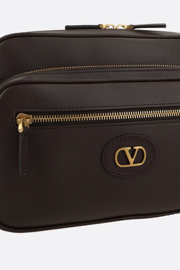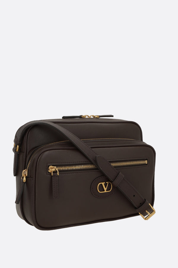 Valentino Garavani camera bag made from smooth brown leather with hammered finish along the edges. Featuring gold-tone hardware, double zip compartments, and an adjustable shoulder strap. The tone-on-tone suede-lined interior completes the design, along with a front zip pocket embellished with the iconic VLogo Signature patch.