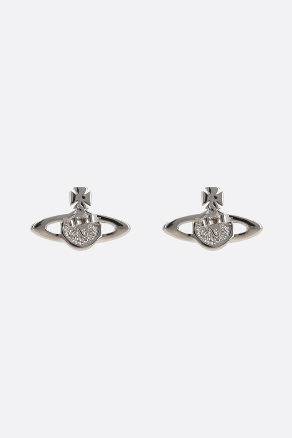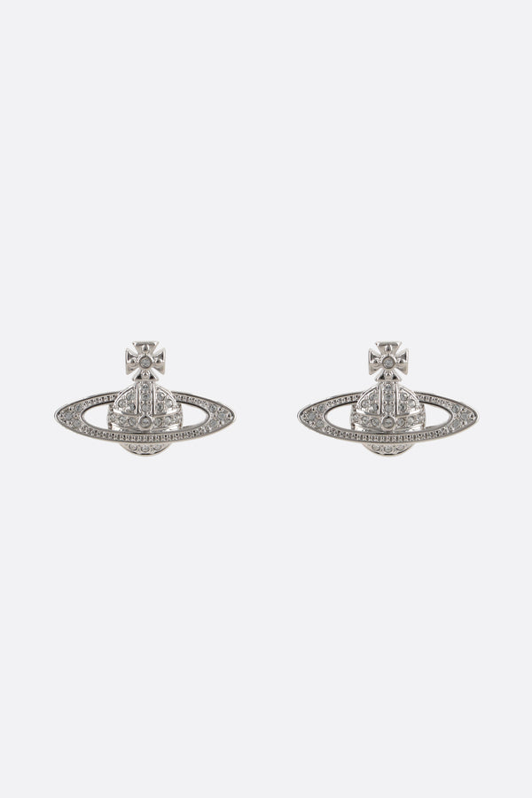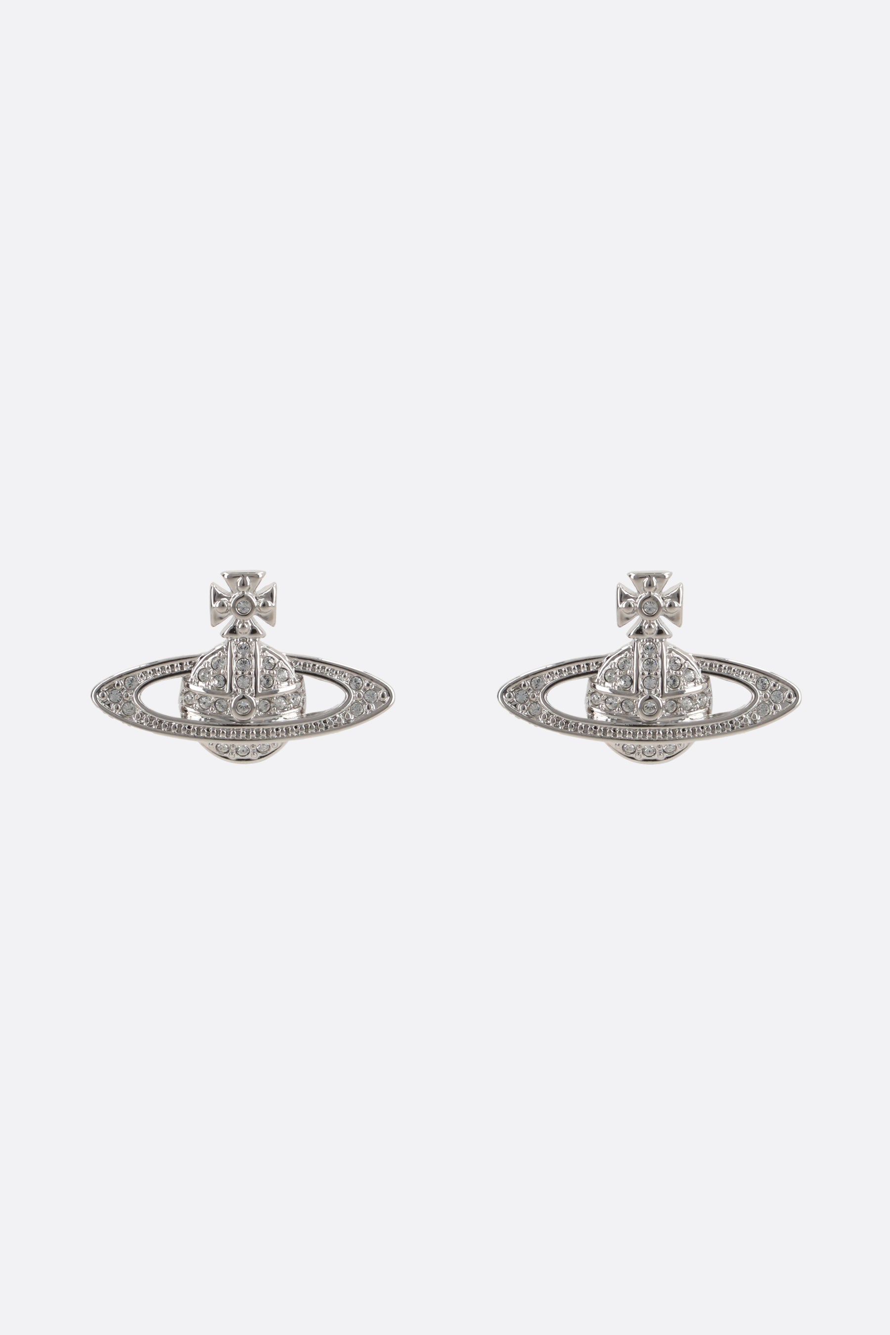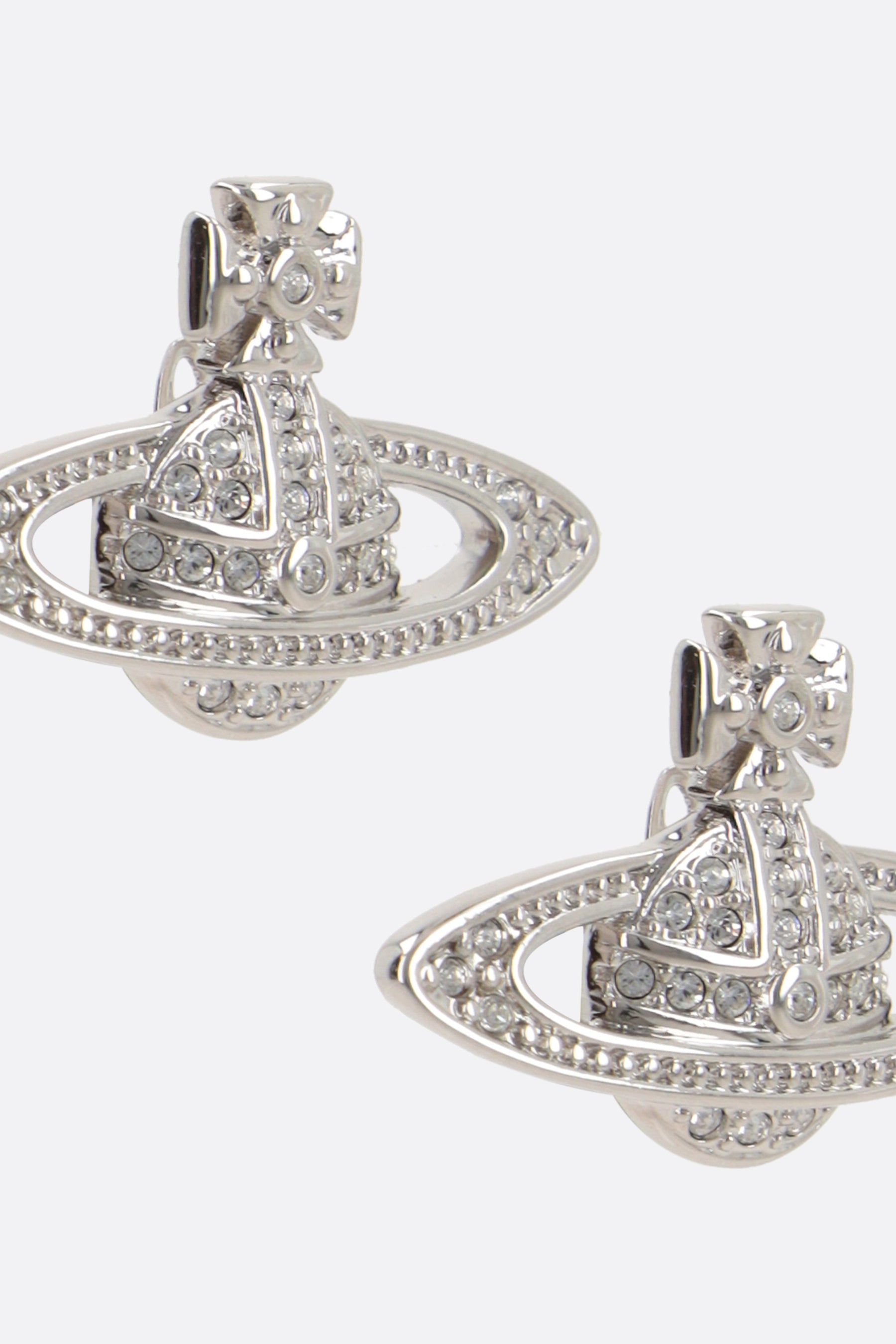 Vivienne Westwood earrings crafted in platinum-finish brass embellished by clear crystals. It features butterfly closure for pierced ears.
