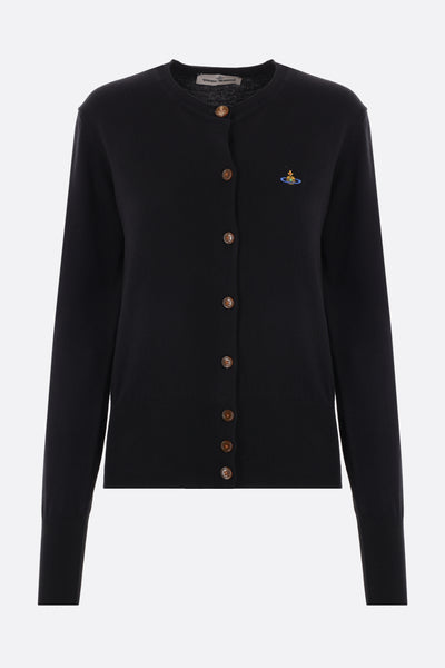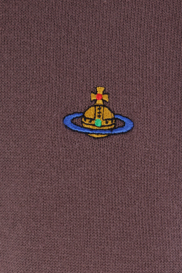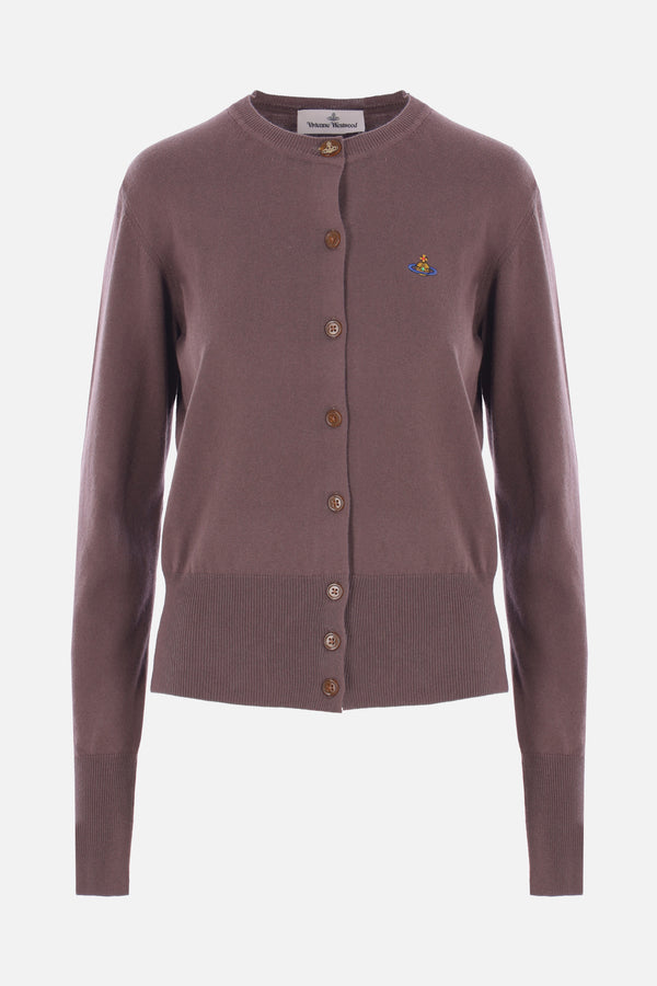 Vivienne Westwood cardigan crafted in brown cotton and cashmere knit with Orb logo embroidery at front. Featuring crew neck, button closure, long sleeves and ribbed edges.