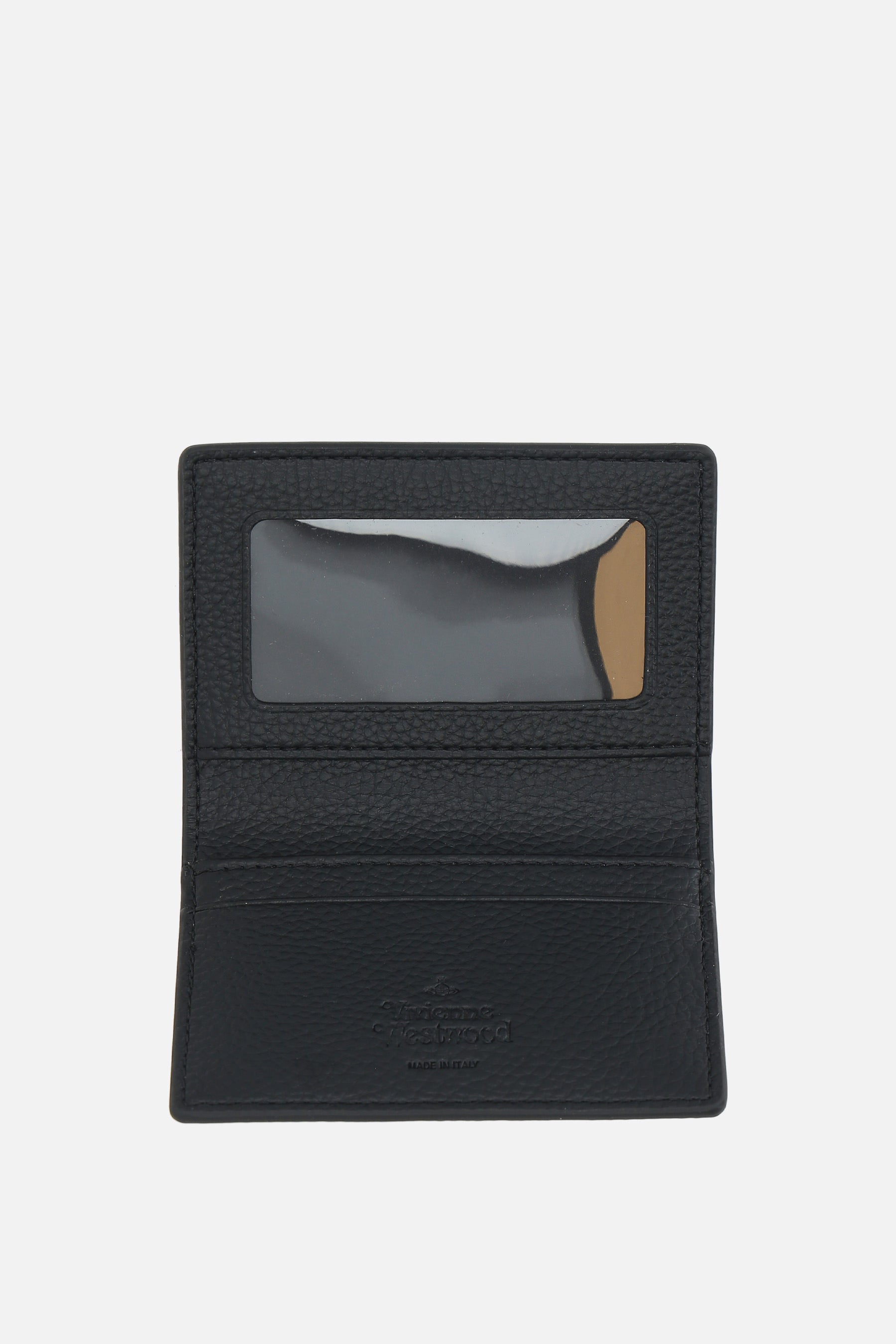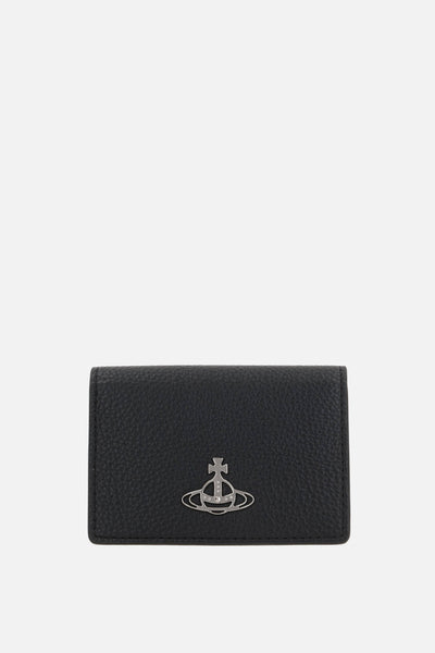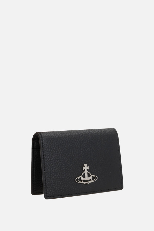 Vivienne Westwood credit card holder crafted from black faux leather, featuring a metal Orb logo on the front. The leather and fabric-lined interior includes two card slots and one ID slot. The design is completed with a flat pocket on the back.