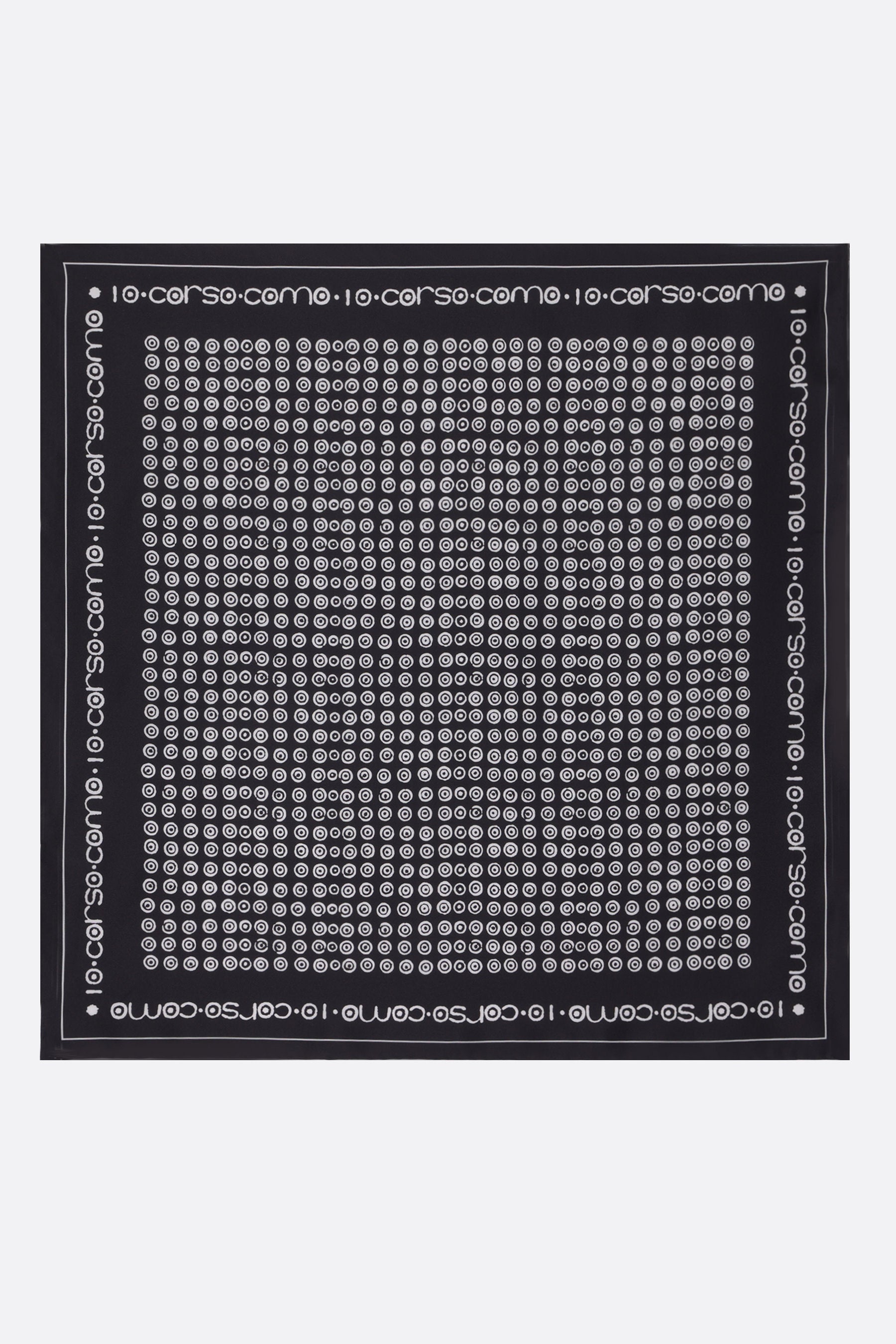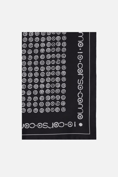 10 Corso Como foulard crafted from black silk twill. Featuring signature circle print and contrasting logo detailing.