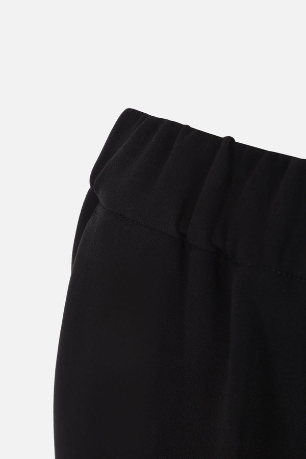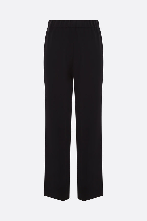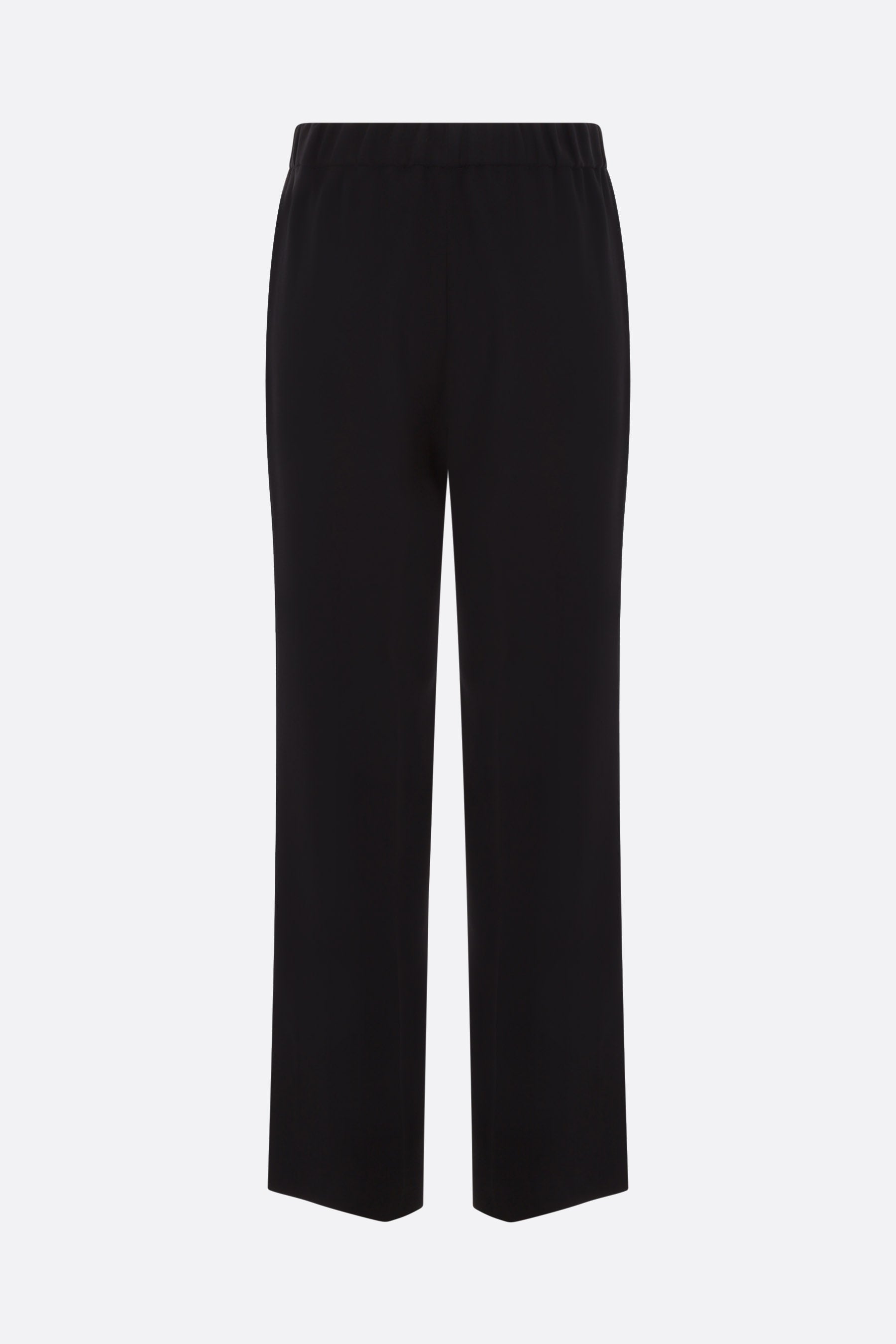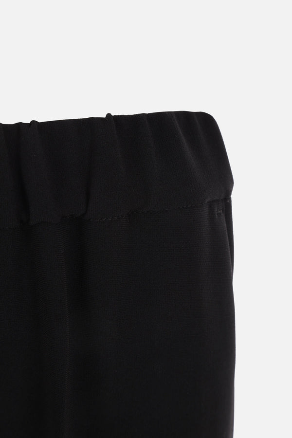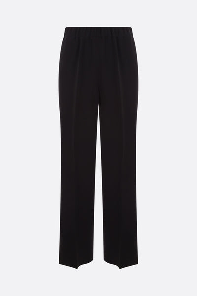 Alberto Biani wide-leg trousers crafted in black stretch cady. Featuring elasticated waistband with drawstring, side pockets, pressed crease along centre and side slits at ankles. Unlined interior.