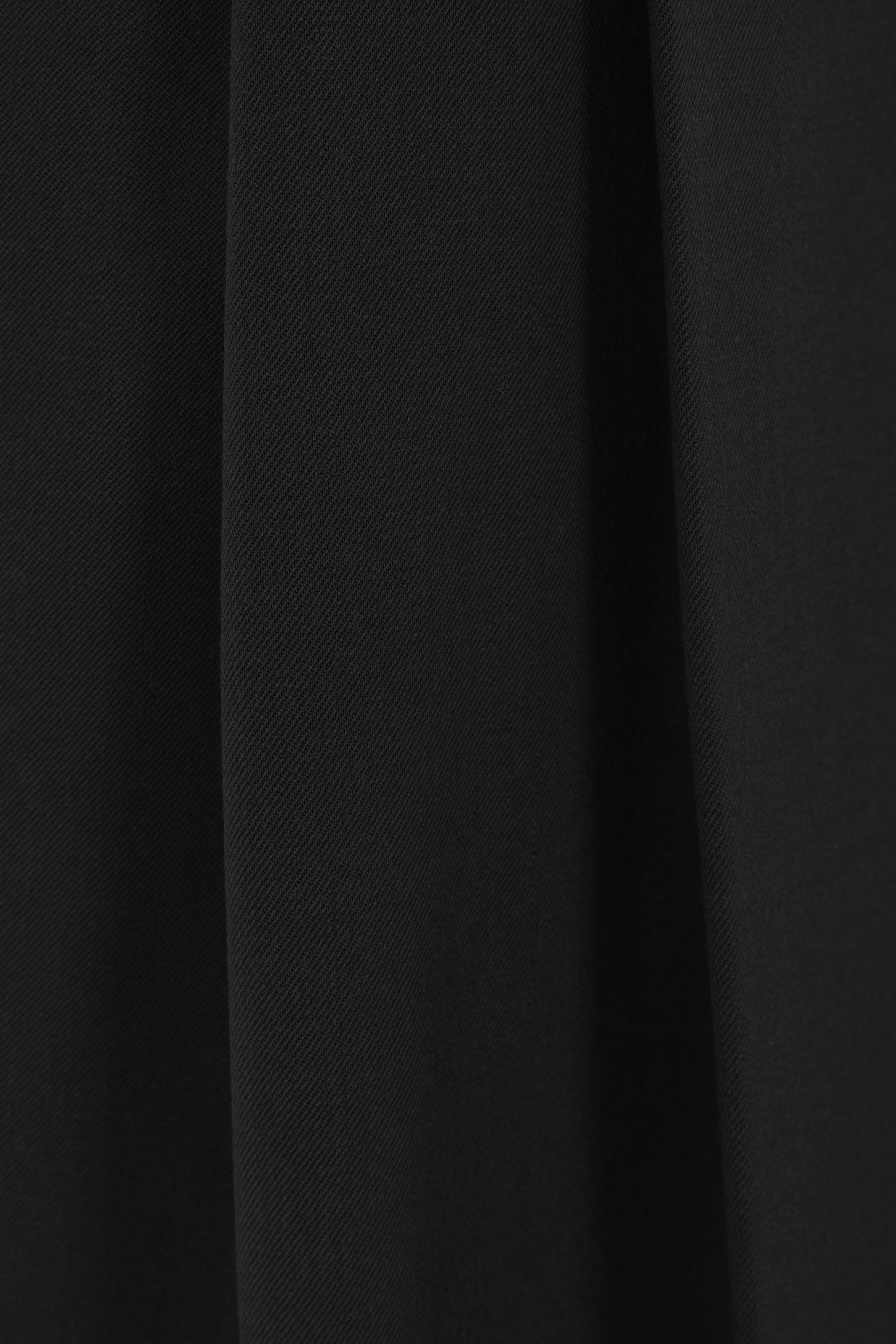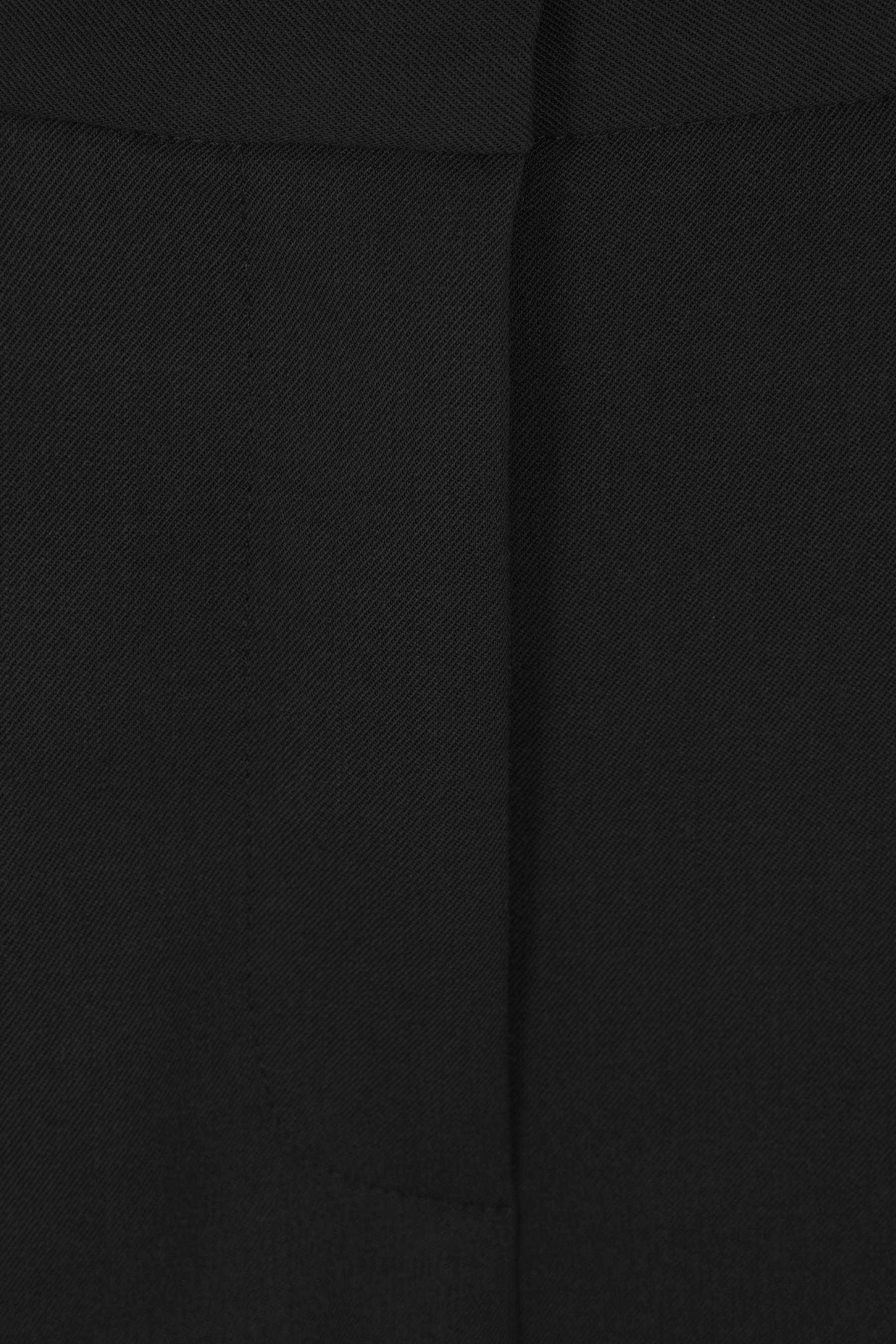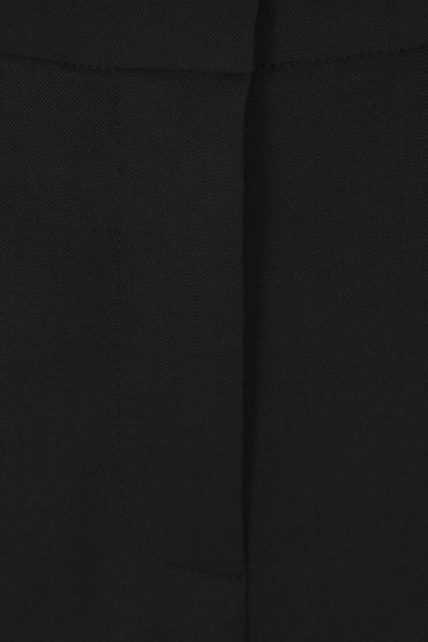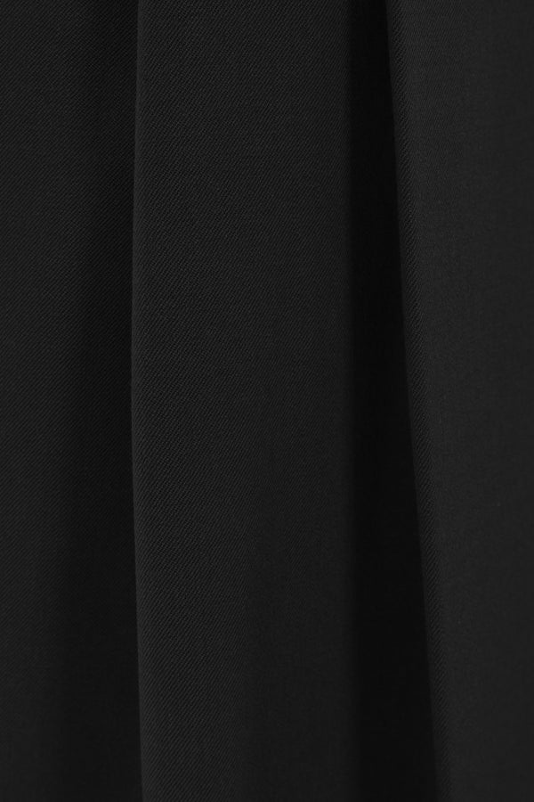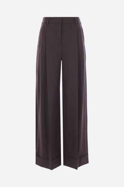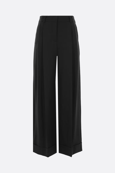 Alberto Biani wide-leg trousers crafted from black stretch wool gabardine. Featuring front hook, button, and zip closure, belt loops, multiple pockets, double pleats, central crease, and cuffed hem. Unlined interior.