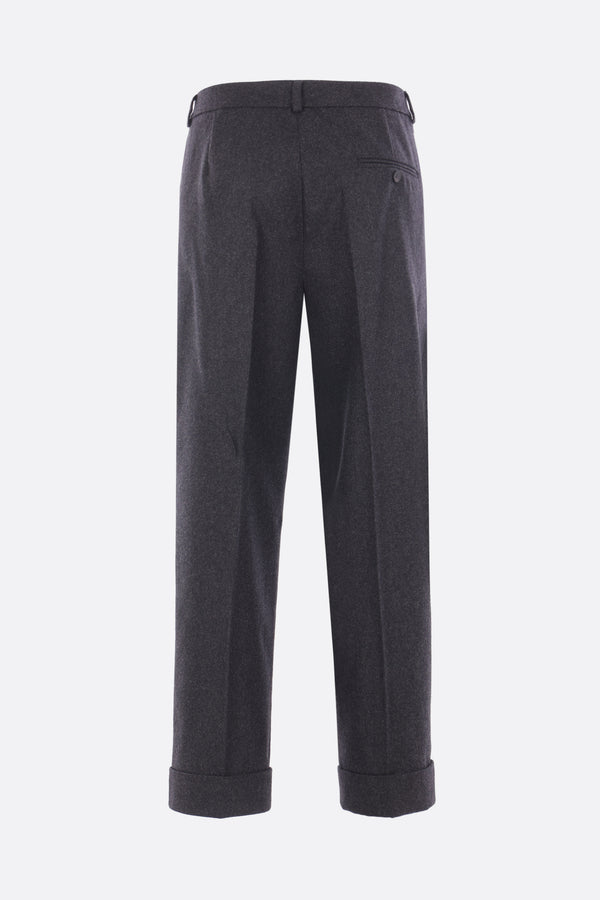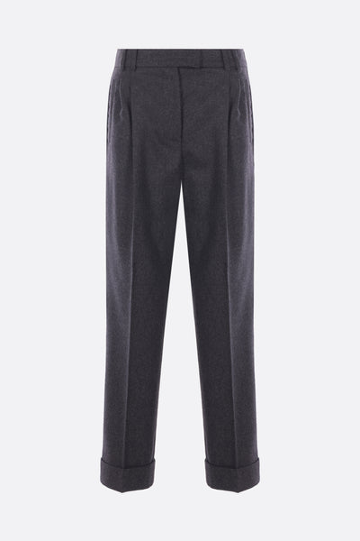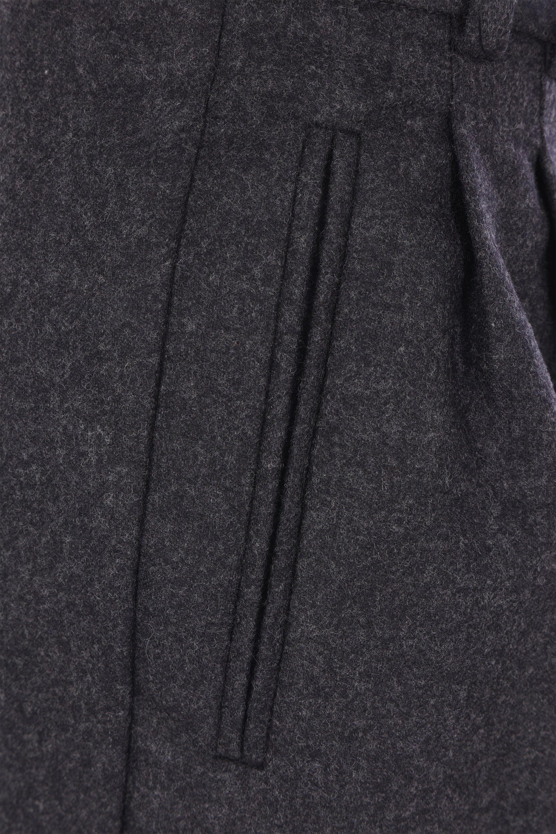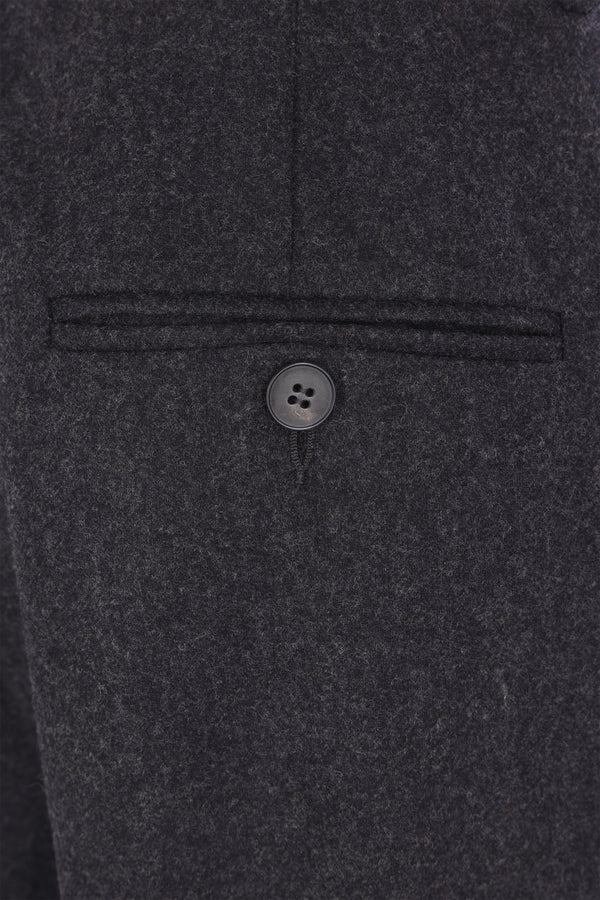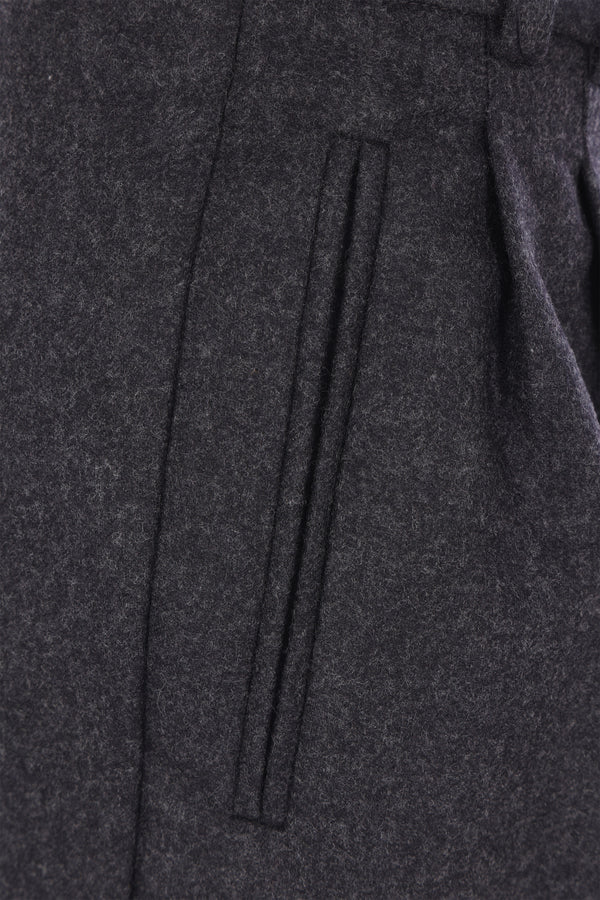 Alberto Biani trousers crafted from dark grey wool flannel. Featuring front hook, button, and zip closure, belt loops, multiple pockets, double pleats, central crease, and cuffed hem. Unlined interior.