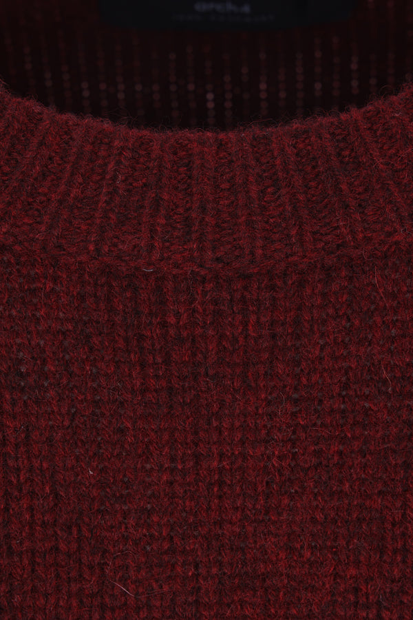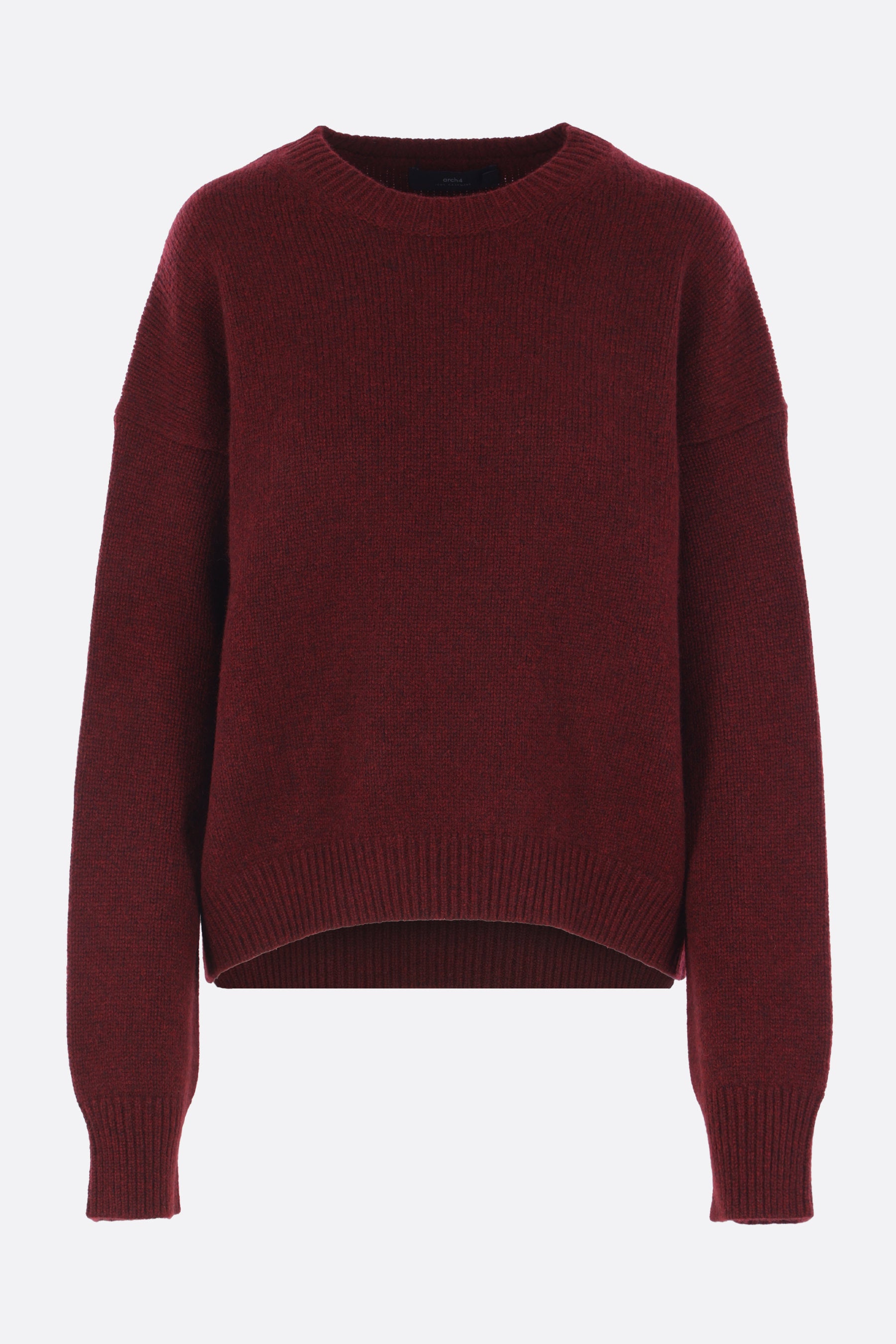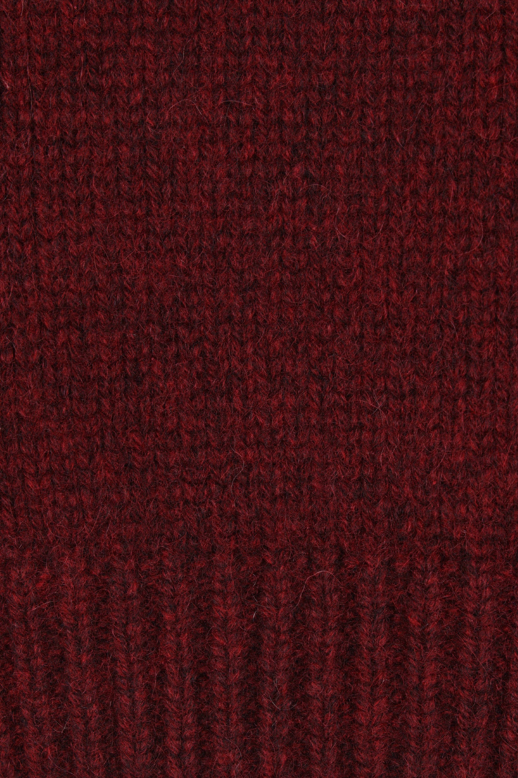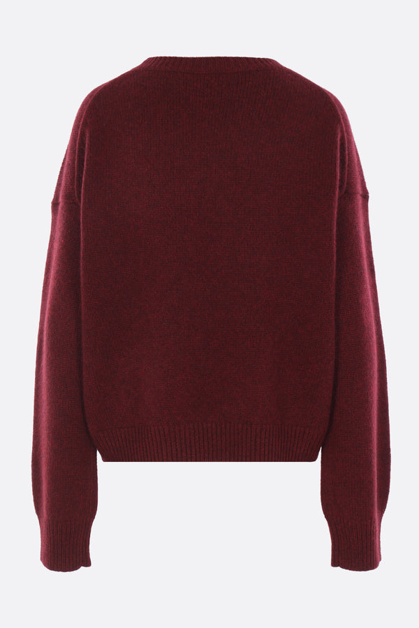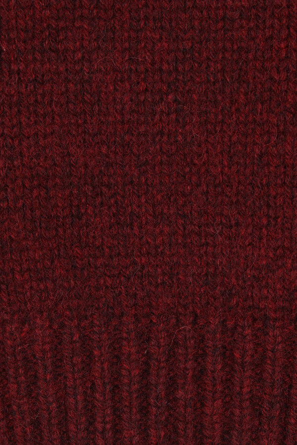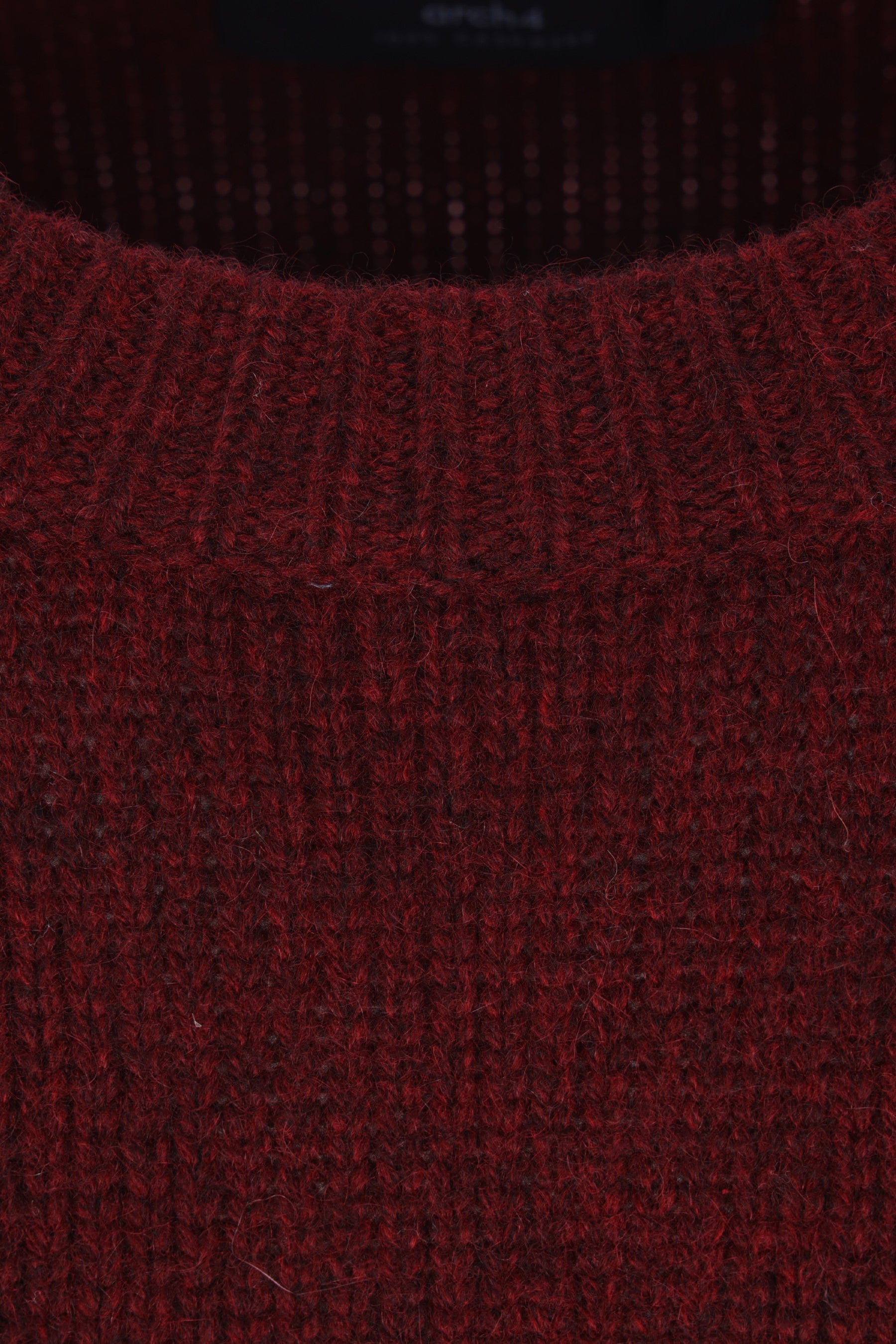 ARCH4 pullover made of burgundy cashmere knit. Features a crew neckline, long sleeves, ribbed edges, and a straight hem.