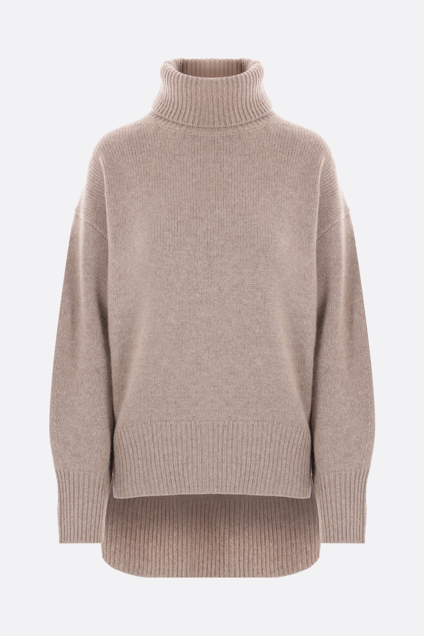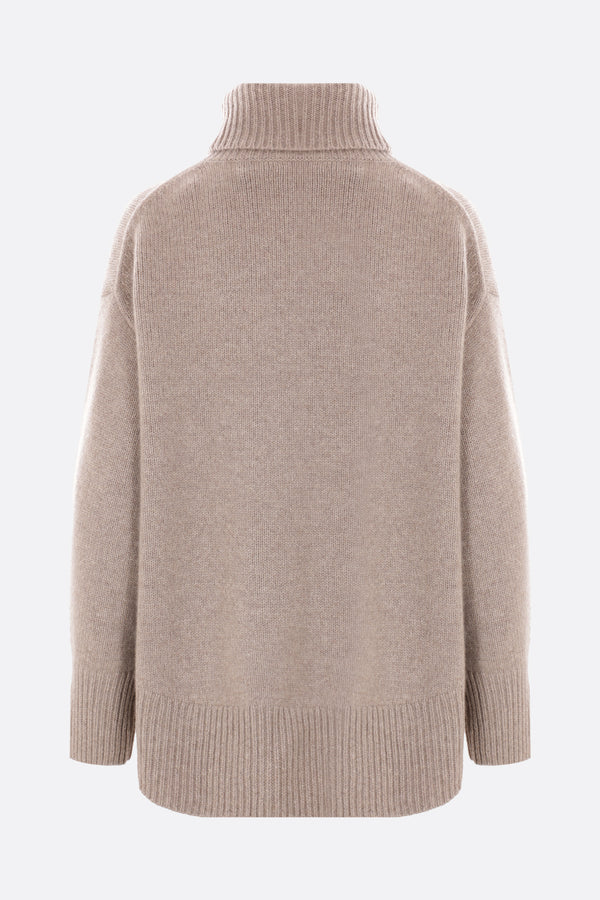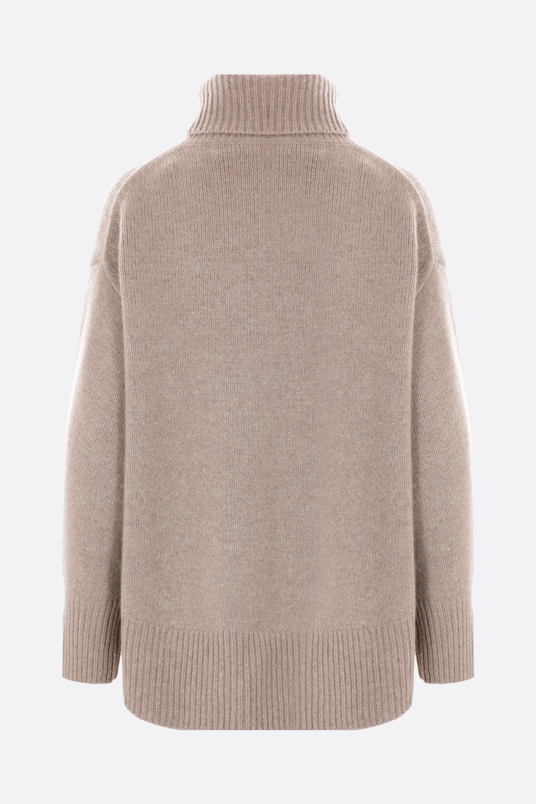 ARCH4 oversized sweater crafted in beige cashmere knit. Featuring high neck with turn-up, long sleeves and ribbed edges.