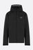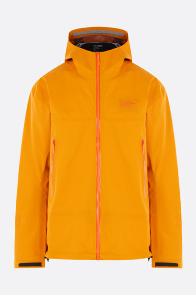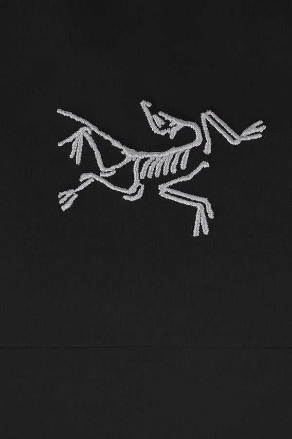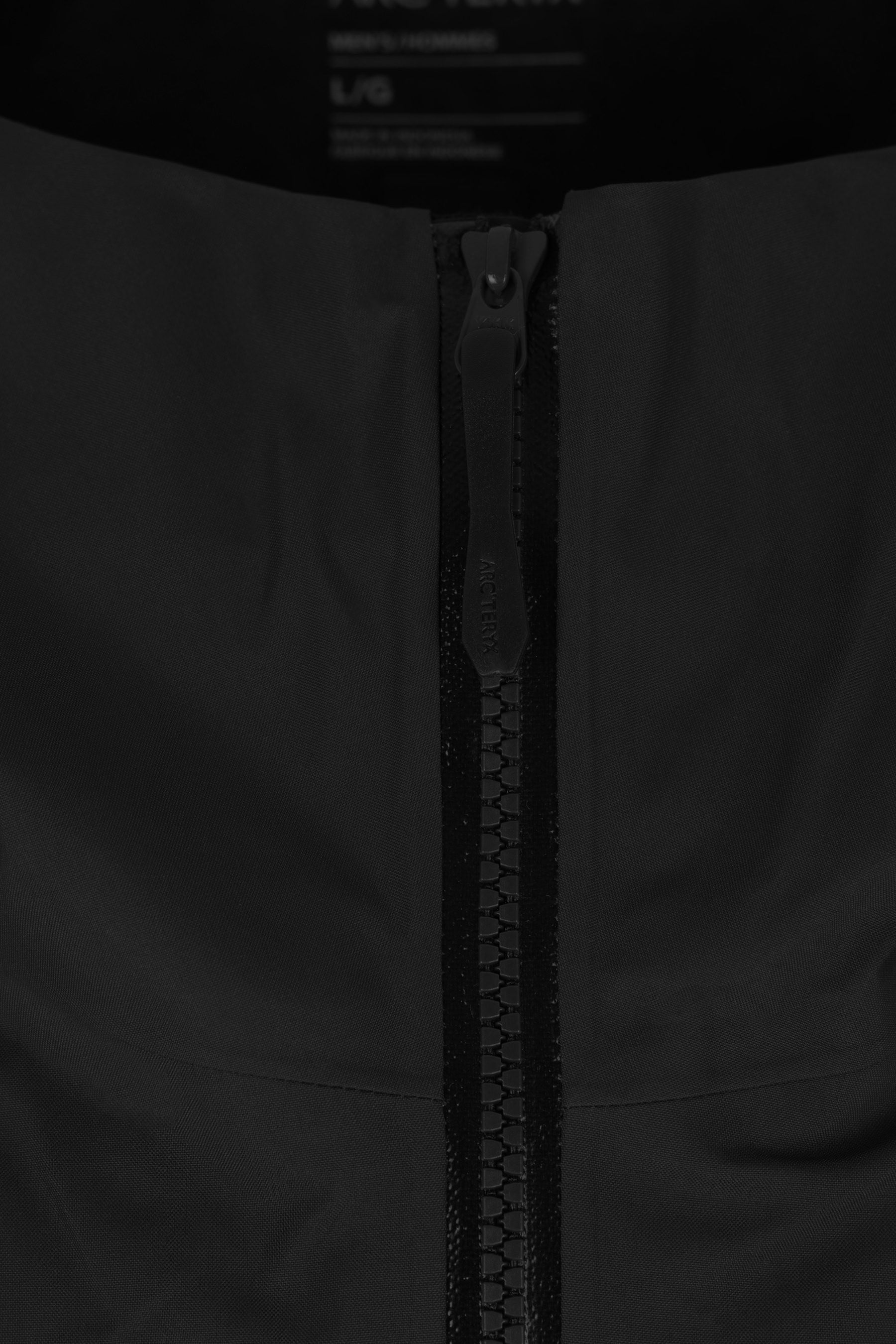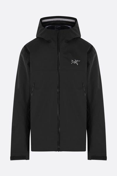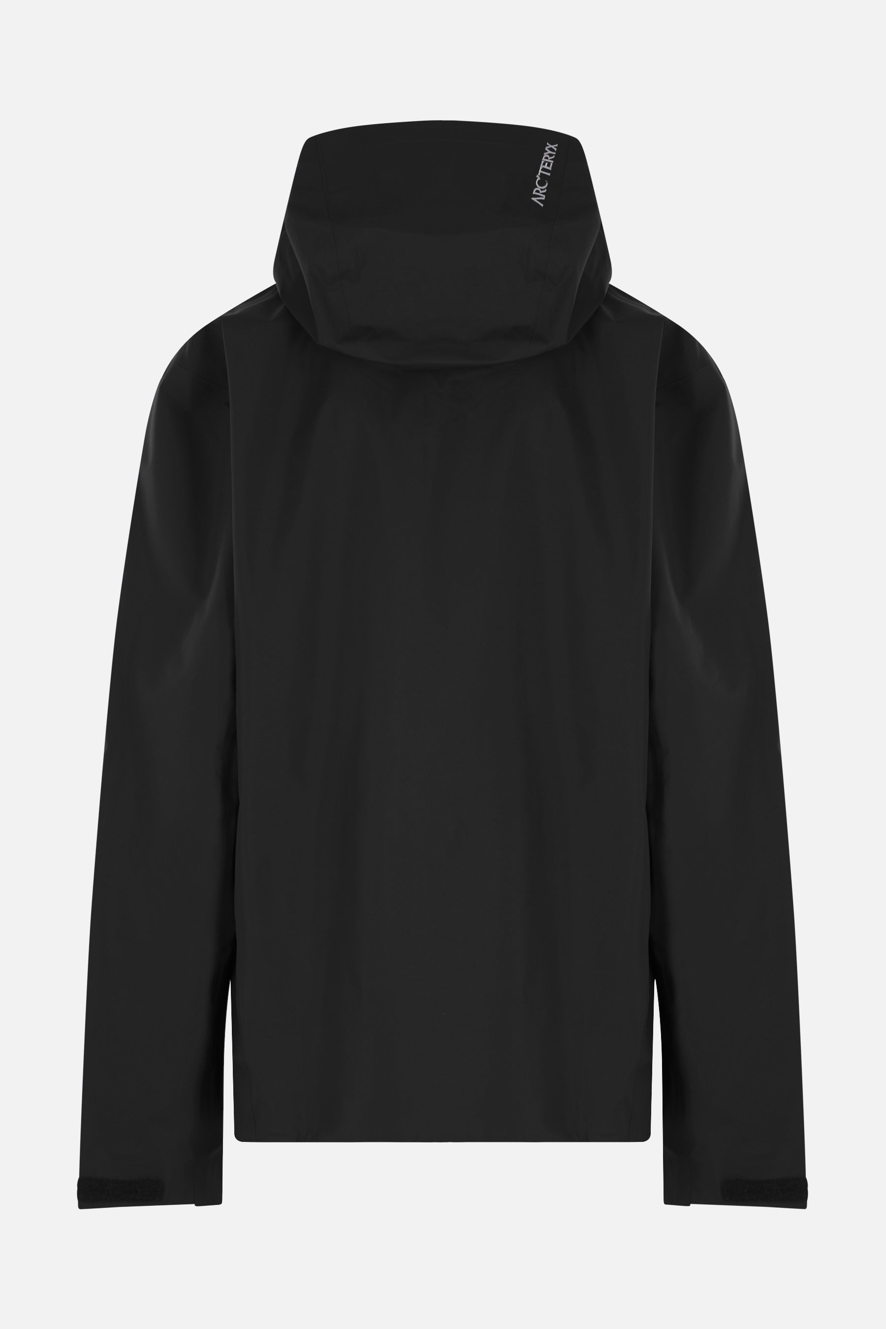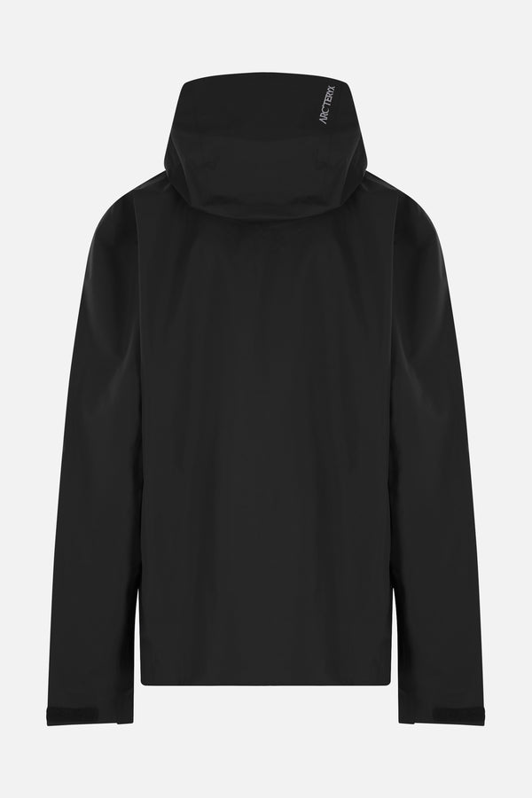 Arc'teryx windreaker made of black GORE-TEX nylon with embroidered logo on the chest. It features a high collar, hood with visor, zip closure, side pockets, long sleeves with adjustable cuffs, and a rounded hem with drawstring. The interior is in a contrasting color.