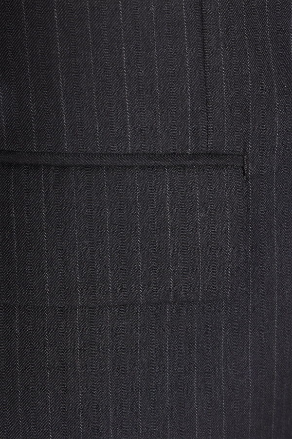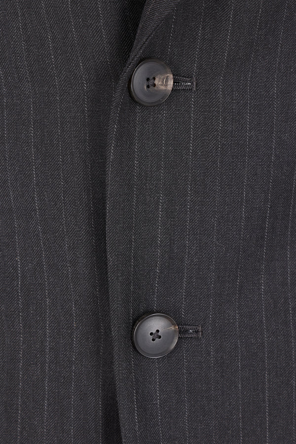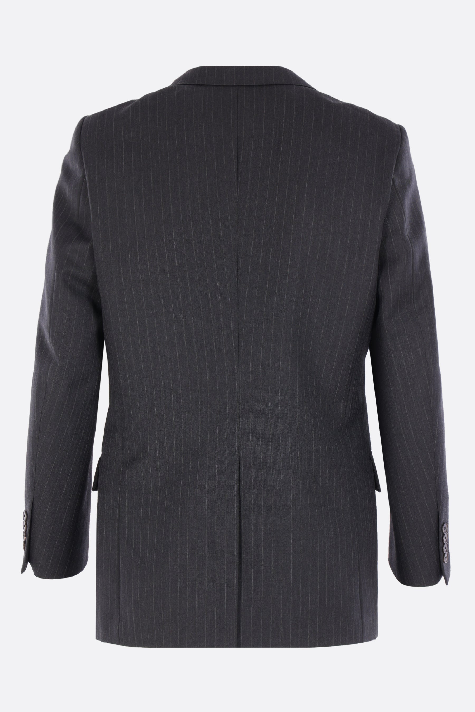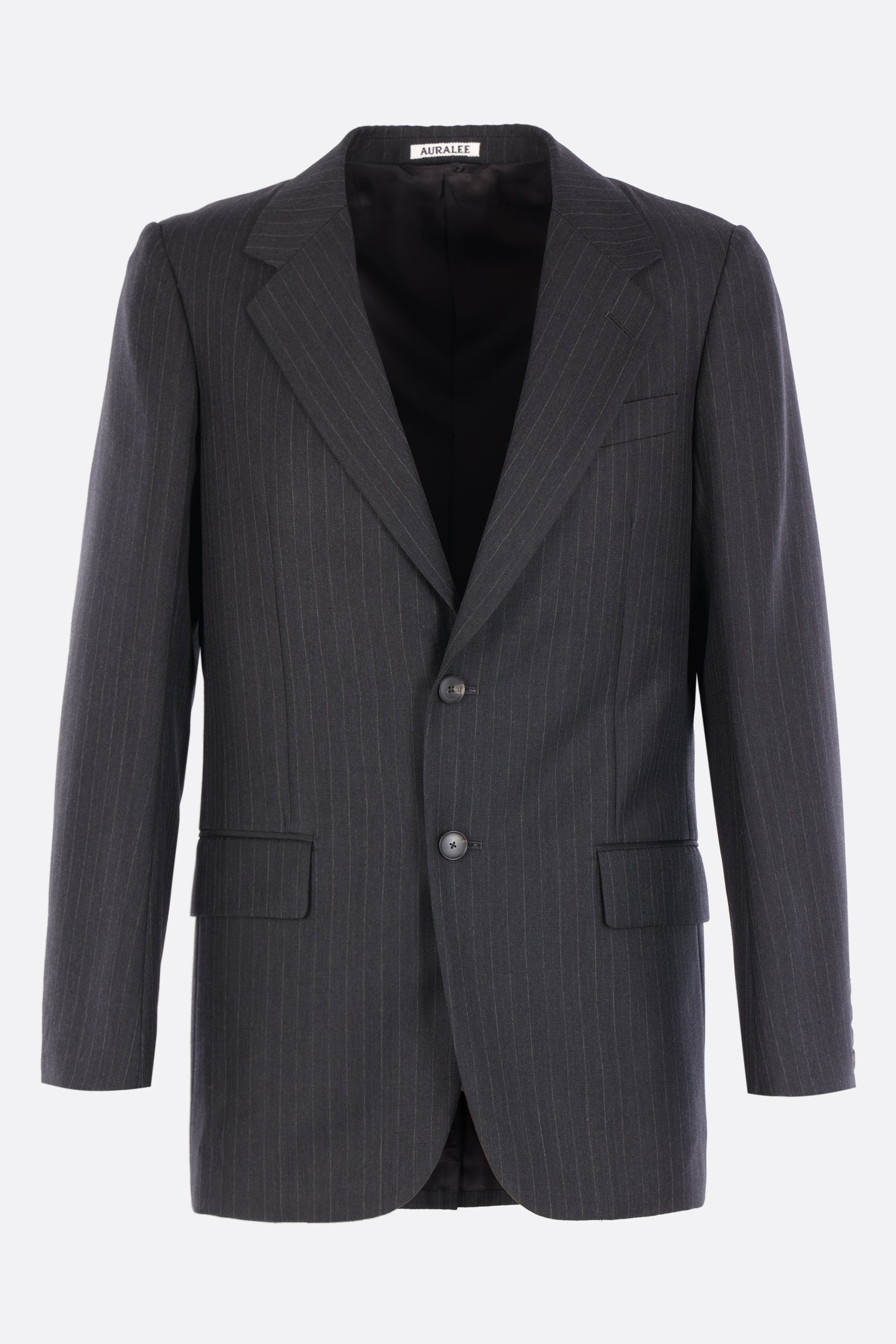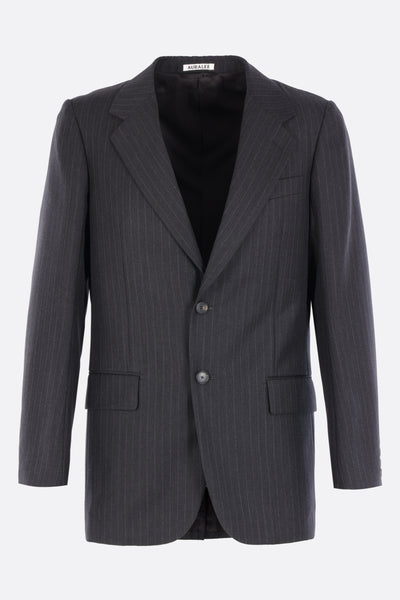 Auralee single-breasted jacket crafted from dark gray and blue pinstripe wool. Featuring a classic notch lapel, front button closure, multiple pockets, structured shoulders, long sleeves with buttoned cuffs, and a central back vent. Fully lined interior.