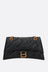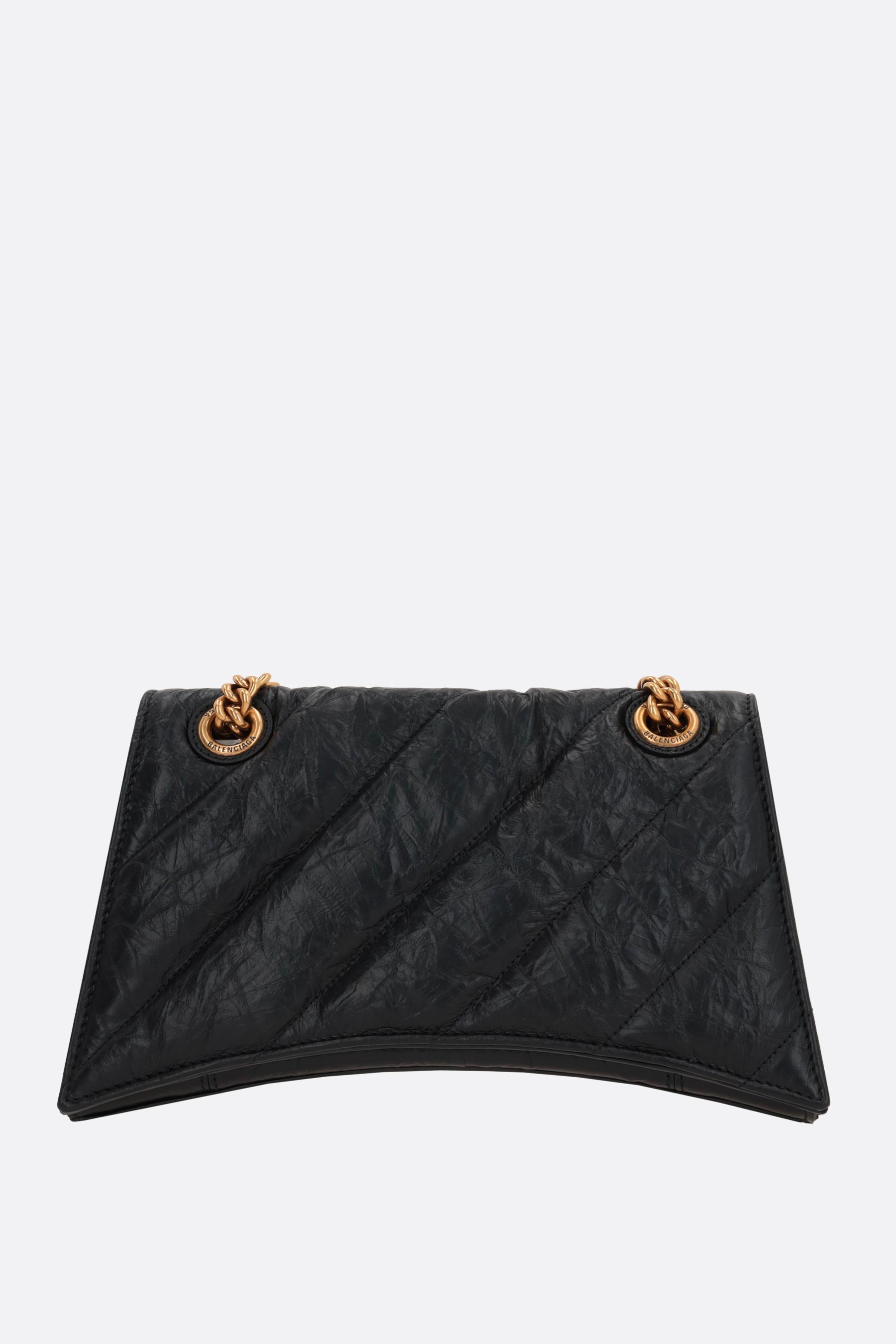 Balenciaga's shoulder bag crafted in black quilted leather. It features antique gold-tone hardware, magnetic button closure on flap and two-way adjustable chain shoulder strap. Tone-on-tone leather-lined interior with three separated compartments, flat and zip pockets. The design is completed by the metal B logo on flap.