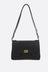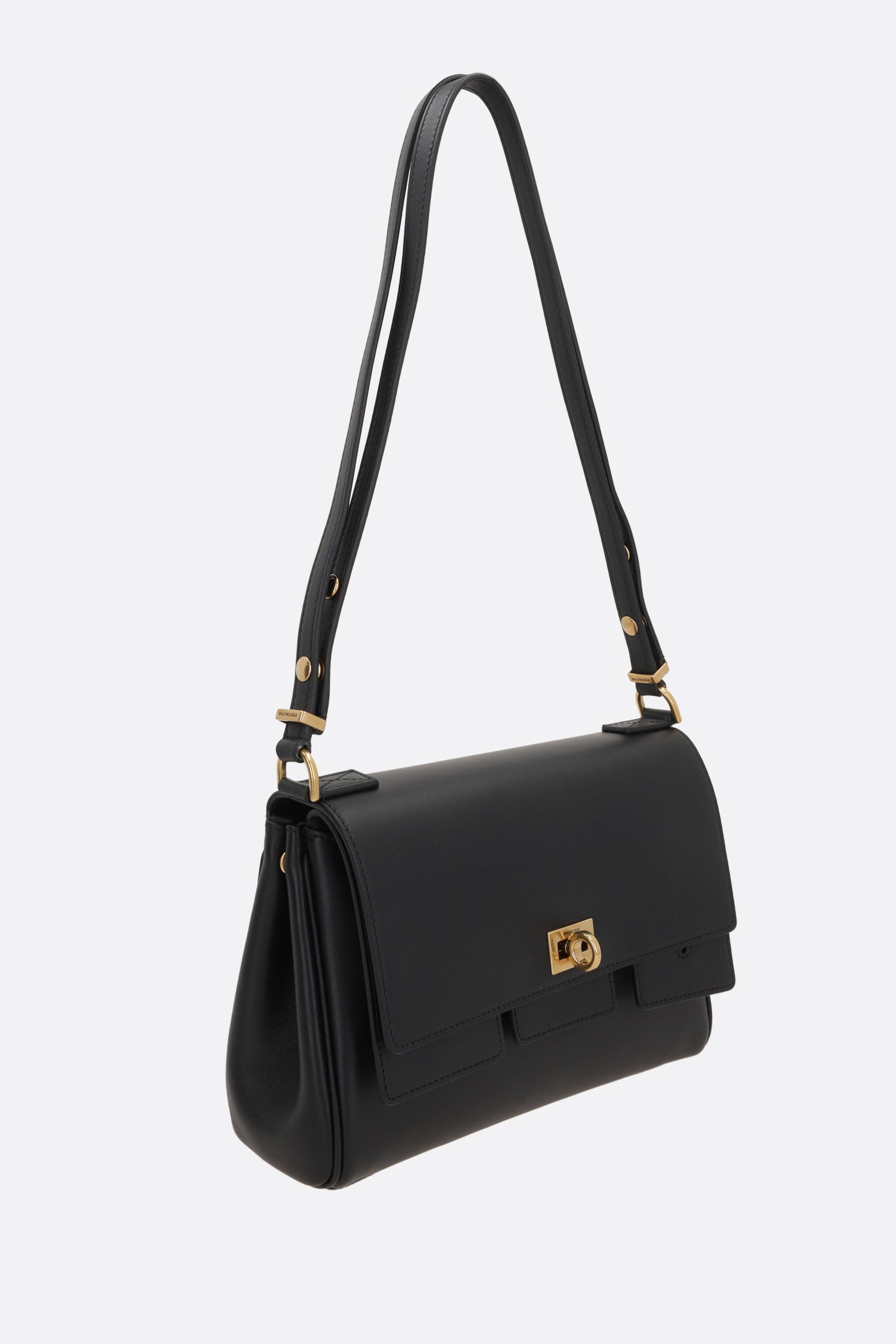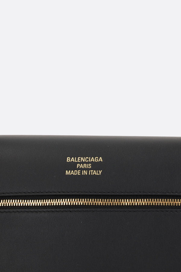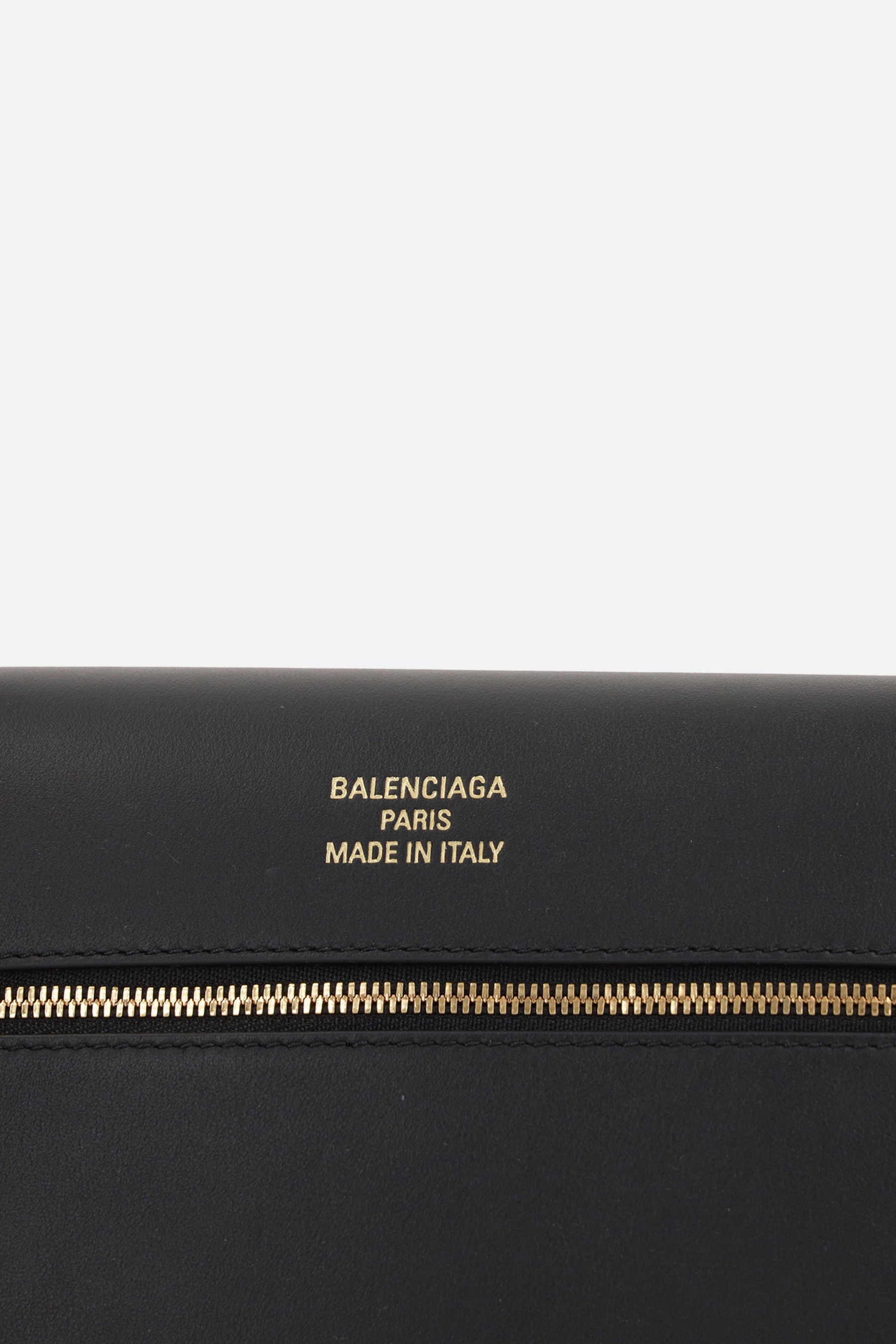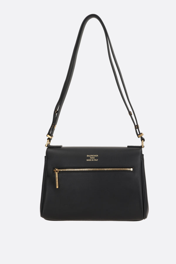 Balenciaga shoulder bag crafted from smooth black leather with embossed logo lettering on the back. Featuring antique gold-tone metal hardware, turn-lock closure, side snap buttons to adjust the width, and an adjustable shoulder strap. The black leather-lined interior includes two card slots. The design is completed with a large front pocket with decorative flaps and a back zip pocket.